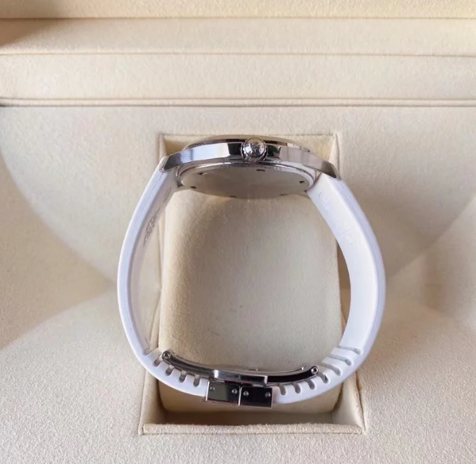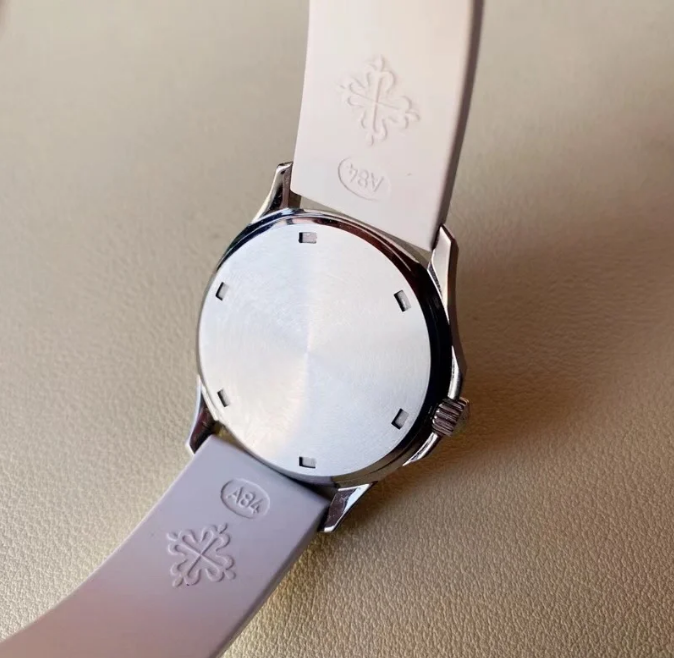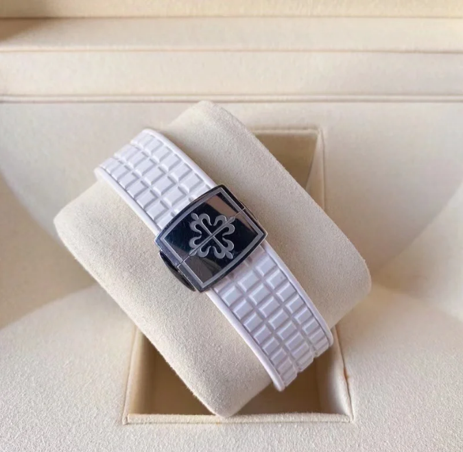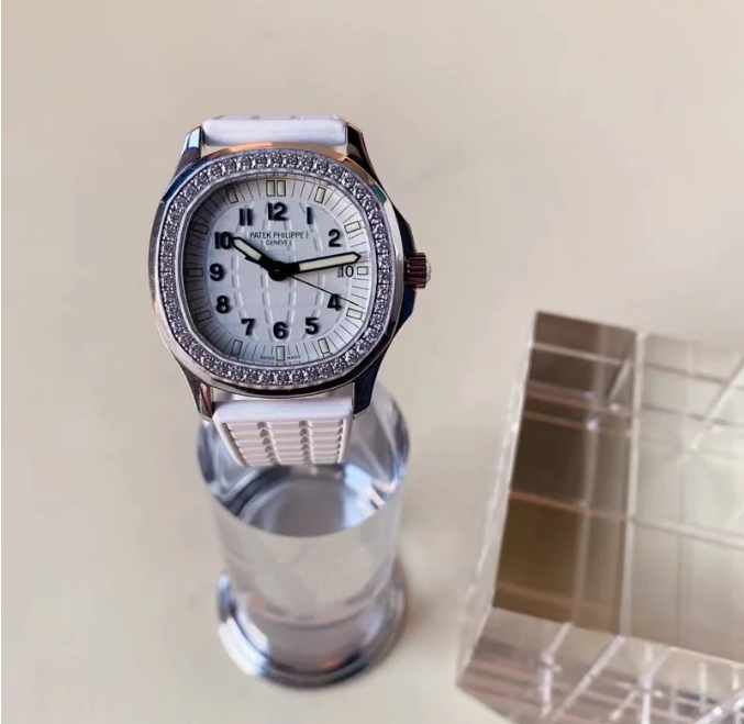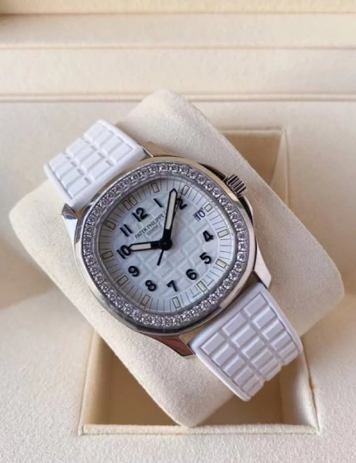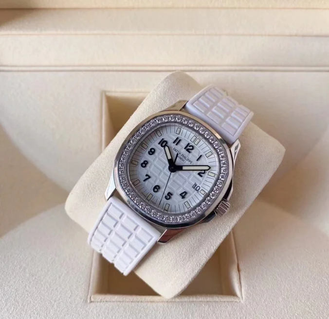 Stainless steel case with a tropical composite strap bracelet. 46 diamonds (~1 ct) bezel. Glitter white embossed dial with black hands and Arabic numeral hour markers. Minute markers around the outer rim. Dial Type: Analog. Date display at the 4 o'clock position. Patek Philippe Calibre E23-250 S C quartz movement. Scratch resistant sapphire crystal. Screw down crown. Case size: 35.6 mm. Oval case shape. Aquanaut fold-over clasp. Water resistant at 120 meters / 400 feet. Functions: date, hour, minute, second. Luxury watch style. Watch label: Swiss Made. Patek Philippe Aquanaut Diamond Ladies Watch