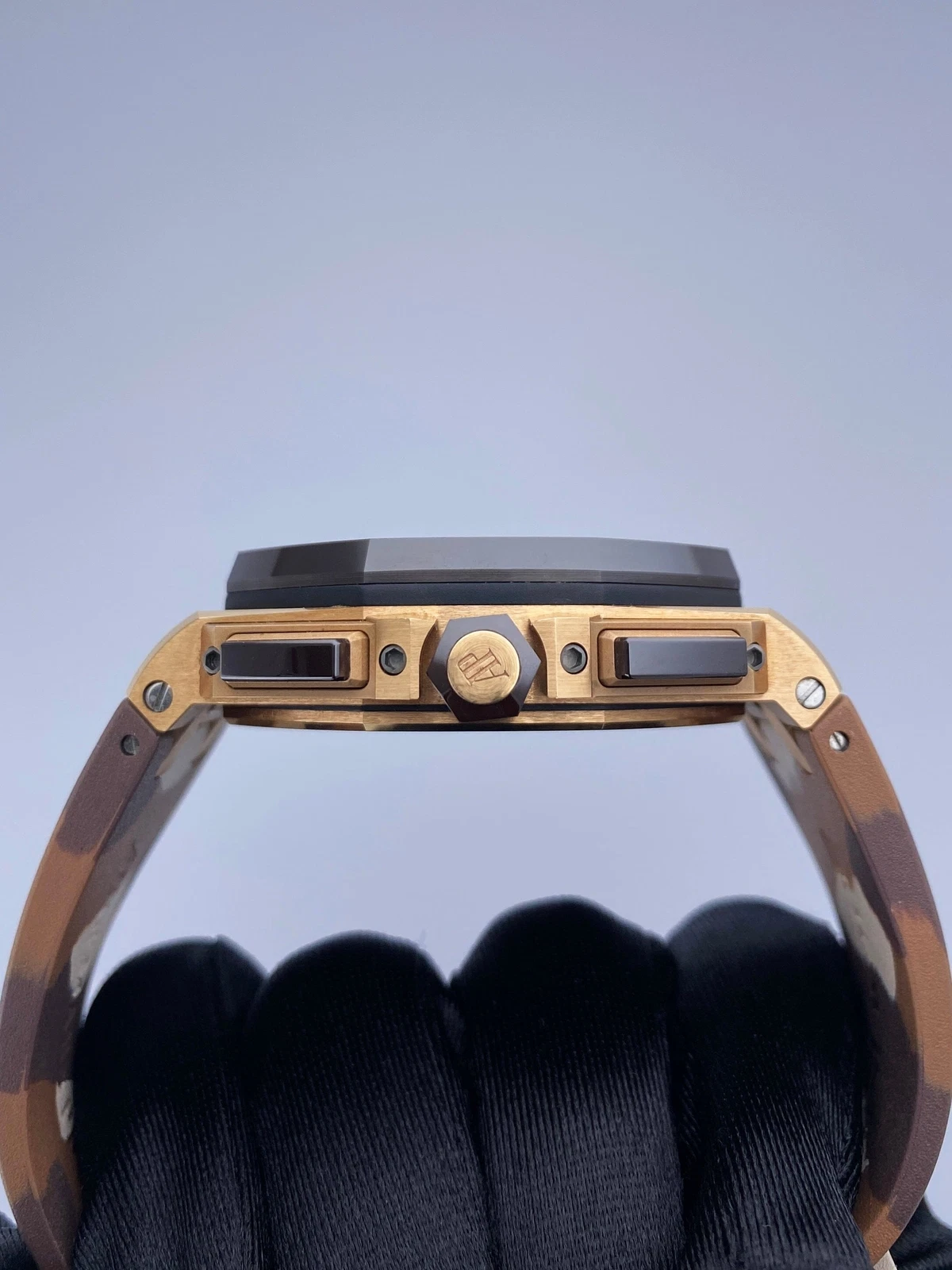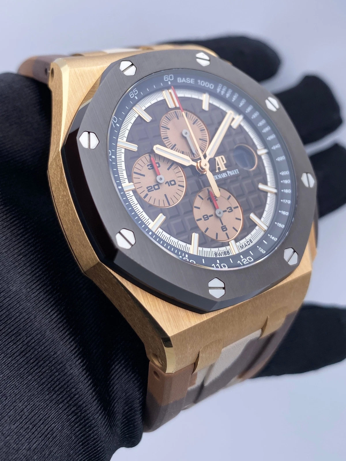 Brown dial with “Méga Tapisserie” pattern, pink gold-toned counters, rhodium-toned external zone, pink gold applied hour-markers and Royal Oak hands, black inner bezel.