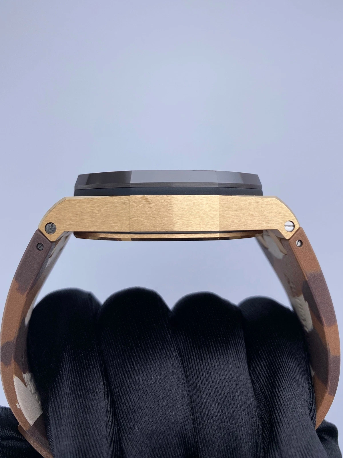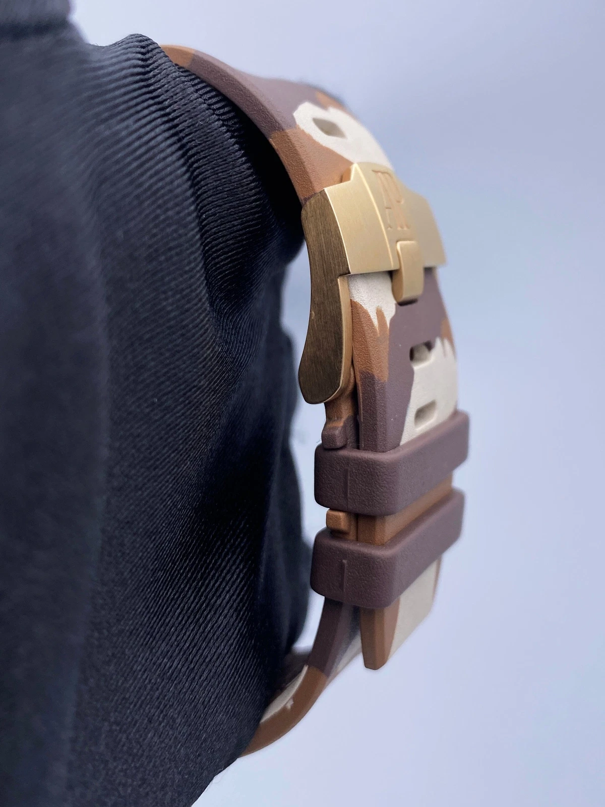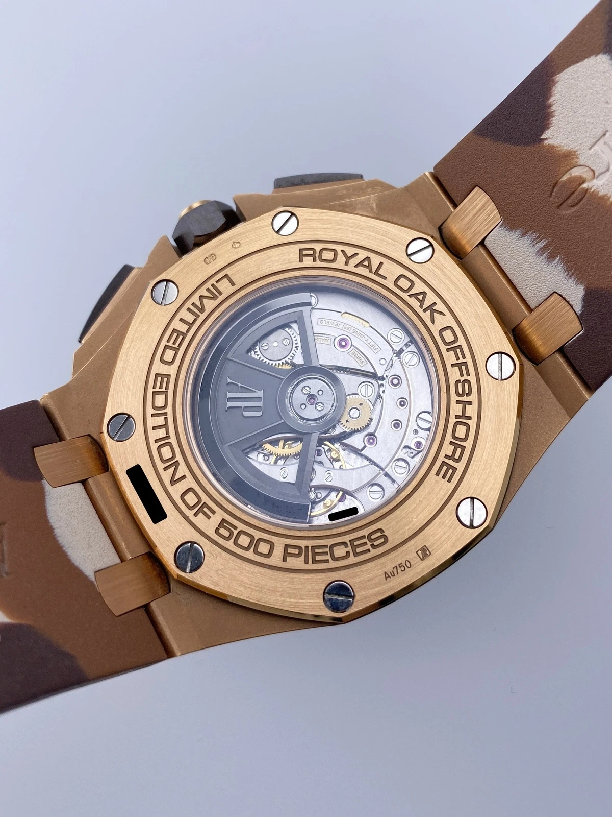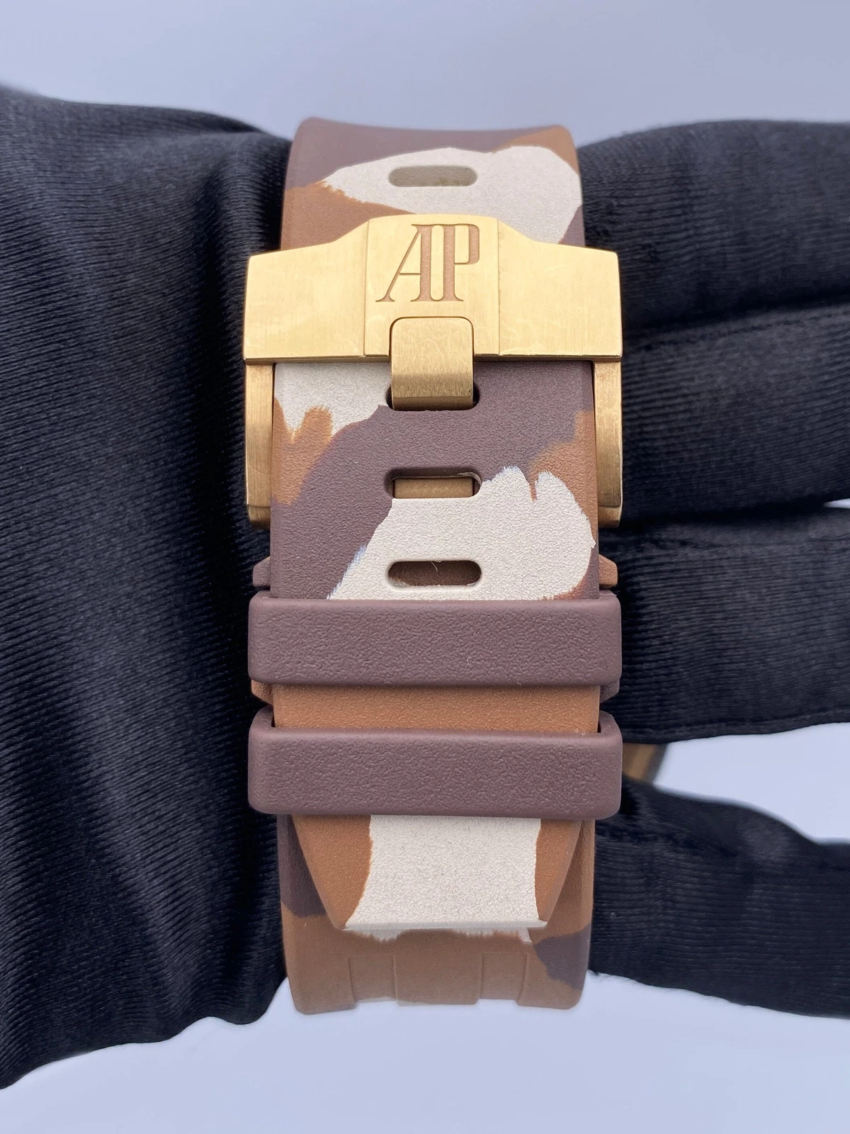 Brown “Camouflage” rubber strap with 18-carat pink gold pin buckle. Additional brown rubber strap.