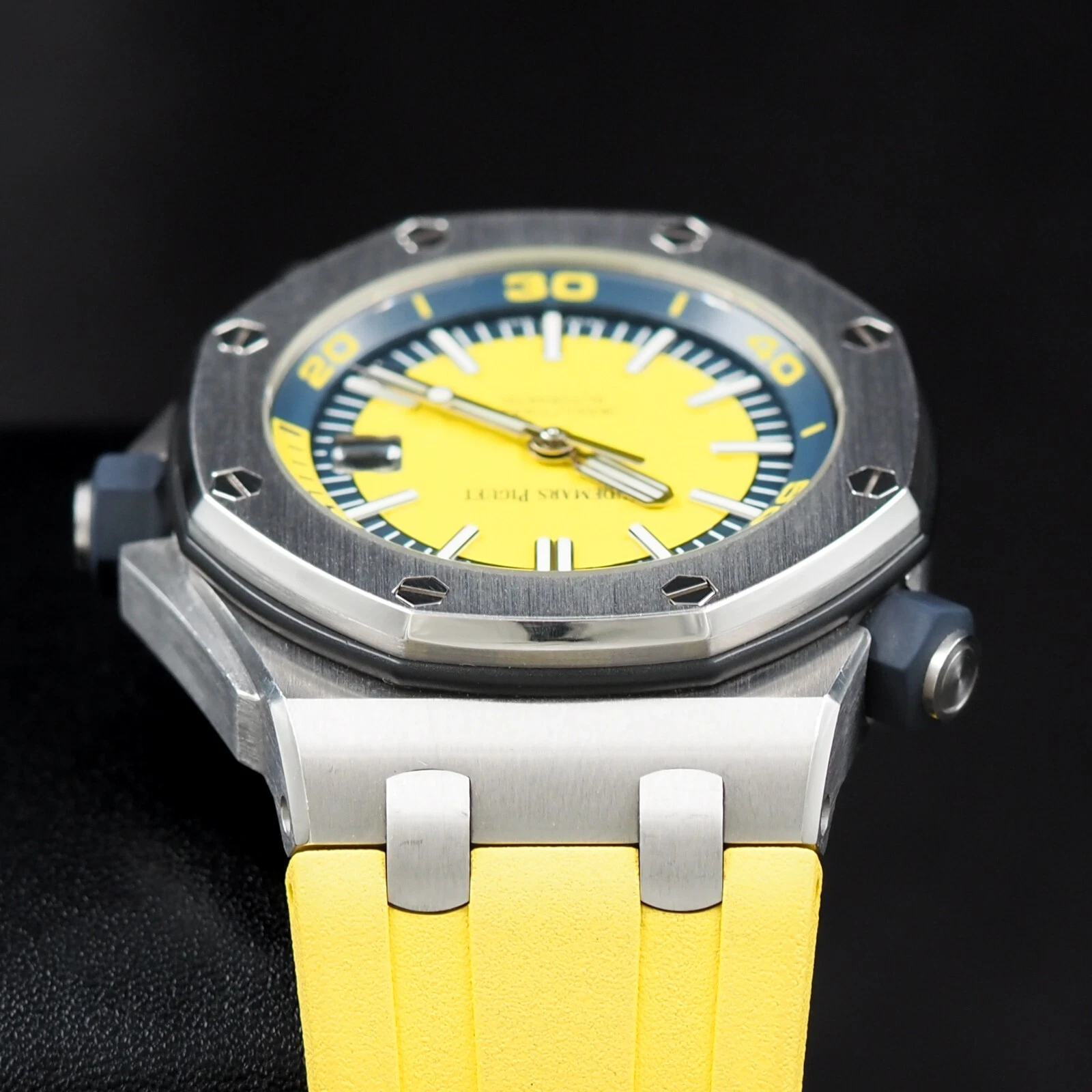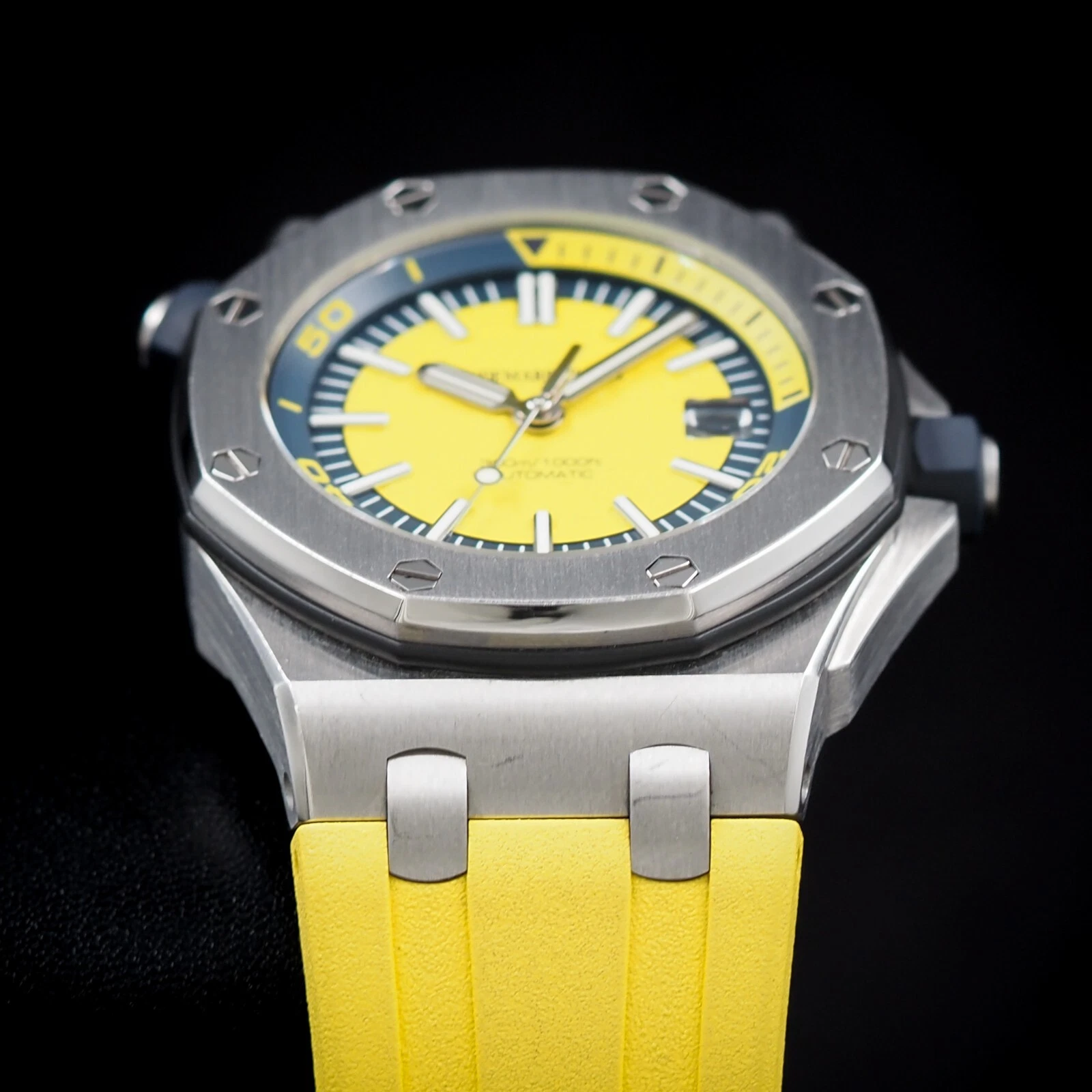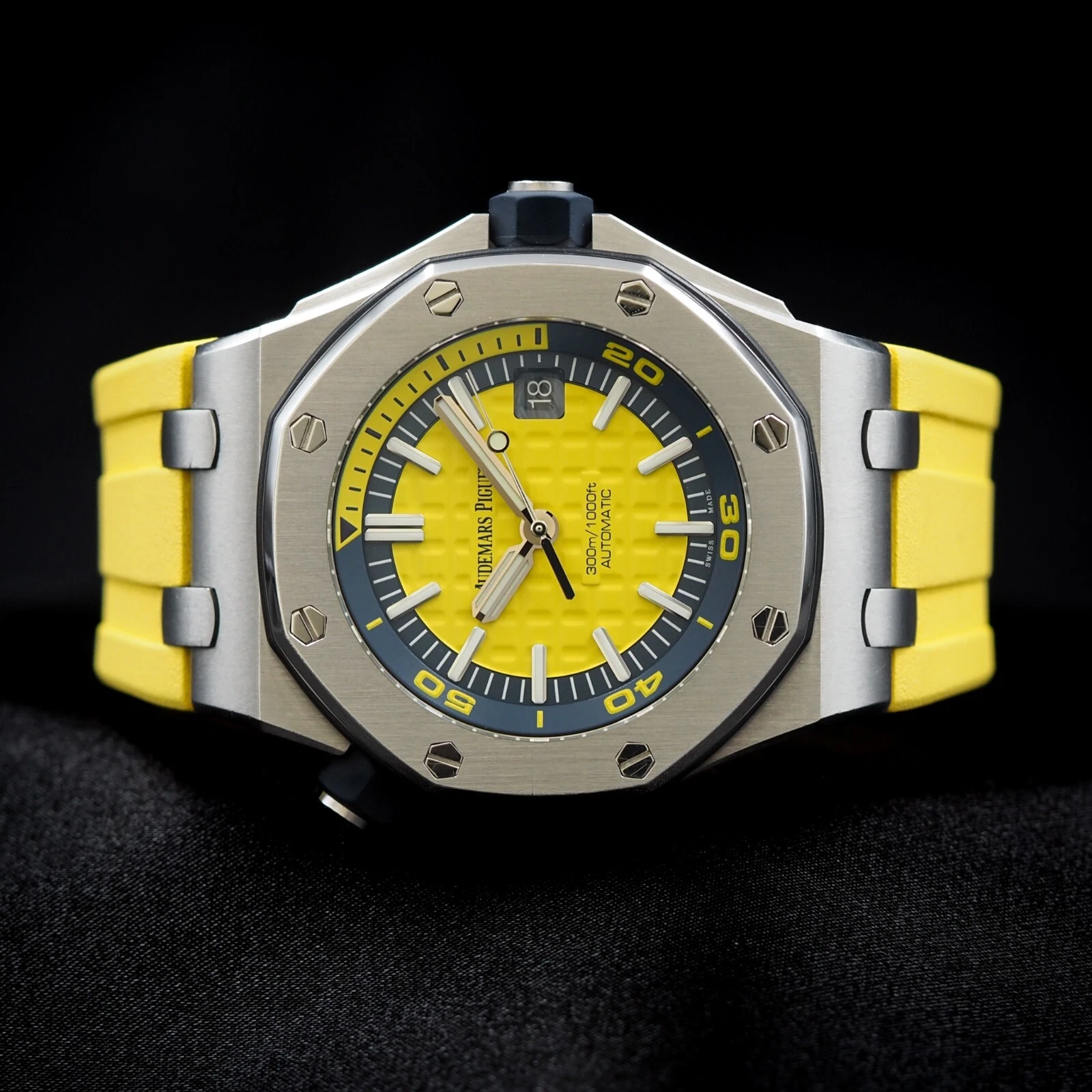 Yellow dial with “Méga Tapisserie” pattern, white gold applied hour-markers and Royal Oak hands with luminescent coating, blue rotating inner bezel with diving scale and zone from 60 to 15 minutes in yellow.