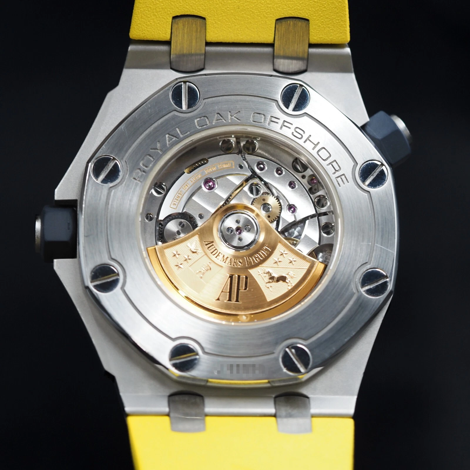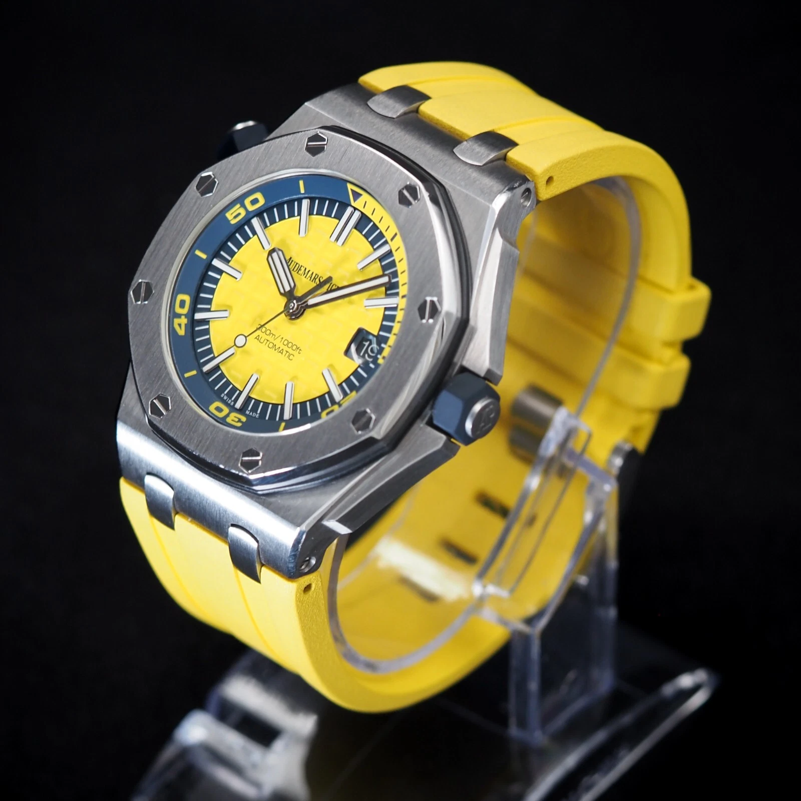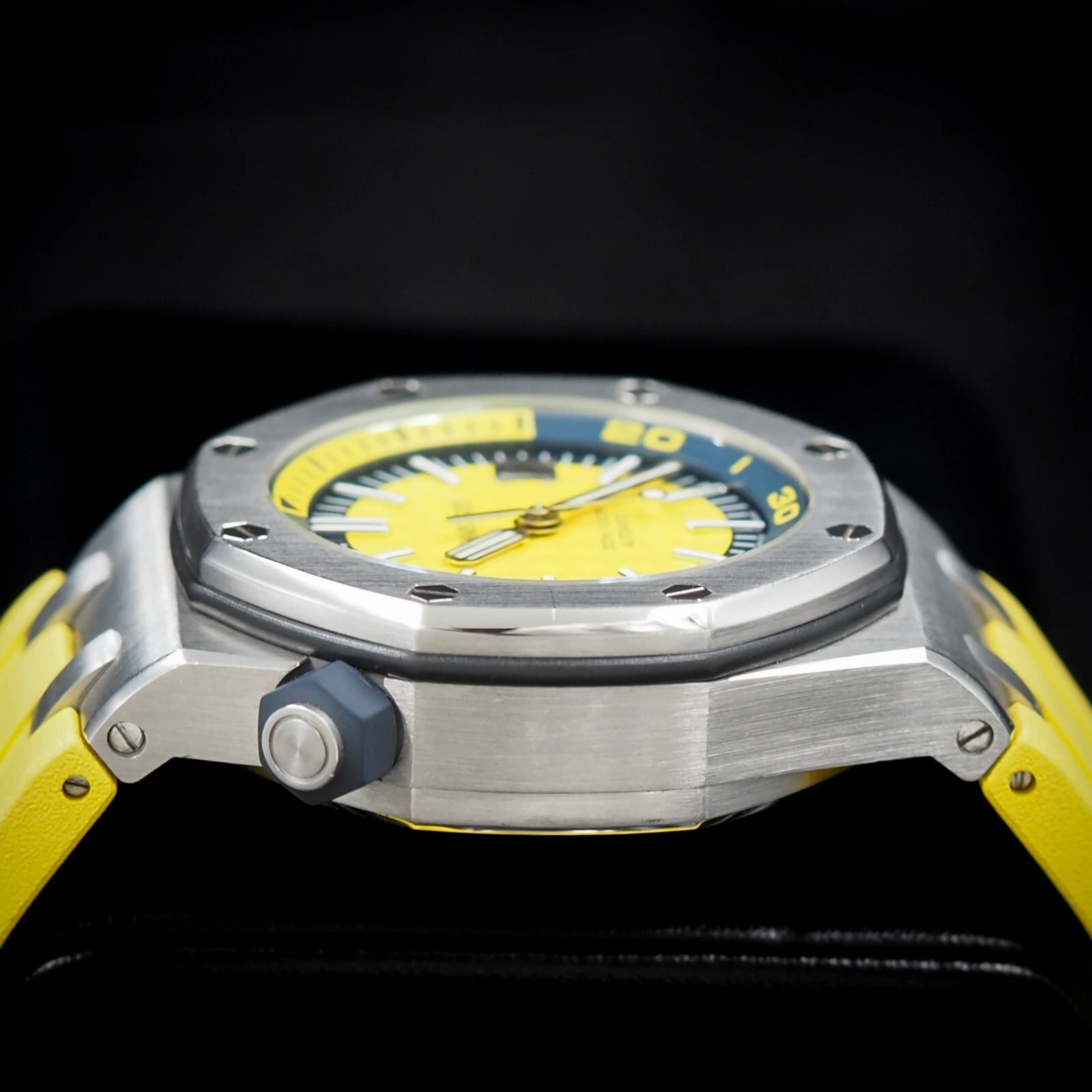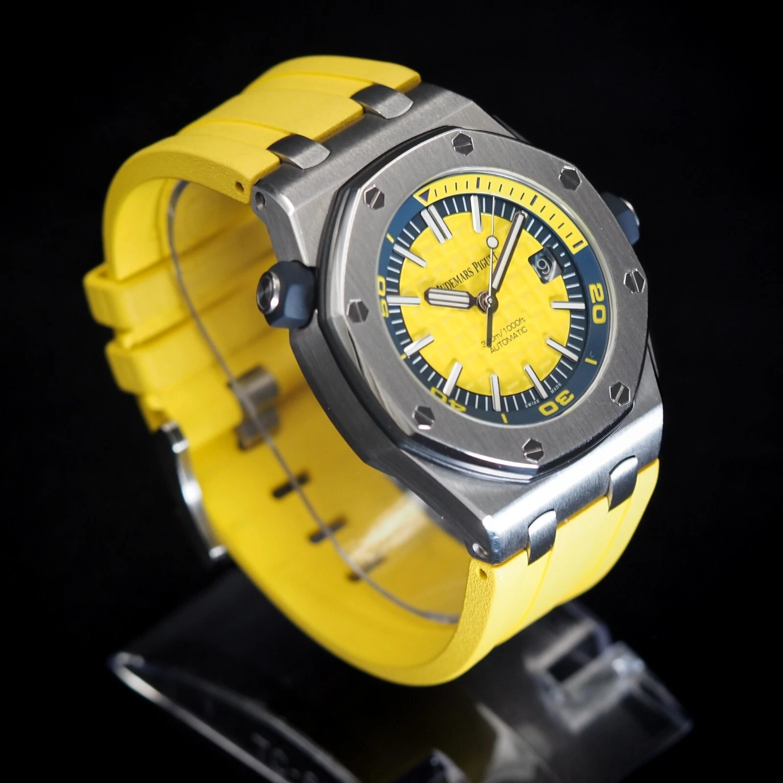 Yellow dial with “Méga Tapisserie” pattern, white gold applied hour-markers and Royal Oak hands with luminescent coating, blue rotating inner bezel with diving scale and zone from 60 to 15 minutes in yellow.