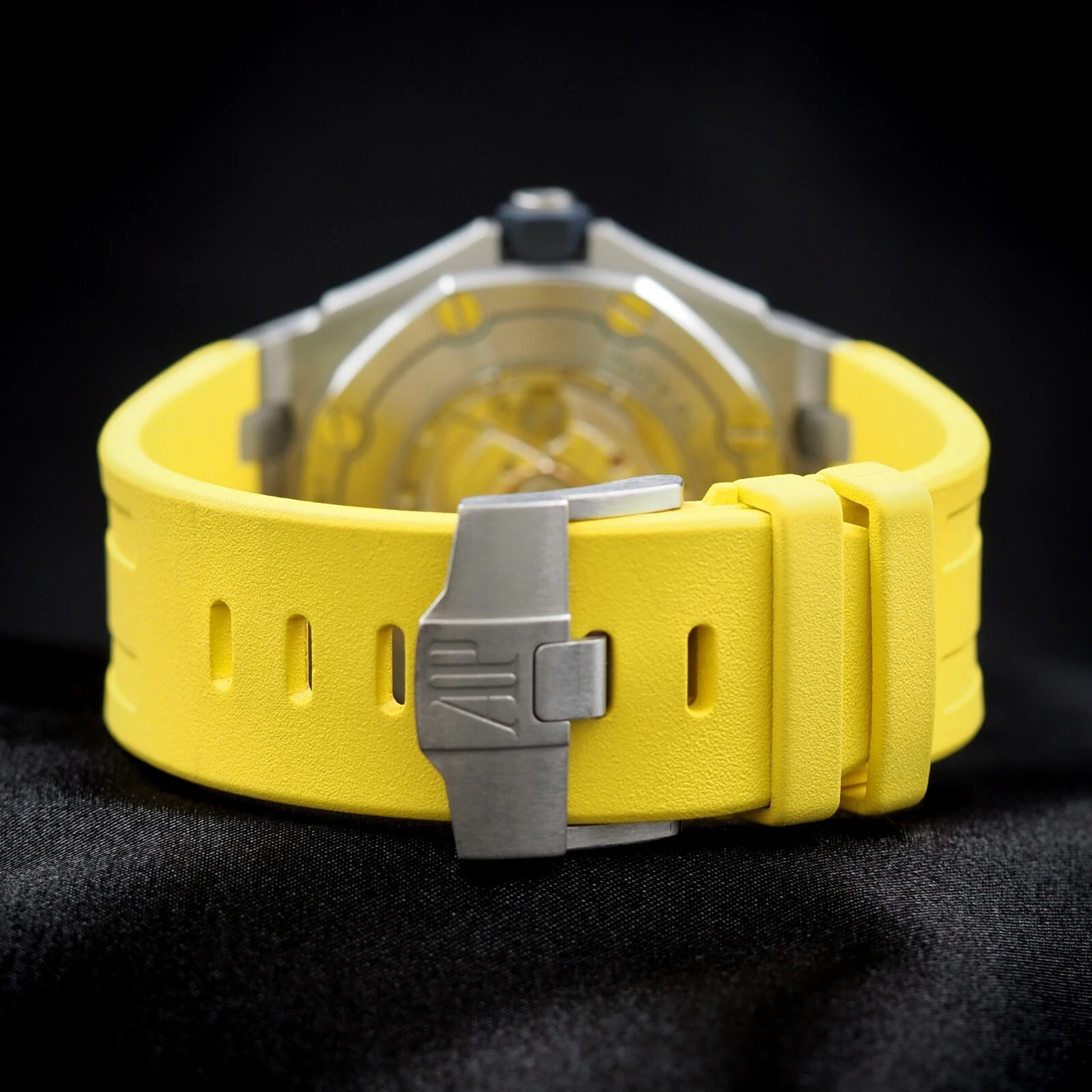 Yellow rubber strap with stainless steel pin buckle. Additional blue rubber strap.