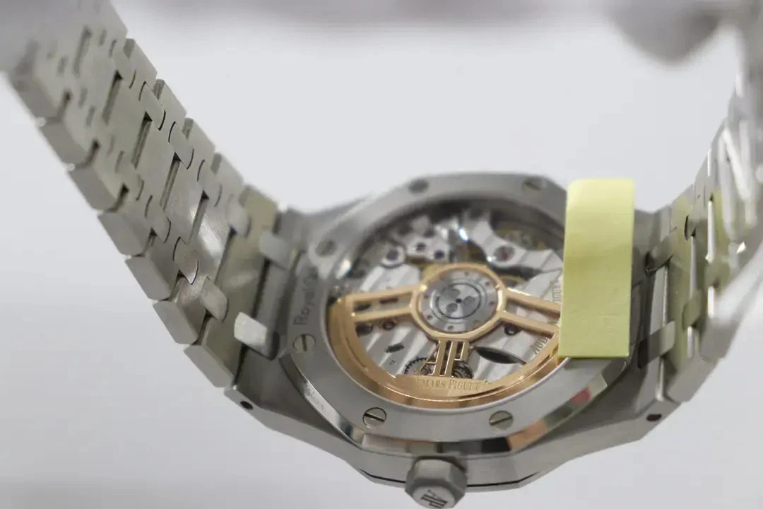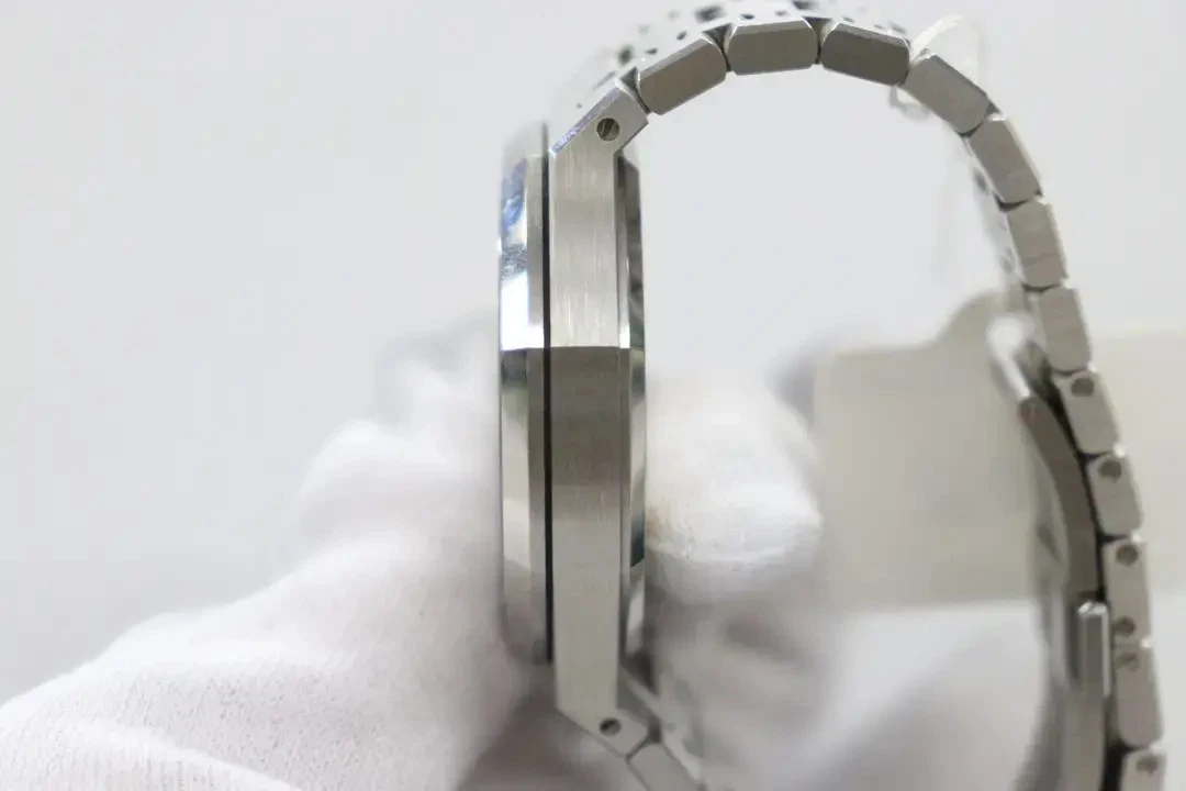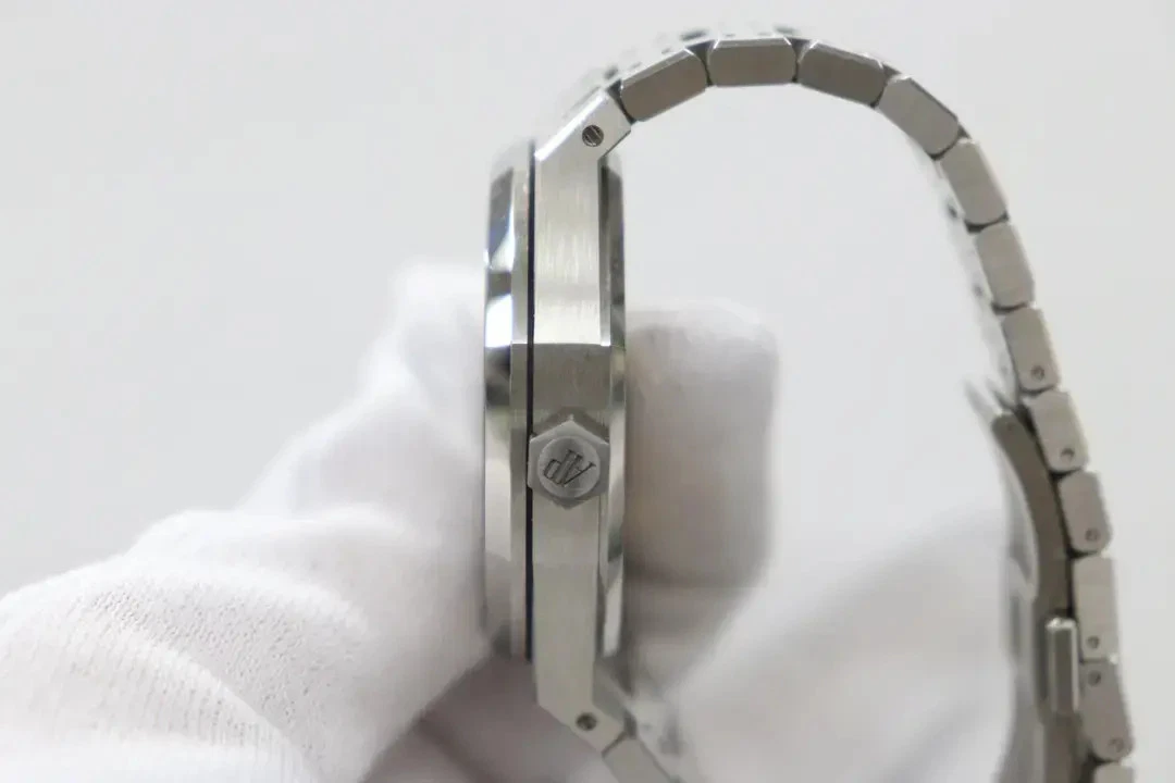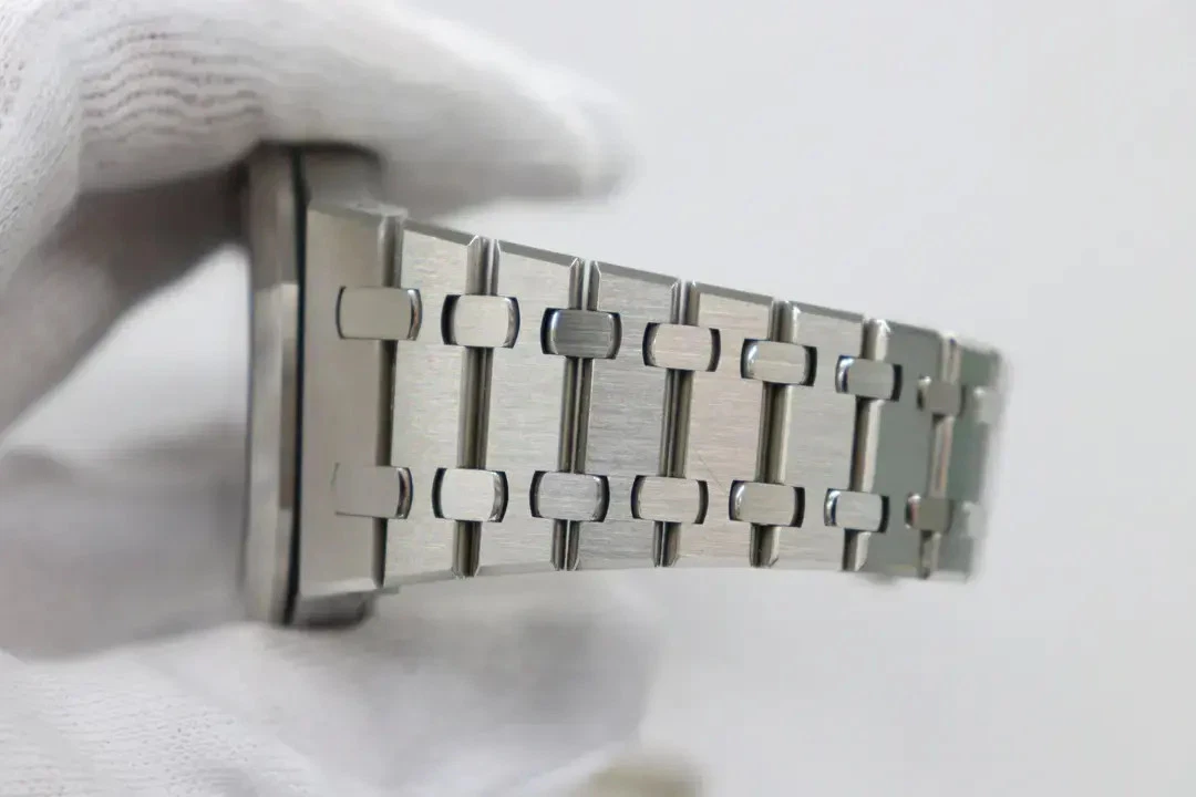 Grey dial with “Grande Tapisserie” pattern, white gold applied hour-markers and Royal Oak hands with luminescent coating.