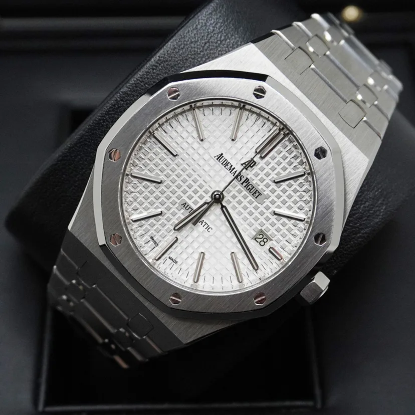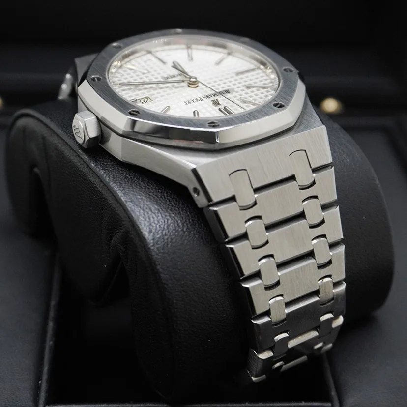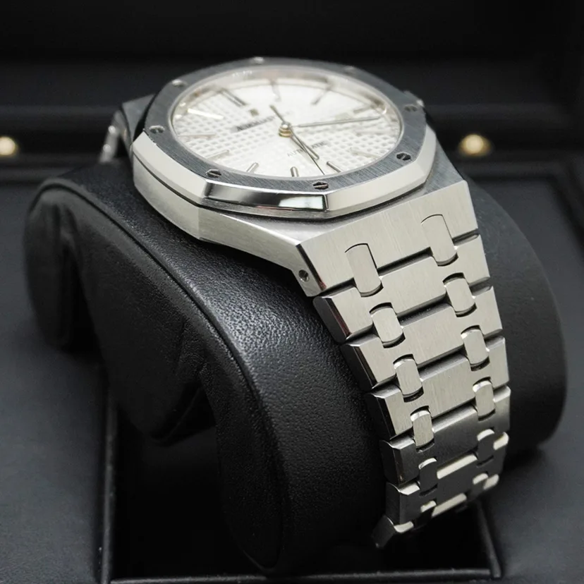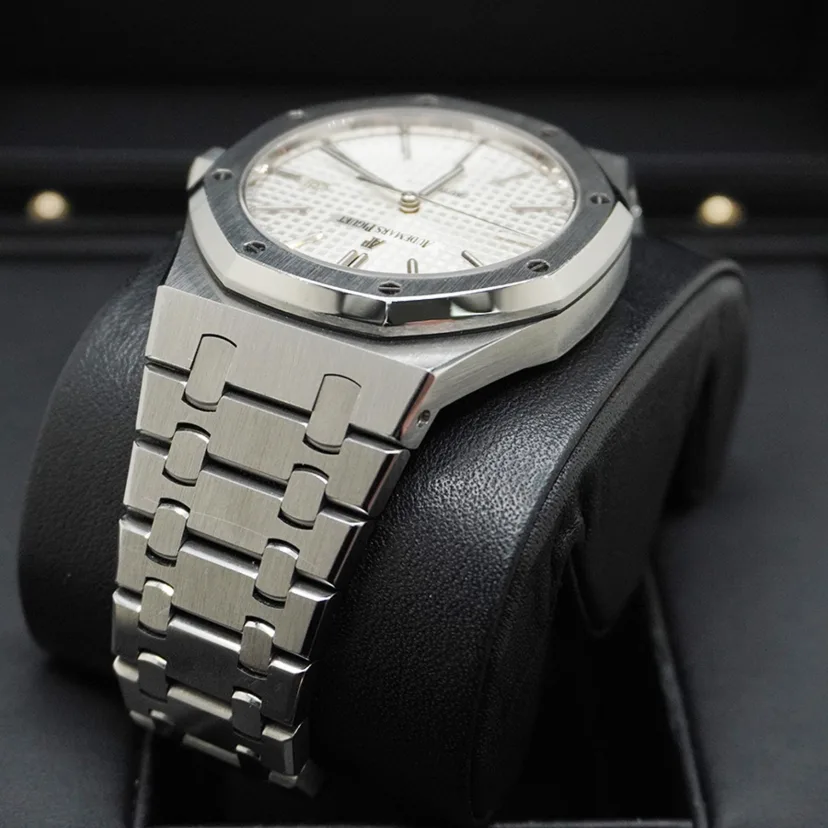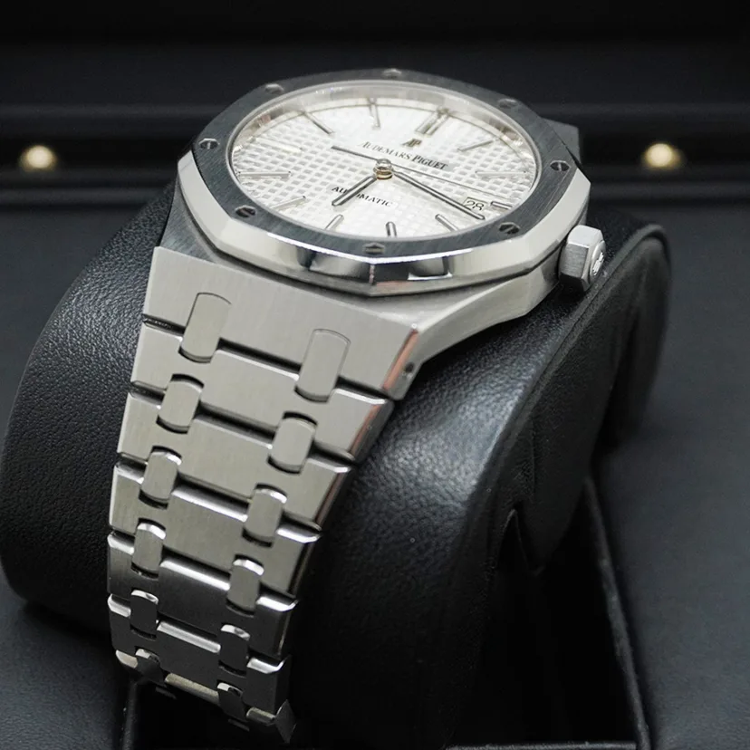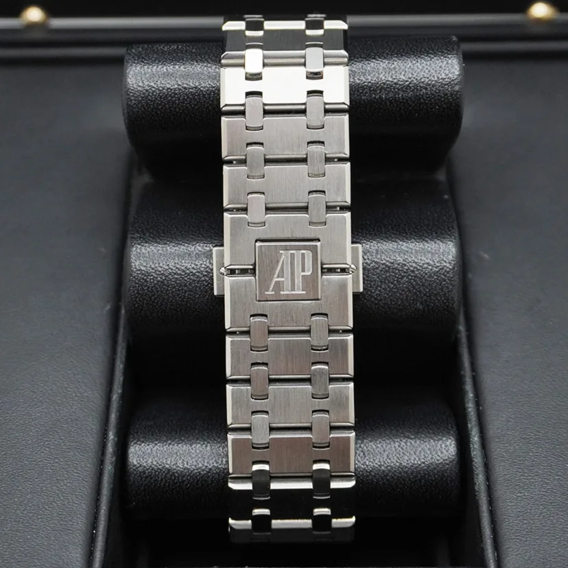 | Dial | Silver-toned dial with “Grande Tapisserie” pattern, rose gold applied hour-markers and Royal Oak hands with luminescent coating |