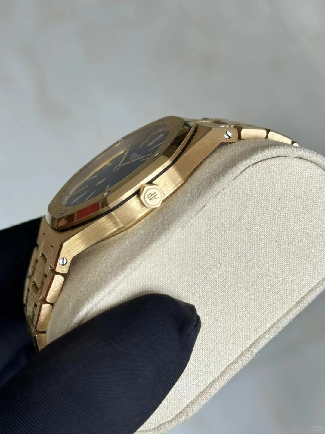Dial Blue dial with “Petite Tapisserie” pattern, yellow gold applied hour-markers and Royal Oak hands with luminescent coating