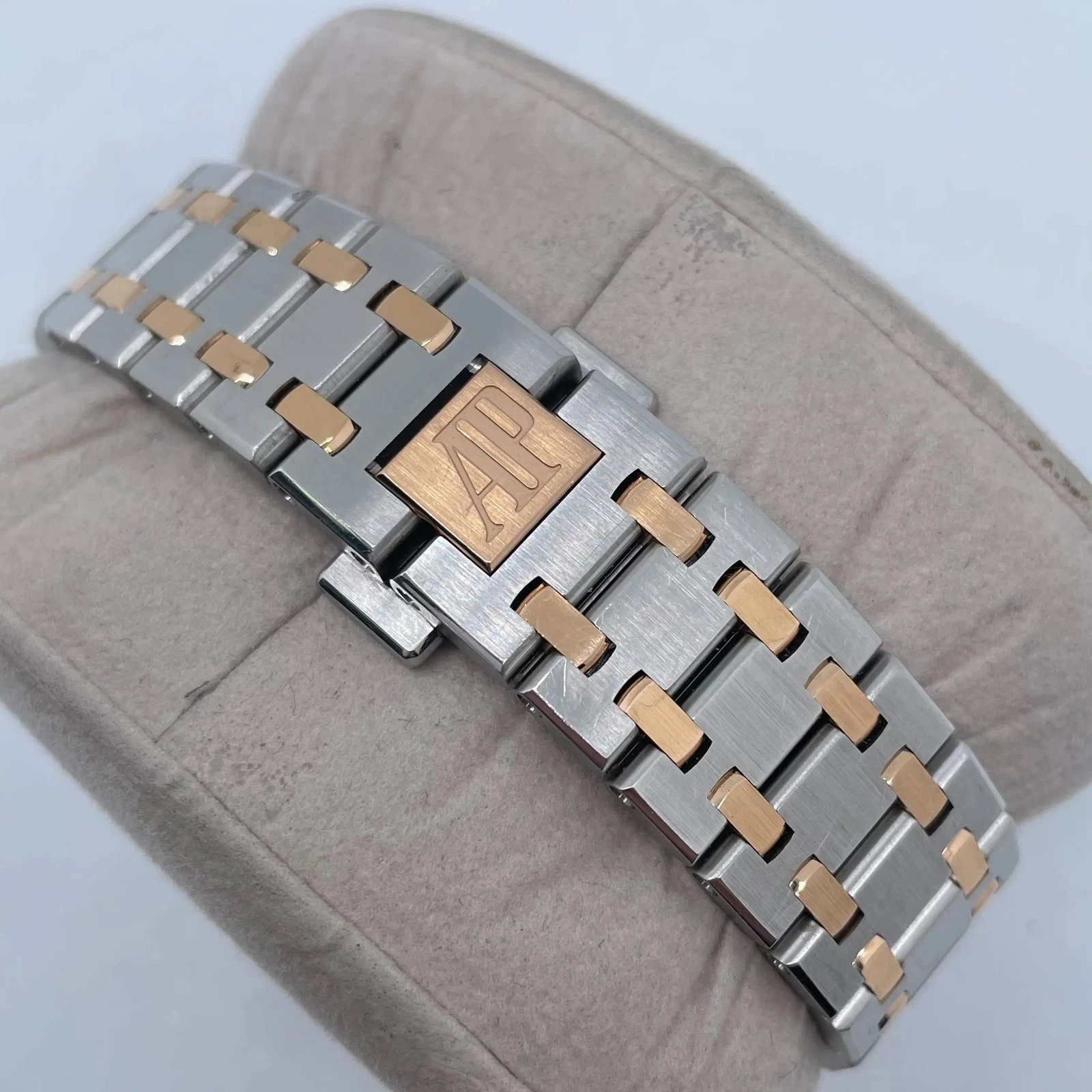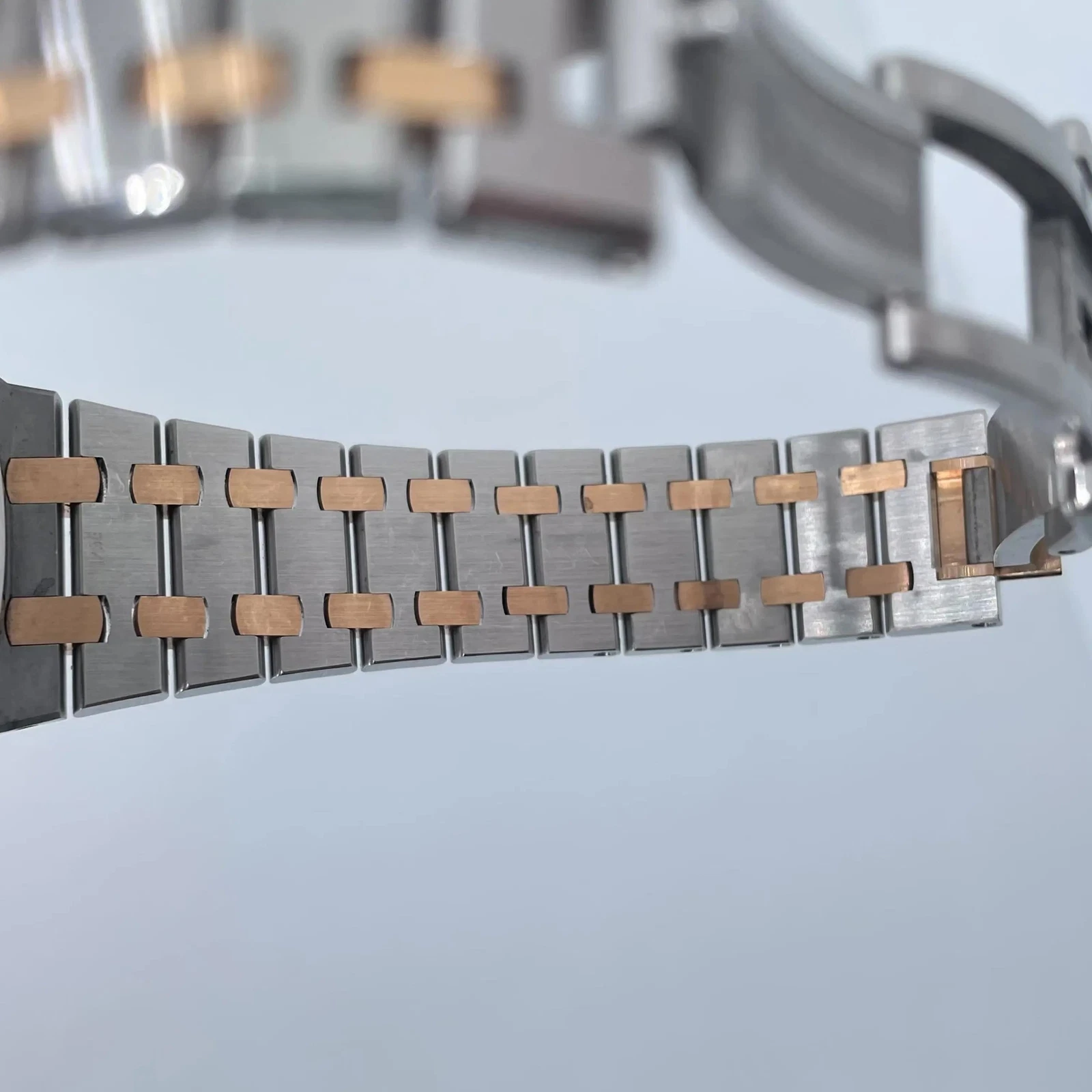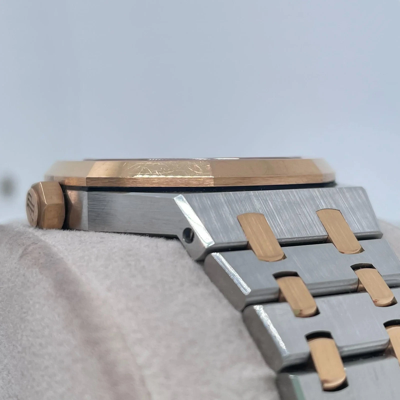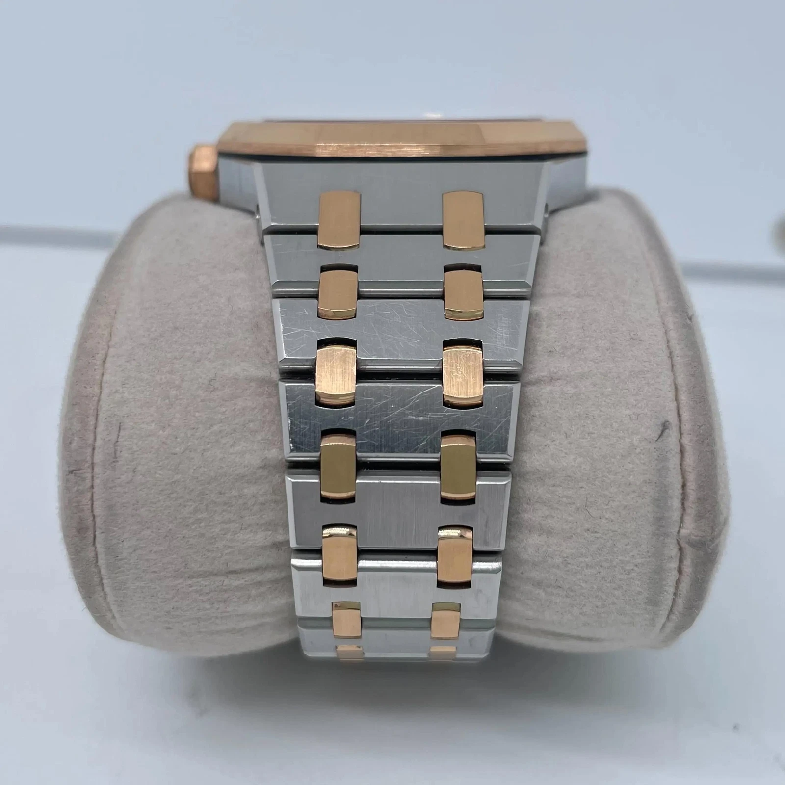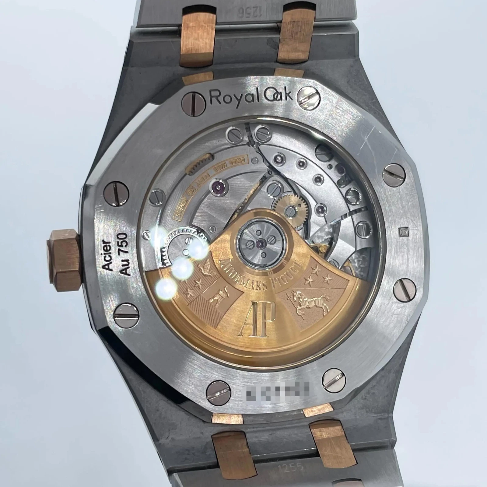 | Dial | Silver-toned dial with “Grande Tapisserie” pattern, pink gold applied hour-markers and Royal Oak hands with luminescent coating |