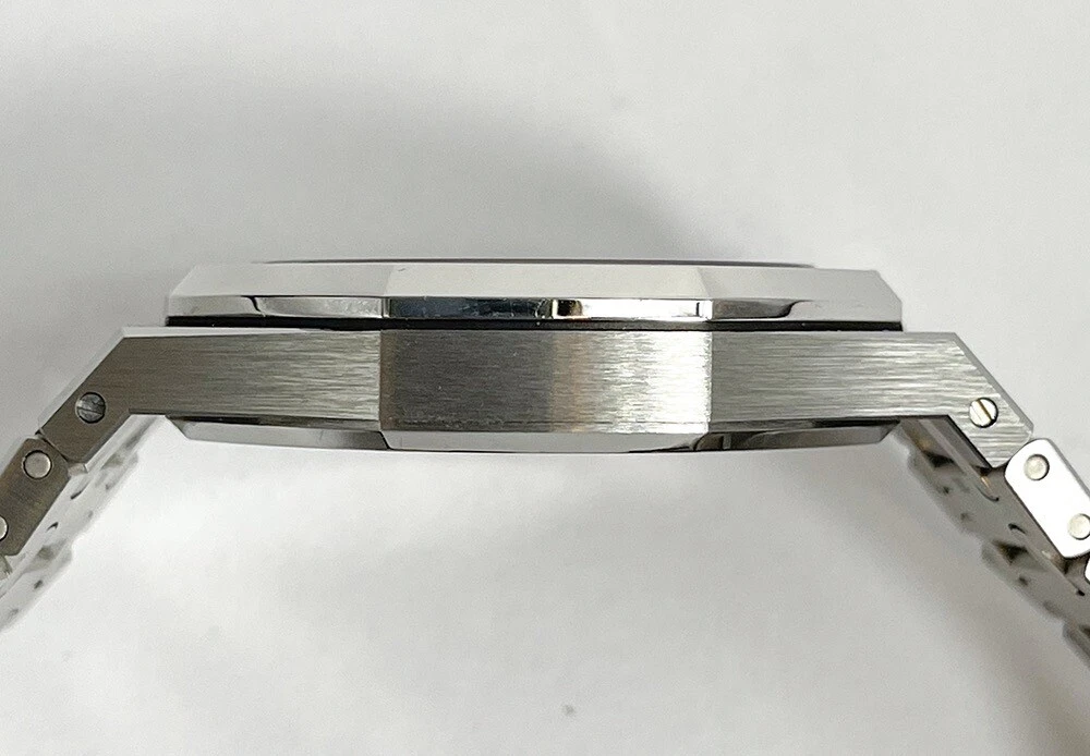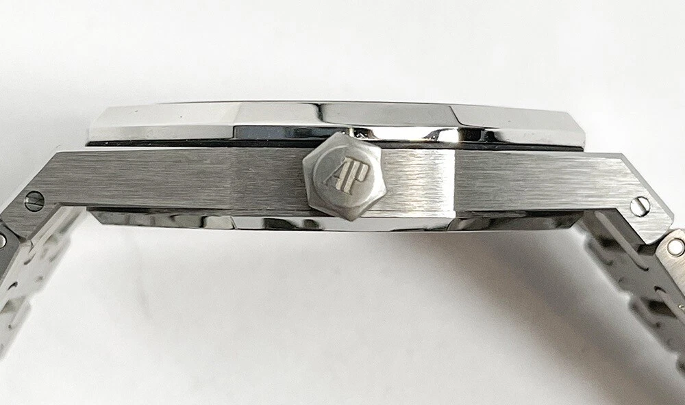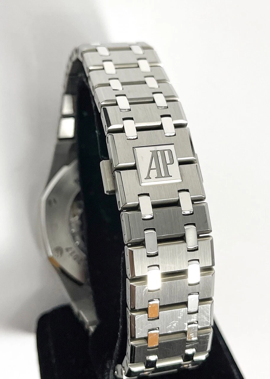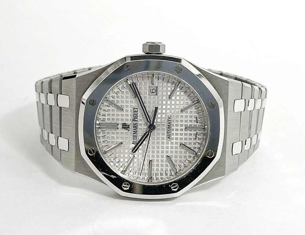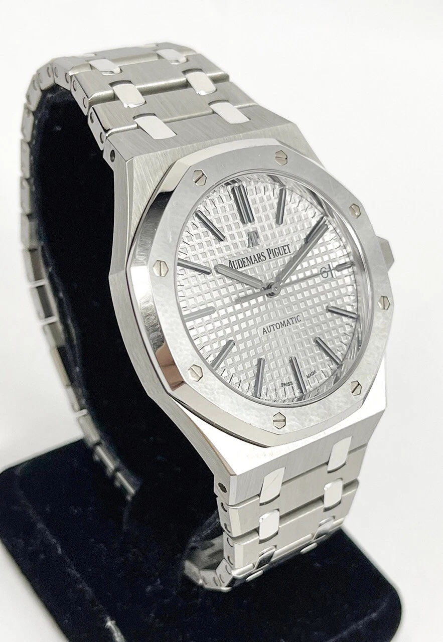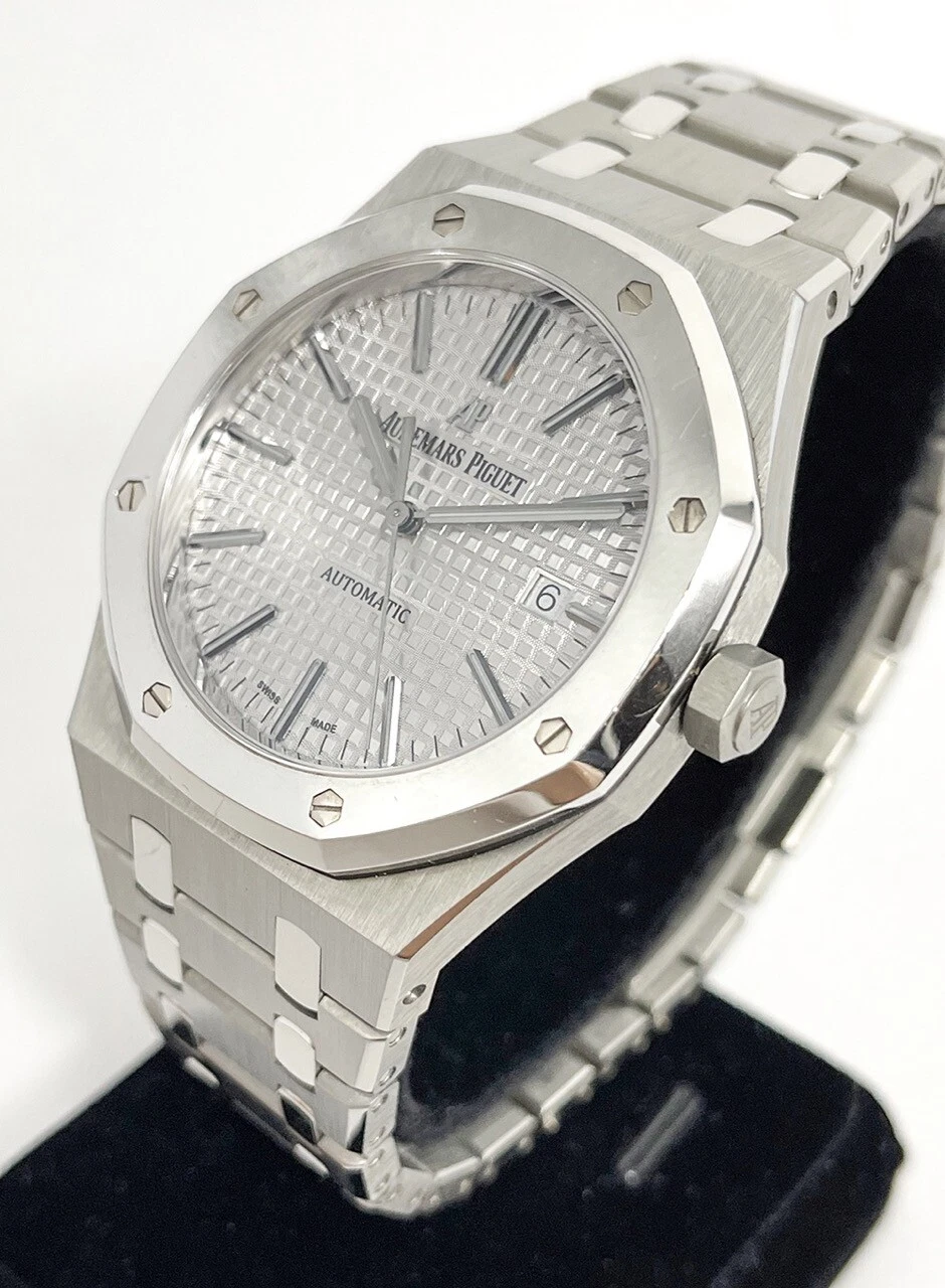 | Dial | Rhodium-toned dial with “Grande Tapisserie” pattern, white gold applied hour-markers and Royal Oak hands with luminescent coating |