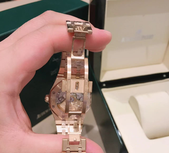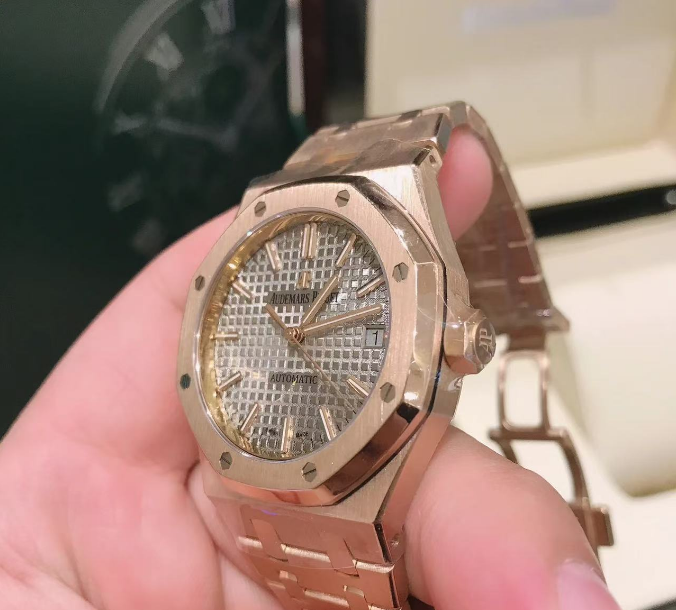 | Dial | Nickel grey dial with “Grande Tapisserie” pattern, rose gold applied hour-markers and Royal Oak hands with luminescent coating |