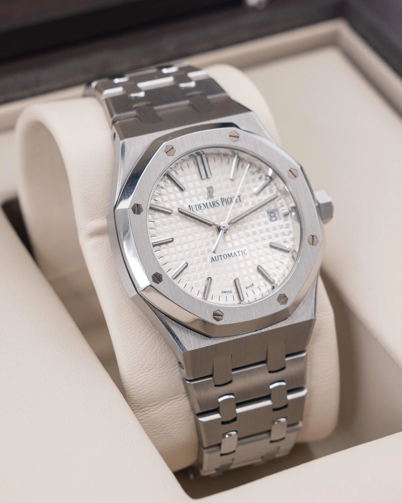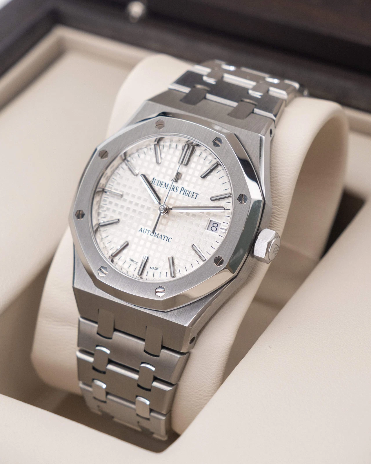 | Dial | Silver-toned dial with "Grande Tapisserie" pattern, white gold applied hour-markers and Royal Oak hands with luminescent coating. |