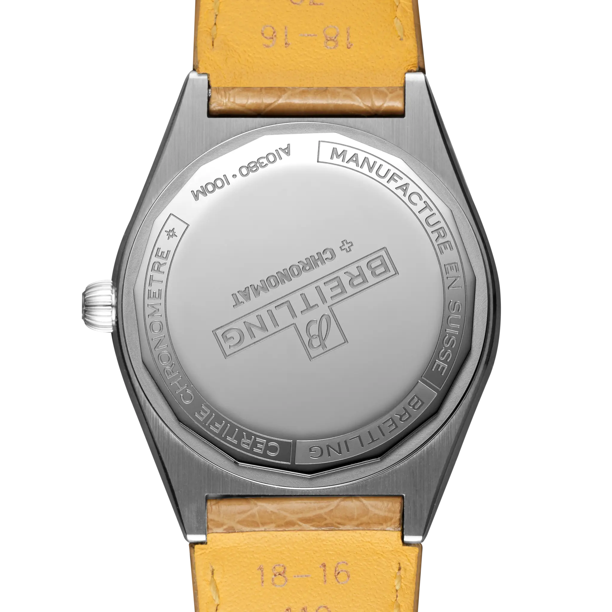 With Manufacturer Serial Numbers Swiss Made Beige Dial Diamond & Index Hour Markers Polished Stainless Steel Bezel Set with Cocktail-hued Gems Date Feature 42 Hour Power Reserve Self-winding Automatic Movement COSC Chronometer Certified Breitling Caliber 10 Vibrations Per Hour: 28,800 Jewels: 25 6 Year Warranty Guaranteed Authentic Manufacturer Box & Manual Brushed Stainless Steel Case Beige Leather Strap with Pattern Cambered Scratch Resistant Sapphire Crystal Glareproofed on Both Sides 100 Meters / 330 Feet Water-Resistant 36mm = 1 1/3" Case, 6.5" Adjustable Strap Case Thickness: 10mm Inlet Size: 18mm Unidirectional Rotating Bezel Luminescent Hands & Hour Markers Push & Pull Crown Screw Down Case Back Stainless Steel Deployment Buckle