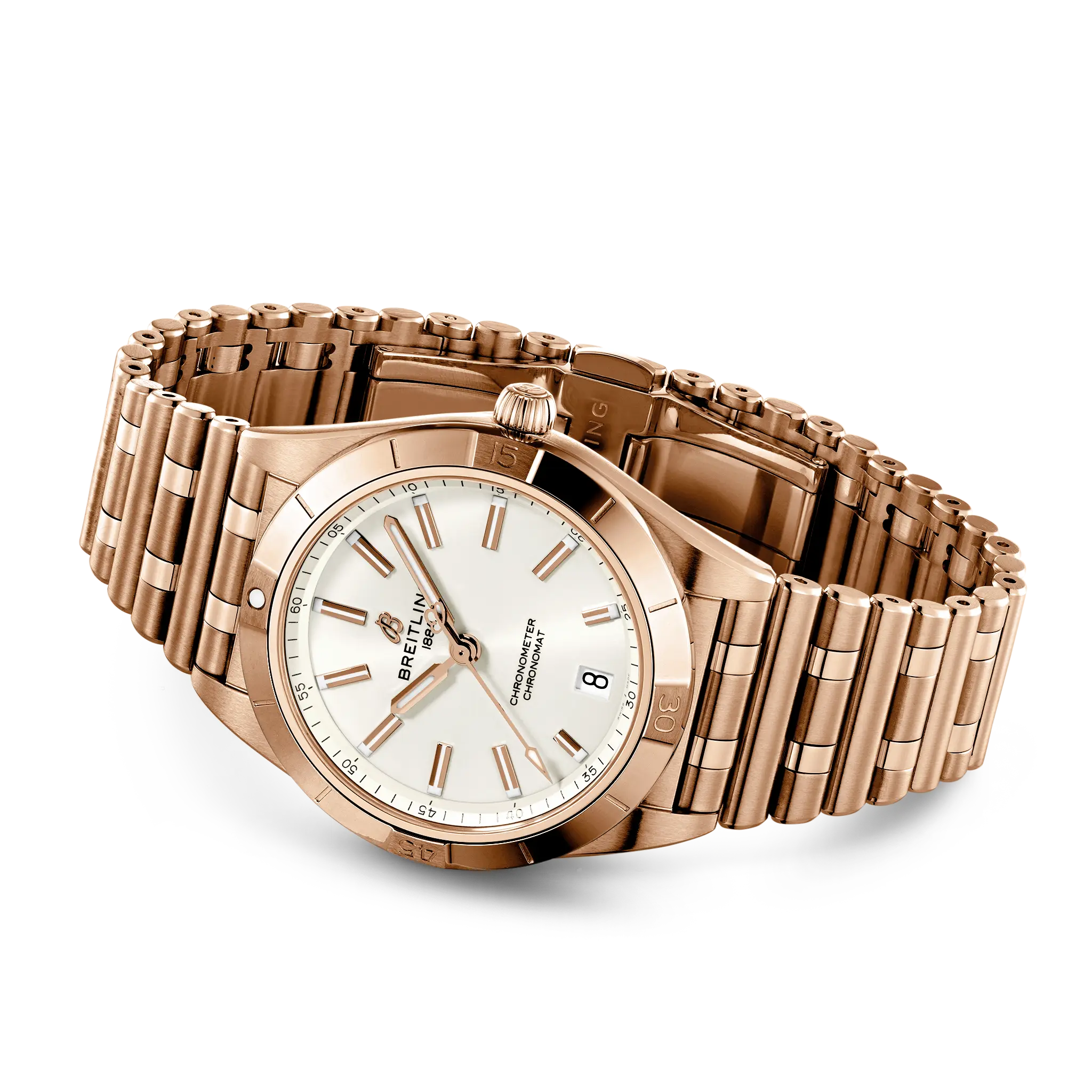 This 36mm Chronomat model boasts an elegant, silver-tone dial with red gold hands and indexes, and a date window at six o’clock.