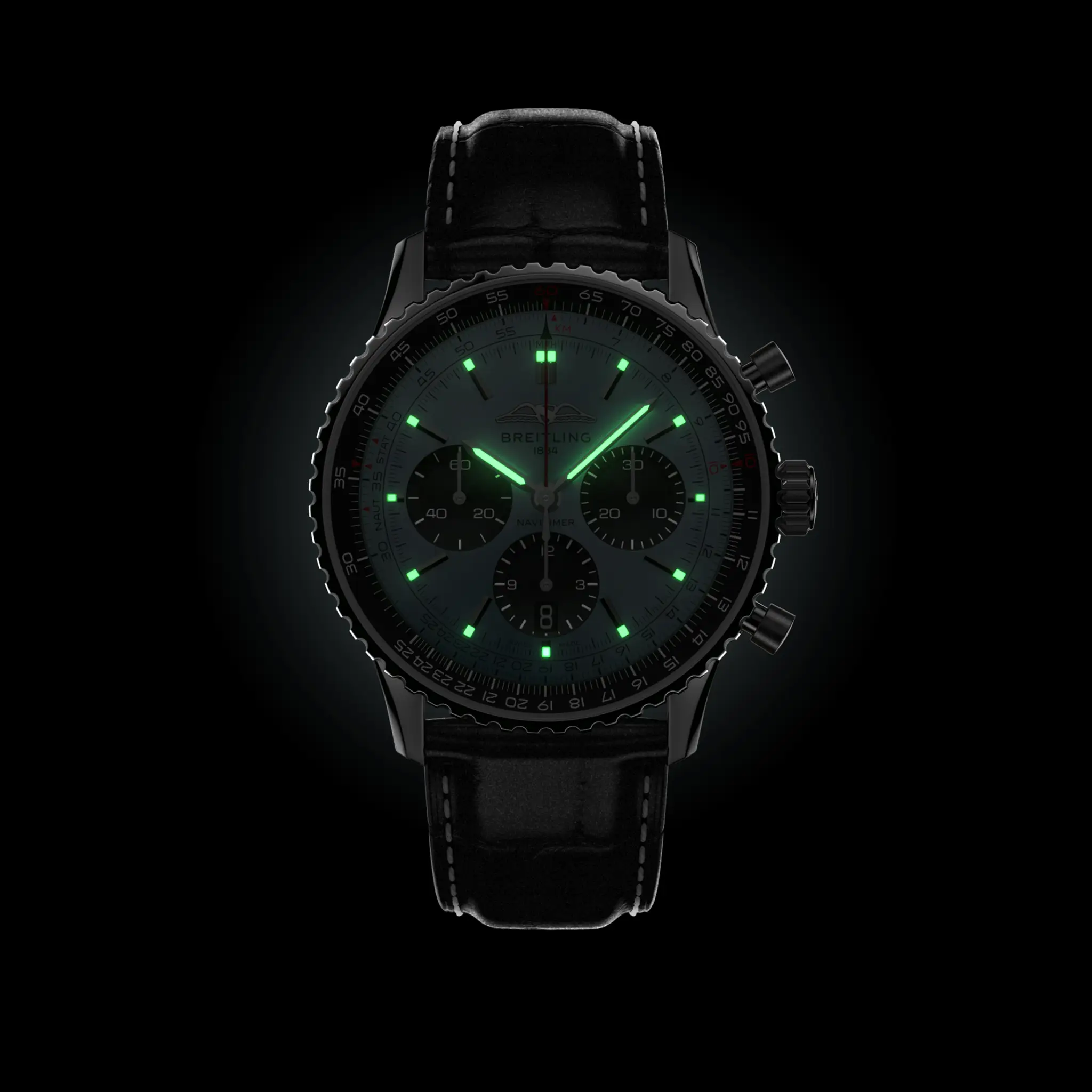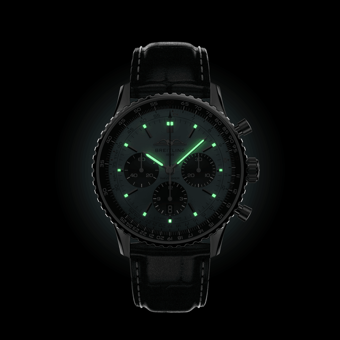 With Manufacturer Serial Numbers Swiss Made Blue Dial Index Hour Markers Polished Stainless Steel Bezel Date Feature Chronograph Feature Large Central Chronograph Second Hand 30 Minute Counter Sub-Dial at 3 O'Clock 12 Hour Counter Sub-Dial at 6 O'Clock Small Seconds Sub-Dial at 9 O'Clock 70 Hour Power Reserve Self Winding Automatic Movement COSC Chronometer Certified Breitling Caliber 01 Vibrations Per Hour: 28,800 Jewels: 47 6 Year Warranty Guaranteed Authentic Manufacturer Box & Manual Polished Stainless Steel Case Black Leather Strap Cambered Scratch Resistant Sapphire Crystal Glareproofed on Both Sides 30 Meters / 100 Feet Water Resistant 43mm = 1 5/8" Case, 7" Adjustable Strap Case Thickness: 13.6mm Inlet Size: 22mm Bidirectional Rotating Bezel Sapphire Crystal Exhibition Case Back Luminescent Hands & Hour Markers Push & Pull Crown Screw Down Case Back Stainless Steel Deployment Buckle
