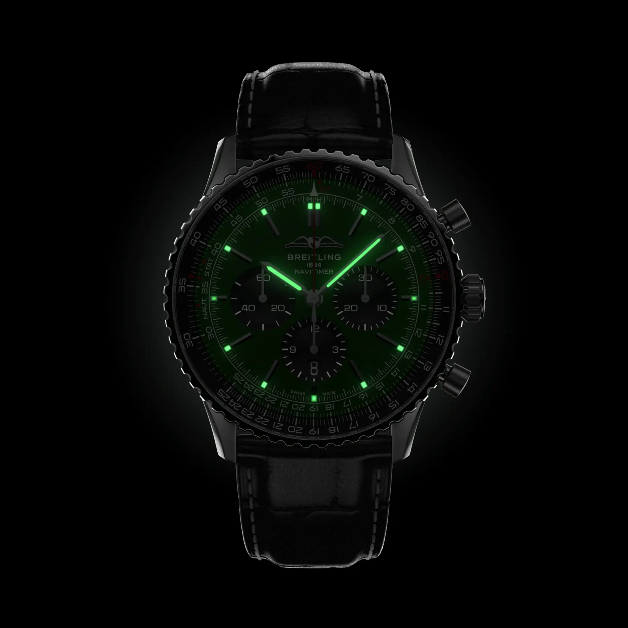 With Manufacturer Serial Numbers Swiss Made Green Dial Index Hour Markers Polished Stainless Steel Bezel Date Feature Chronograph Feature Large Central Chronograph Second Hand 30 Minute Counter Sub-Dial at 3 O'Clock 12 Hour Counter Sub-Dial at 6 O'Clock Small Seconds Sub-Dial at 6 O'Clock Slide Rule Feature 70 Hour Power Reserve Self-winding Automatic Movement COSC Chronometer Certified Breitling Caliber 01 Vibrations Per Hour: 28,800 Jewels: 47 6 Year Warranty Guaranteed Authentic Manufacturer Box & Manual Polished Stainless Steel Case Black Leather Strap With Pattern Scratch Resistant Sapphire Crystal 30 Meters / 100 Feet Water-Resistant 46mm = 1 3/4" Case, 7" Adjustable Strap Case Thickness: 13.9mm Inlet Size: 24mm Bidirectional Rotating Bezel Sapphire Crystal Exhibition Case Back Luminescent Hands & Hour Markers Push & Pull Crown Screw Down Case Back Stainless Steel Deployment Buckle