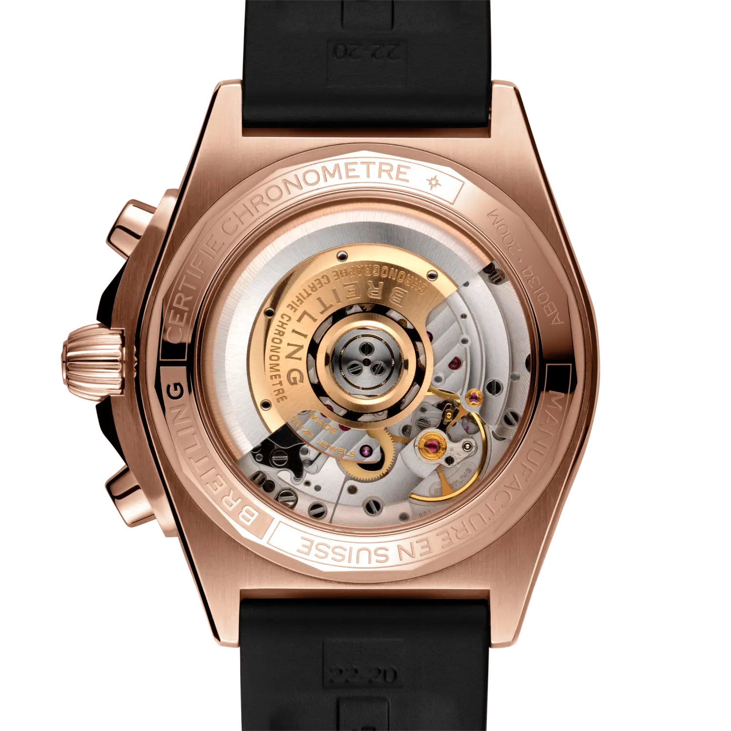 Model # RB0134101B1S1 / 289S / R20D2 New Breitling Chronomat B01 42 Men's Luxury Watch for Sale With Manufacturer Serial Numbers Swiss Made Anthracite Grey Dial Index Hour Markers Polished with Brushed Solid 18k Rose Gold Bezel Date Feature Chronograph Feature Large Central Chronograph Second Hand 30 Minute Counter Sub-Dial at 3 O'Clock 12 Hour Counter Sub-Dial at 6 O'Clock Small Seconds Sub-Dial at 9 O'Clock Tachymeter Scale Feature 70 Hour Power Reserve Self-winding Automatic Movement COSC Chronometer Certified Breitling Caliber 01 Vibrations Per Hour: 28,800 Jewels: 47 6 Year Warranty Guaranteed Authentic Manufacturer Box & Manual Brushed with Polished Solid 18k Rose Gold Case Black Rubber Strap Cambered Scratch Resistant Sapphire Crystal Glareproofed on Both Sides 200 Meters / 660 Feet Water-Resistant 42mm = 1 5/8" Case, 7" Adjustable Strap Case Thickness: 15.10mm Inlet Size: 22mm Unidirectional Rotating Bezel Sapphire Crystal Exhibition Case Back Luminescent Hands & Hour Markers Screw Down Crown & Case Back 18k Rose Gold Deployment Buckle