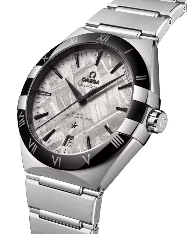 The astonishing dial is formed from a genuine piece of the Muonionalusta meteorite, which fell to the earth in northern Scandinavia (west of the border between Sweden and Finland) in approximately one million years BCE, and was discovered by geologists in 1906. In preparation to be transformed into a unique watch dial, each piece of iron meteorite has been given a rhodium-grey galvanic color treatment, and since the natural pattern within the meteorite is unique to each slice, no two dials are ever the same. This watch is completed with a date window and the signature Omega Constellation star at 6:00.