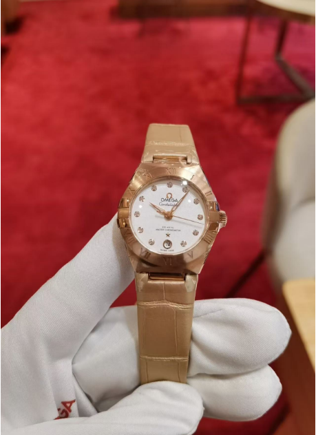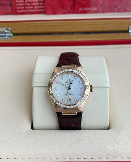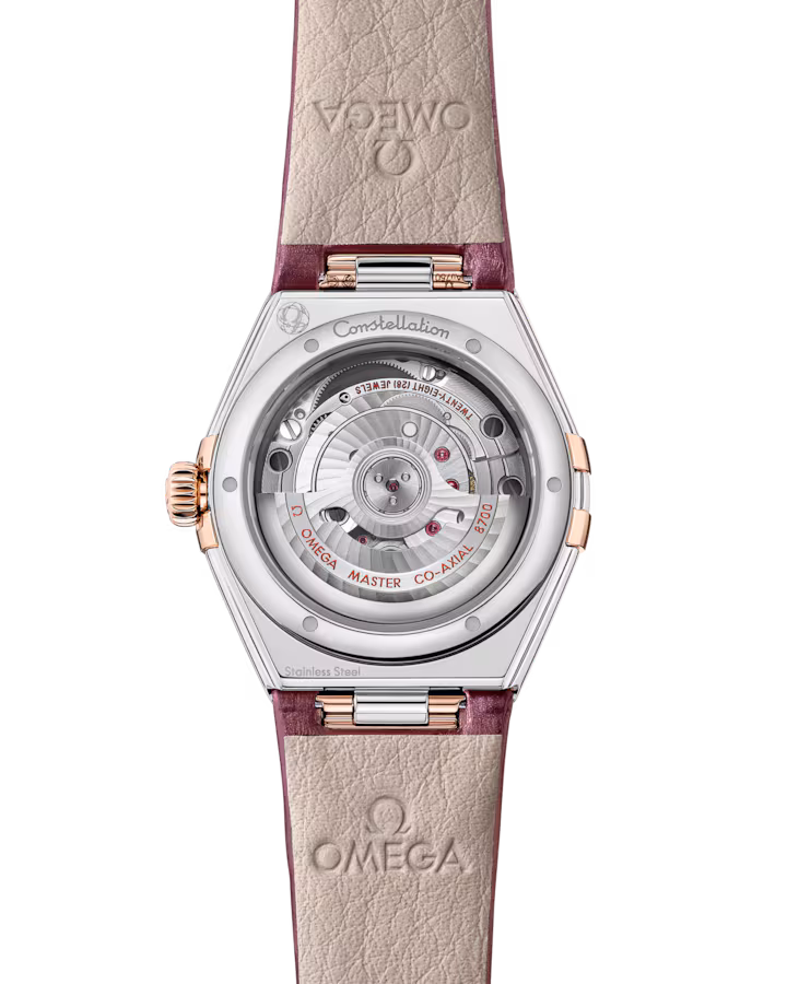 Omega Constellation 29mm Steel And Sedna Gold Case Diamond Bezel PVD Canopus Gold Silver Dial Burgundy Leather Strap 131.28.29.20.52.001
