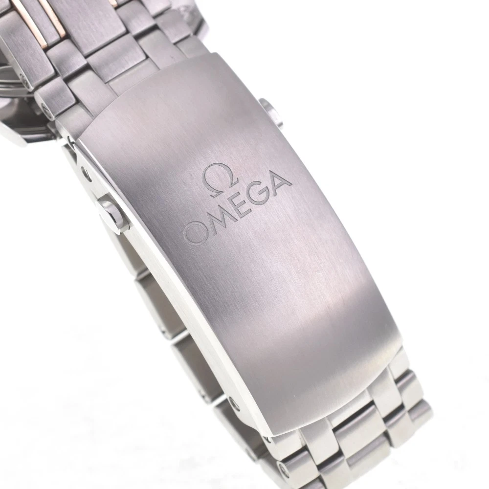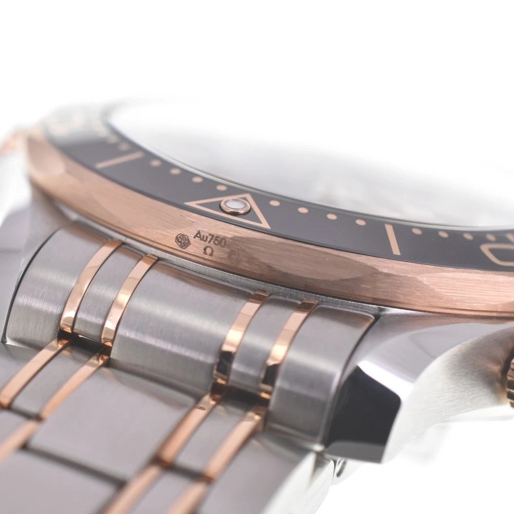 The Omega Seamaster Men's Watch 210.20.42.20.01.001 is a self-winding, automatic master chronometer. Its round brushed case, made of polished stainless steel, is paired with a brushed stainless steel and 18k rose gold bracelet. The black ceramic dial features a laser-engraved wave pattern and is adorned with luminescent index and dot hour markers, as well as skeleton hands. The unidirectional rotating black ceramic bezel displays an 18k rose gold diving scale. At 6 o'clock, there is a date feature. Inside, the watch is powered by the Omega caliber 8800 self-winding automatic master chronometer movement with co-axial escapement and an anti-magnetic feature, providing a 55 hour power reserve. With 25,200 vibrations per hour and 35 jewels, this watch is precise and reliable.