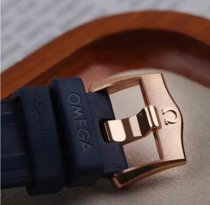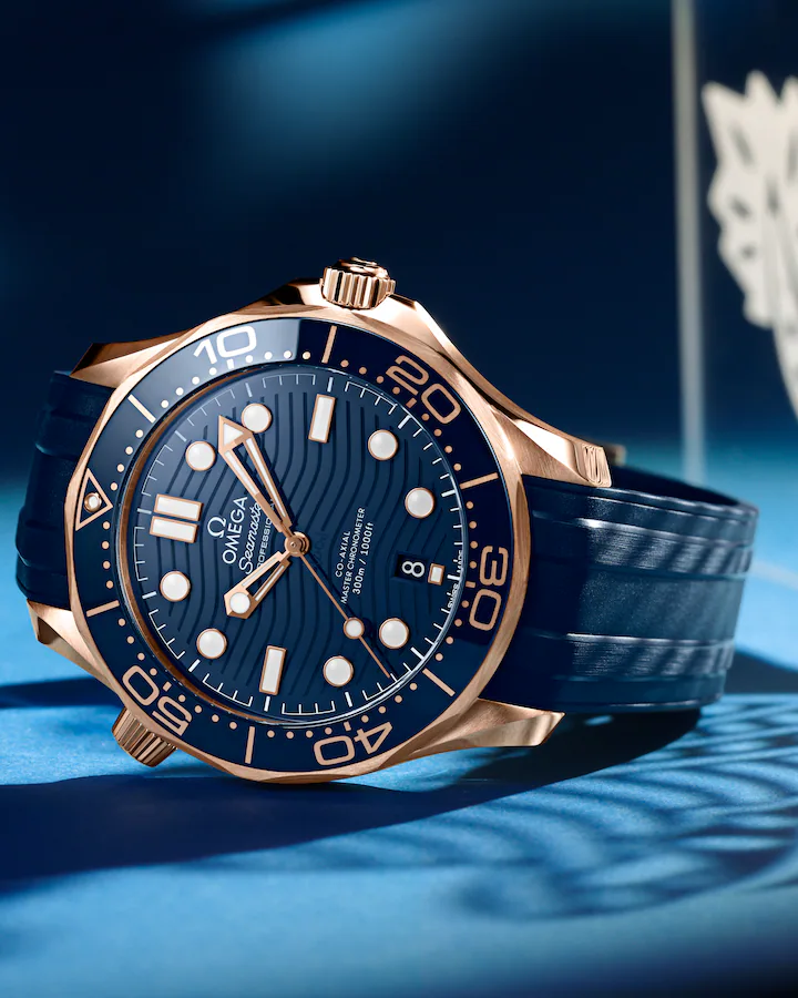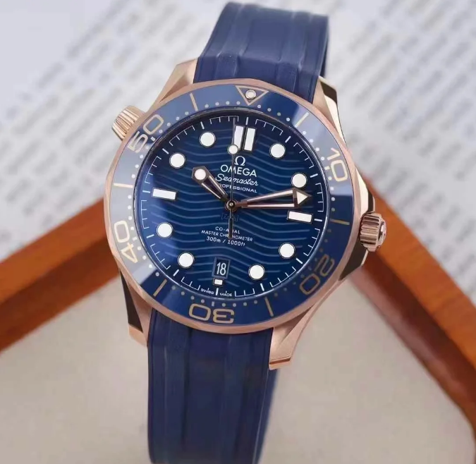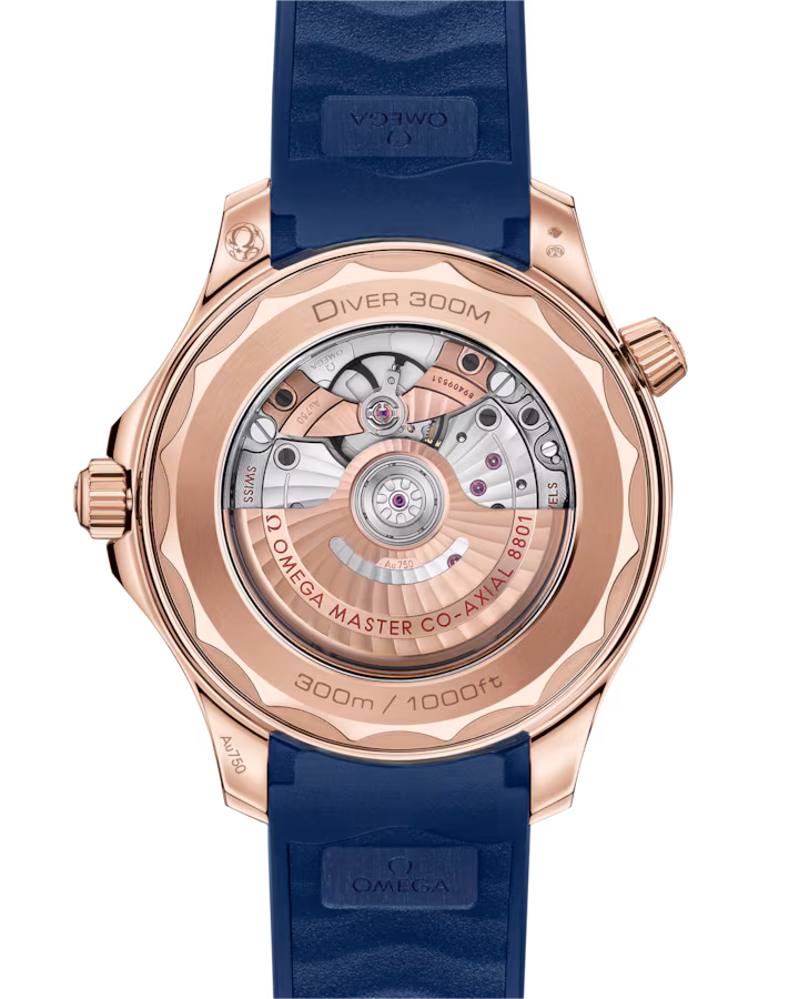 The Omega Seamaster Diver Rose Gold Men's Watch 210.62.42.20.03.001 boasts a 18k polished and brushed rose gold case, along with a blue rubber strap and a blue ceramic unidirectional rotating bezel. The striking ceramic blue dial features a wave pattern and is adorned with luminescent skeleton hands, dots and index hour markers. The date window is conveniently displayed at the 6 o'clock position. This watch is equipped with an anti-magnetic feature that can resist magnetic fields up to 1.5 tesla (15,000 gauss). The Helium escape valve is located on the edge of the case at the 10 o'clock position.
