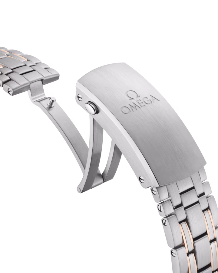 The Omega Seamaster 300M 42mm Automatic Men's Watch 210.20.42.20.03.002 features a self-winding automatic co-axial movement and a round brushed stainless steel case with a 18k rose gold bracelet. The blue ceramic dial showcases a laser-engraved wave pattern and luminescent 18k rose gold index and dot hour markers and skeleton hands. The unidirectional rotating bezel is made of blue ceramic and features an 18k rose gold diving scale. A date feature can be found at the 6 o'clock position, while the helium escape valve is located at 10 o'clock and has a conical design. The Omega caliber 8800 self-winding automatic movement powers the watch and is equipped with an anti-magnetic feature and co-axial escapement, providing a 55 hour power reserve.