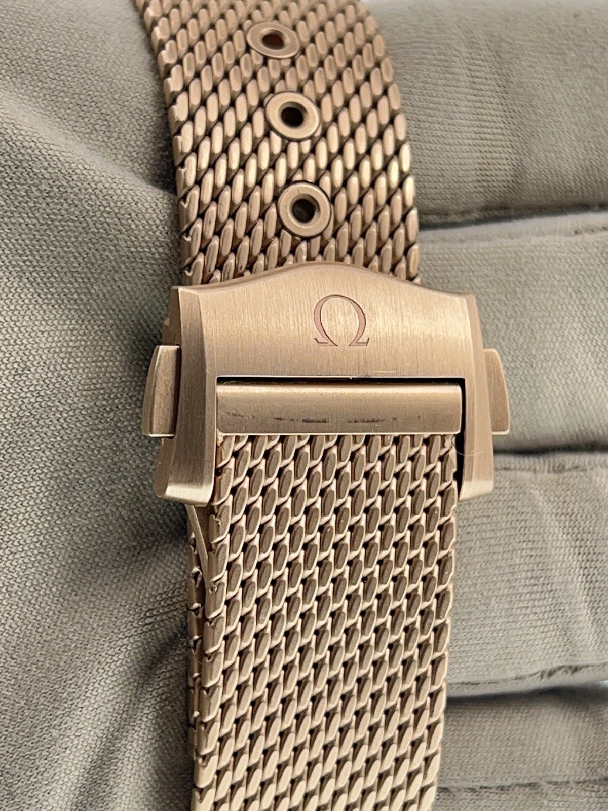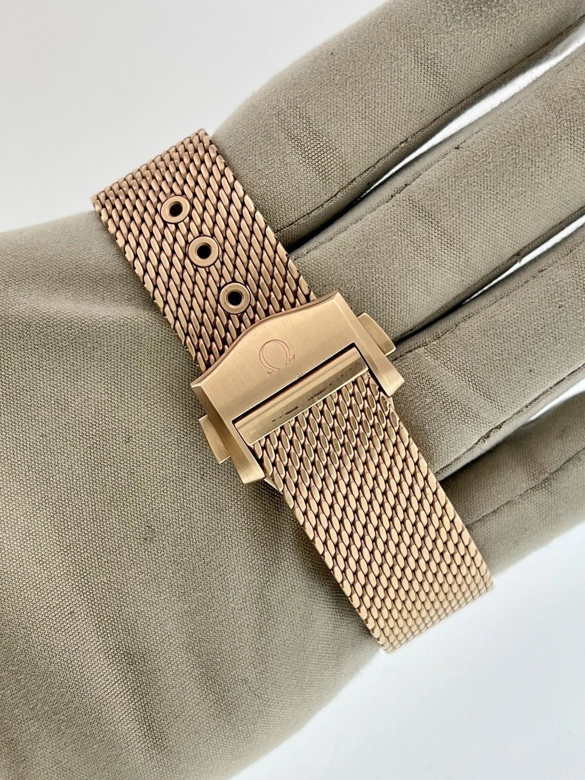 Sandblasted black aluminium is used to create the dial, which features PVD 18K Bronze Gold hands and blackened indexes, all filled with vintage Super-LumiNova. The other markings, including the OMEGA logo, are transferred in light brown.