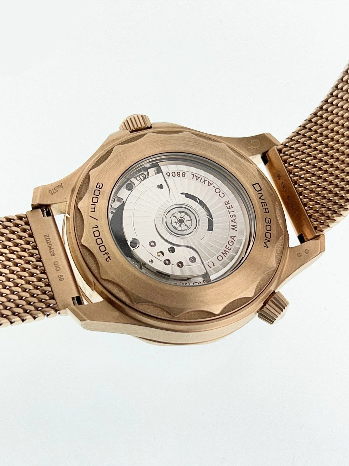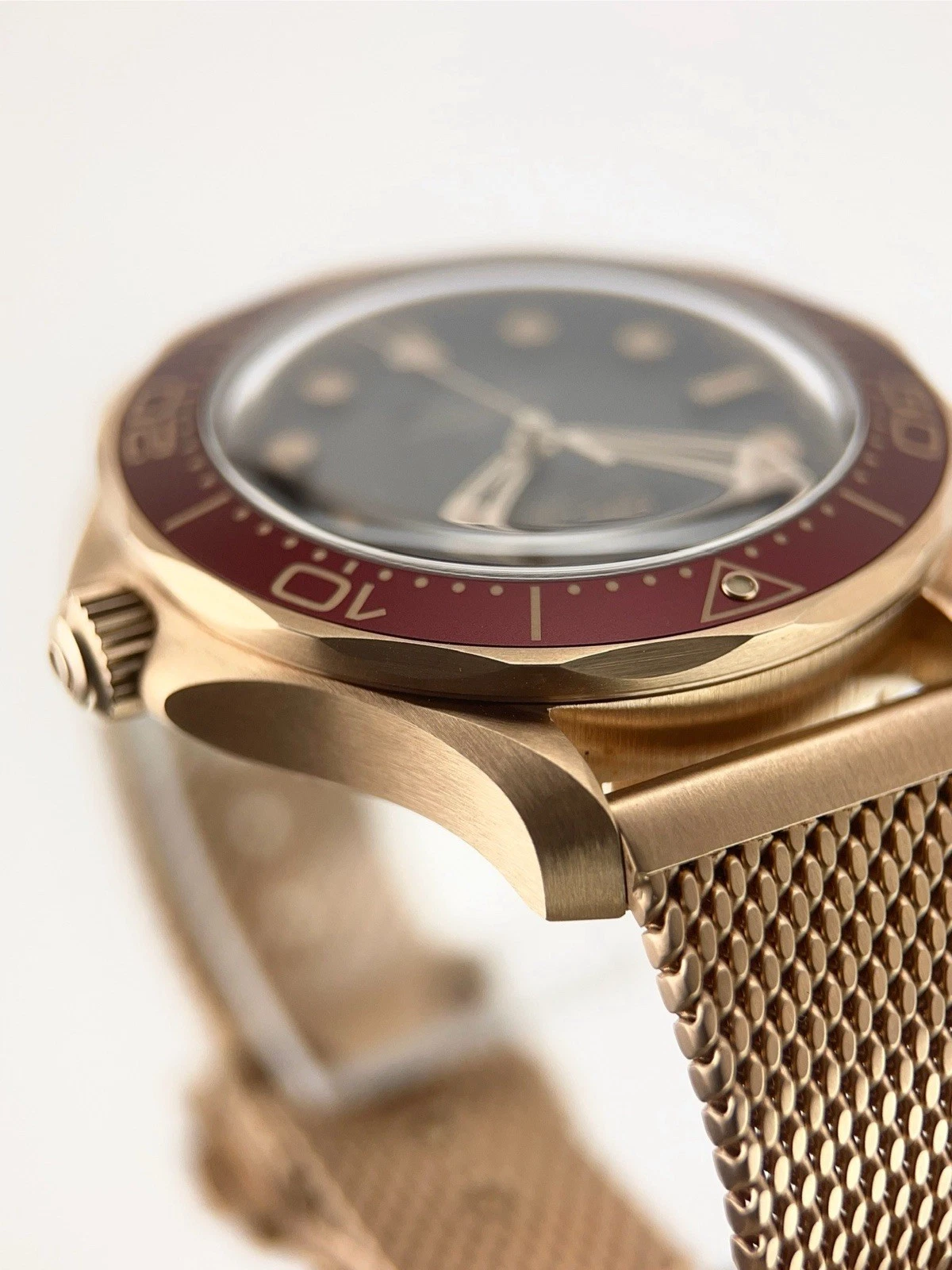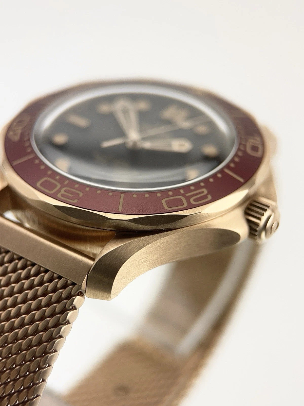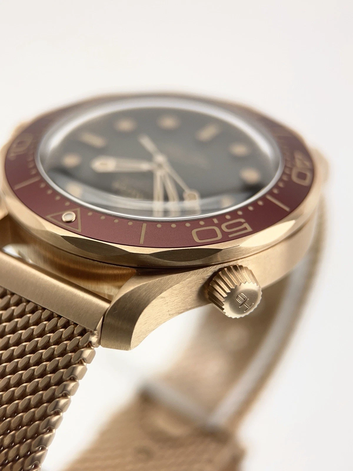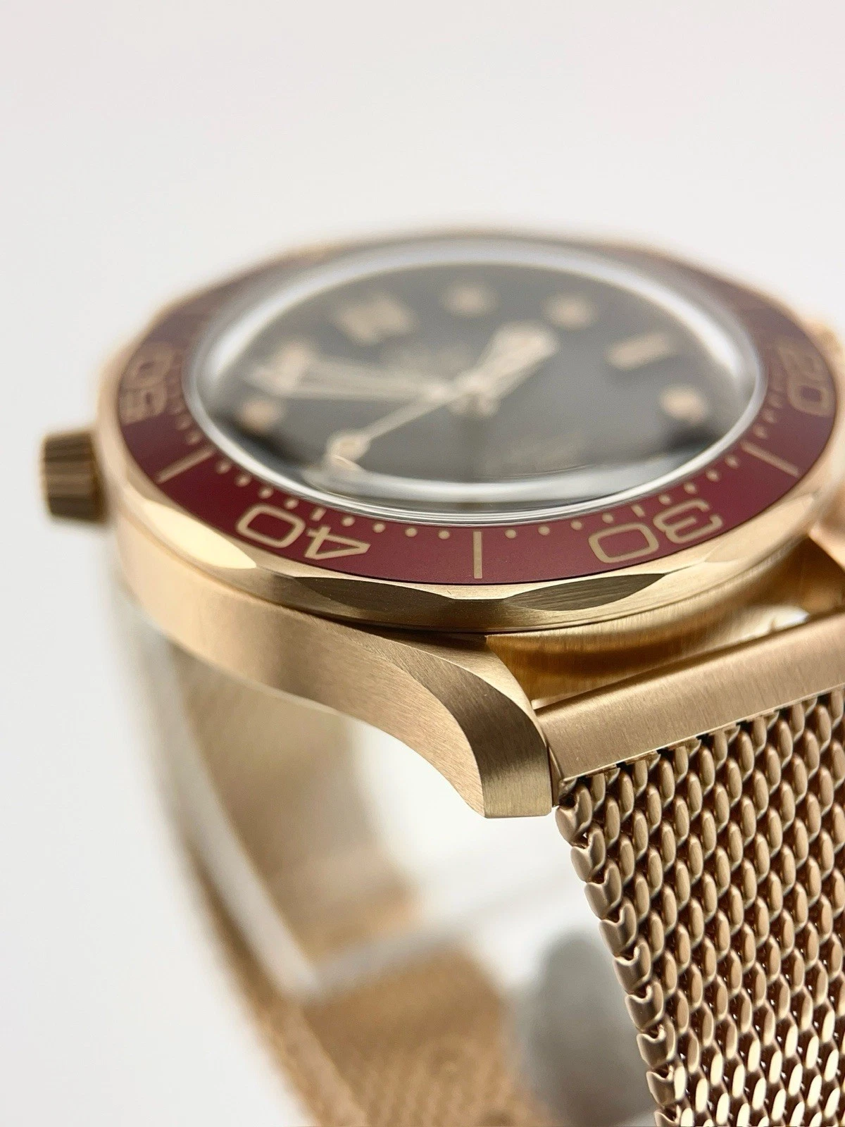 This 42 mm model is crafted in OMEGA’s exclusive Bronze Gold and includes a burgundy oxalic anodized aluminium bezel ring with a diving scale in vintage Super-LumiNova.