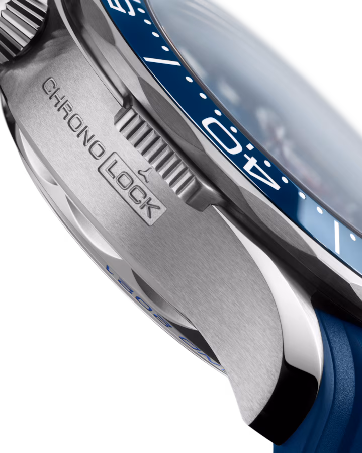 The 44 mm chronograph is built from stainless steel, with a bezel ring in blue ceramic and a white enamel diving scale. To improve grip during water activities, the watch provides blue and red soft-touch pushers in rubber.