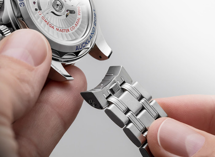 OMEGA’s exclusive CHRONO LOCK system is included to secure the chronograph functions when needed, adding secure timekeeping and the ability to lock your measured time. On the Alveol shaped caseback, the engravings are filled with blue lacquer and pay tribute to the “36th America’s Cup” and “Auckland 2021”.