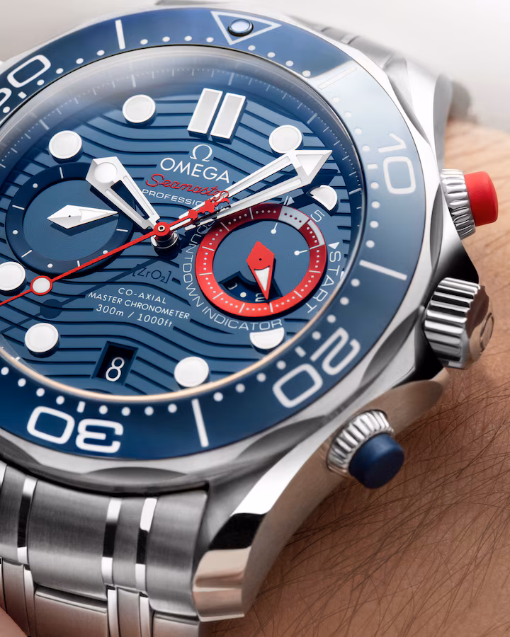 On the blue ceramic dial with its laser-engraved waves and a date window at 6H, OMEGA has included a regatta countdown indicator ring crafted in red anodized aluminium. The indicator features an hour disc underneath the subdial, designed to highlight the vital minute hand during sailing. The red anodized aluminium minute and rhodium-plated small seconds hand is inspired by the shape of a boat hull, while the central seconds chronograph hand, also in red anodized aluminium, carries an America’s Cup on the counterweight.