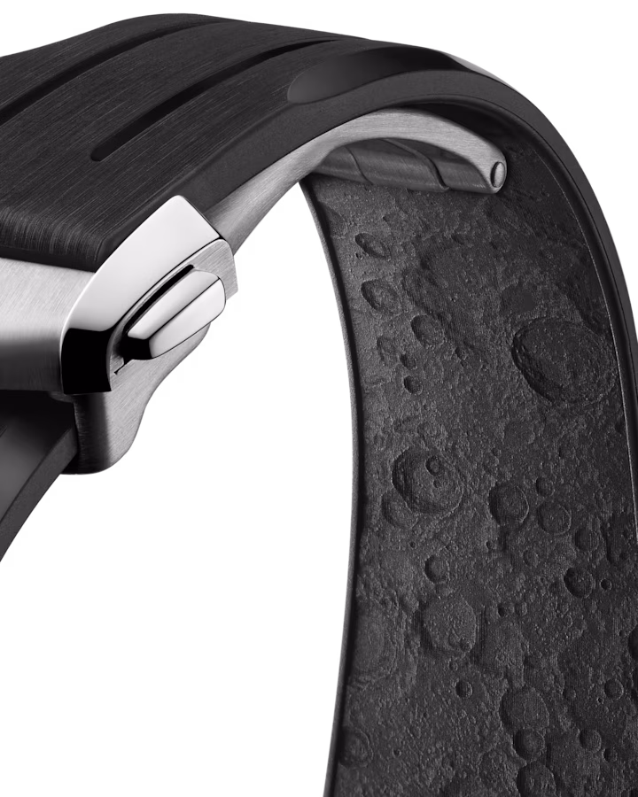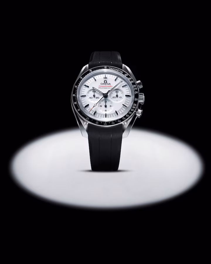 Inspired by the 4th generation Speedmaster worn on the moon, this model includes a white lacquered step dial with applied OMEGA logo, Moonwatch-style hands, and the signature dot-over-90 bezel in black anodised aluminum. The integrated black rubber strap features a lunar surface pattern on the underside—a subtle nod to its spacefaring heritage.