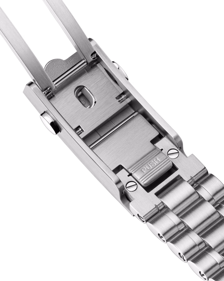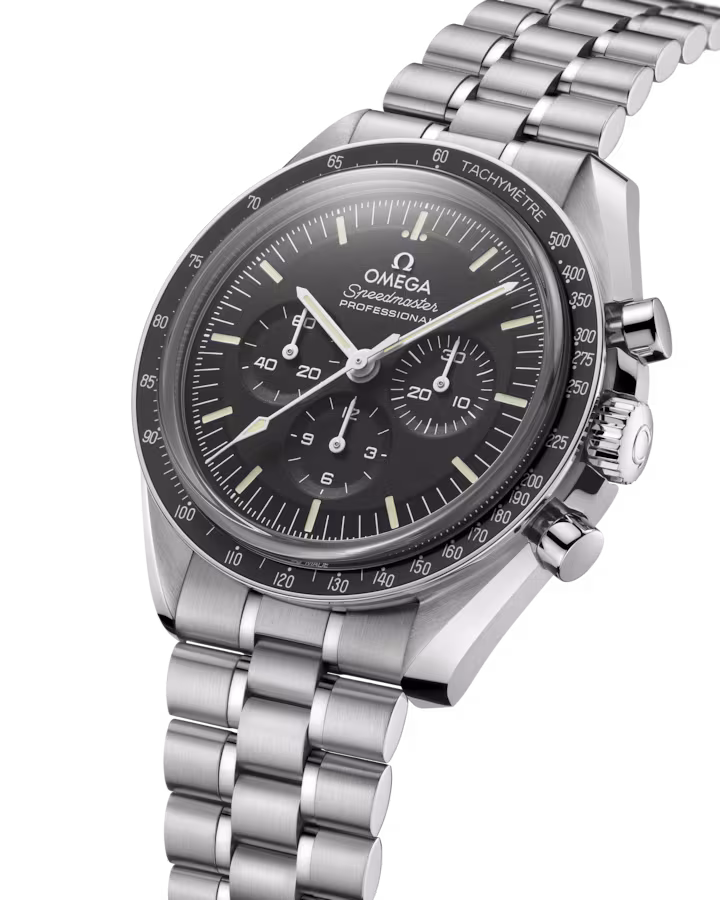 Presented on a brushed five-link bracelet, this 42mm stainless steel Moonwatch features a hesalite crystal front and an embossed Seahorse medallion caseback. Inspired by the styling of the 4th generation Speedmaster that was taken to the moon, it also features an asymmetrical case, stepped black dial and the famous 90 over point on the anodized aluminum bezel ring.