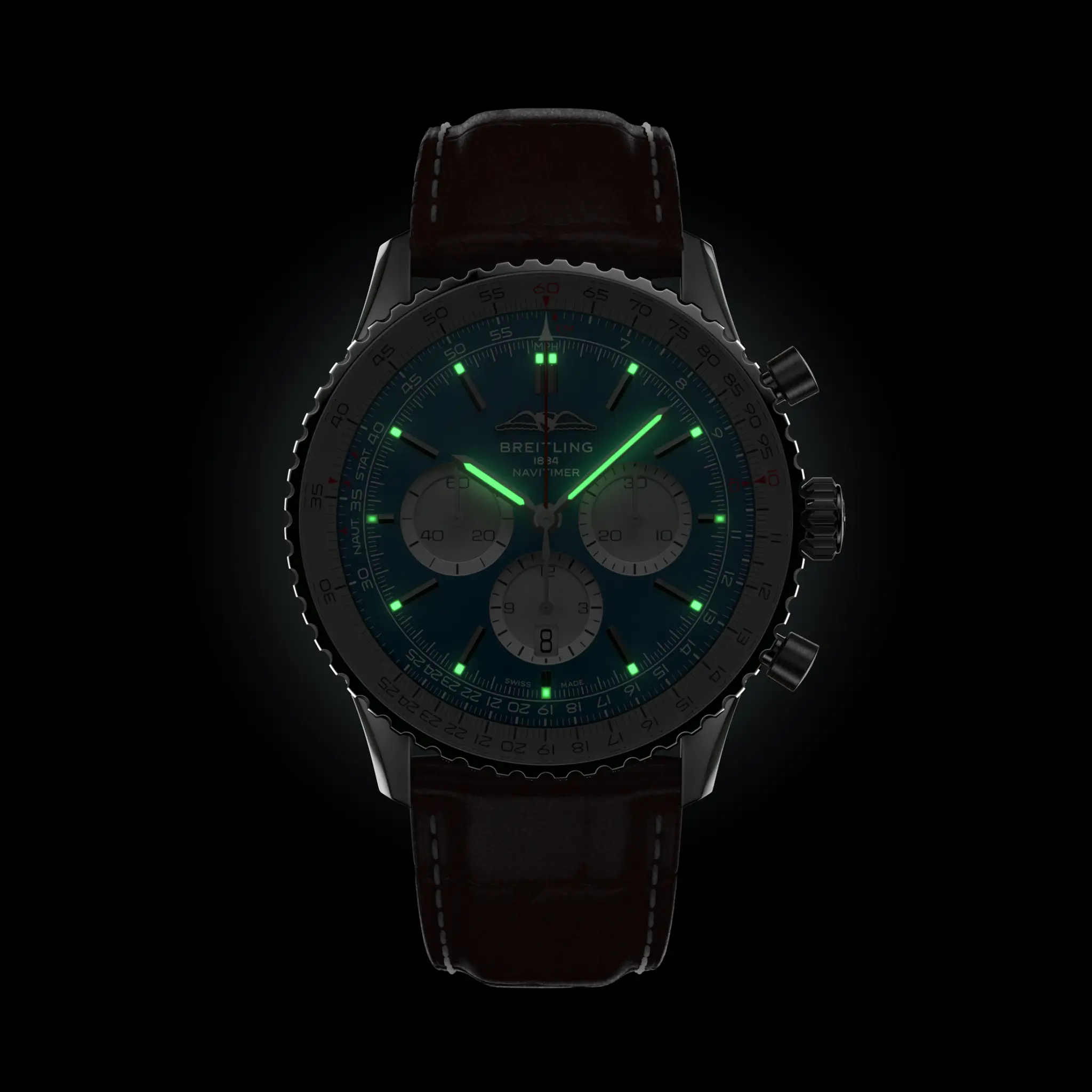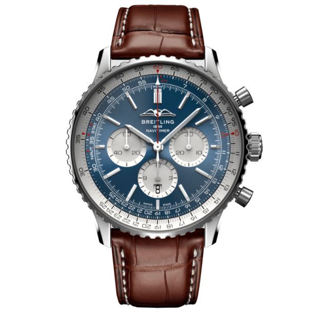 With Manufacturer Serial Numbers Swiss Made Blue Dial Index Hour Markers Polished Stainless Steel Bezel Date Feature Chronograph Feature Large Central Chronograph Second Hand 30 Minute Counter Sub-Dial at 3 O'Clock 12 Hour Counter Sub-Dial at 6 O'Clock Small Seconds Sub-Dial at 9 O'Clock Slide Rule Feature 70 Hour Power Reserve Self Winding Automatic Movement COSC Chronometer Certified Breitling Caliber 01 Vibrations Per Hour: 28,800 Jewels: 47 6 Year Warranty Guaranteed Authentic Manufacturer Box & Manual Polished Stainless Steel Case Brown Leather Strap Scratch Resistant Sapphire Crystal 30 Meters / 100 Feet Water Resistant 46mm = 1 3/4" Case, 7" Adjustable Strap Case Thickness: 13.9mm Inlet Size: 24mm Bidirectional Rotating Bezel Sapphire Crystal Exhibition Case Back Luminescent Hands & Hour Markers Push & Pull Crown Screw Down Case Back Stainless Steel Deployment Buckle