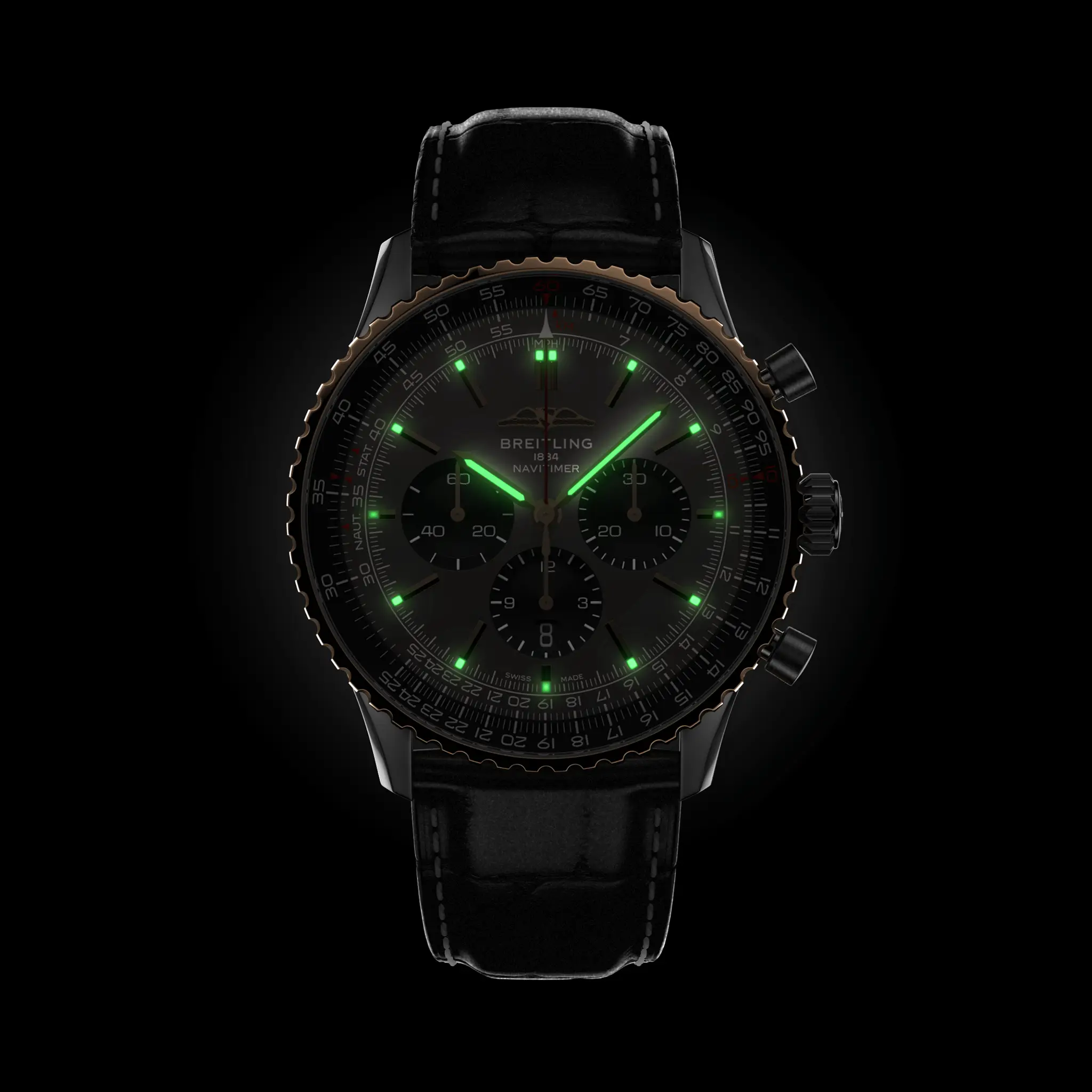 To create the new Navitimer, Breitling preserved the most recognizable aspects of the icon's design code. From a distance, this new US-exclusive is unmistakably a Navitimer, with its circular slide rule, baton indexes, trio of chronograph counters and notched bezel for easy grip. Up close, however, its modern refinements come through loud and clear. This moody "Blackeye" reference is built around a 46mm stainless steel case which has been topped with an 18k rose gold rotating slide rule bezel. Its moody anthracite dial with contrasting black totalizers is punctuated by matching rose gold hour markers.
