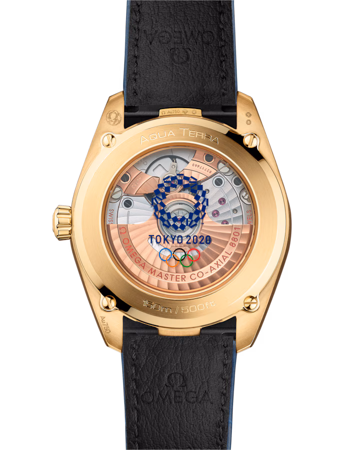 Unworn Omega Seamaster AQUA TERRA 150M CO‑AXIAL MASTER CHRONOMETER LADIES' 522.53.38.20.03.001. 38 mm, Blue dial, Yellow gold case, Yellow gold bezel, 8801 calibre, Self Winding Movement, 55 Hours power reserve, Leather strap with Foldover clasp. Water resistant to 150 m.
