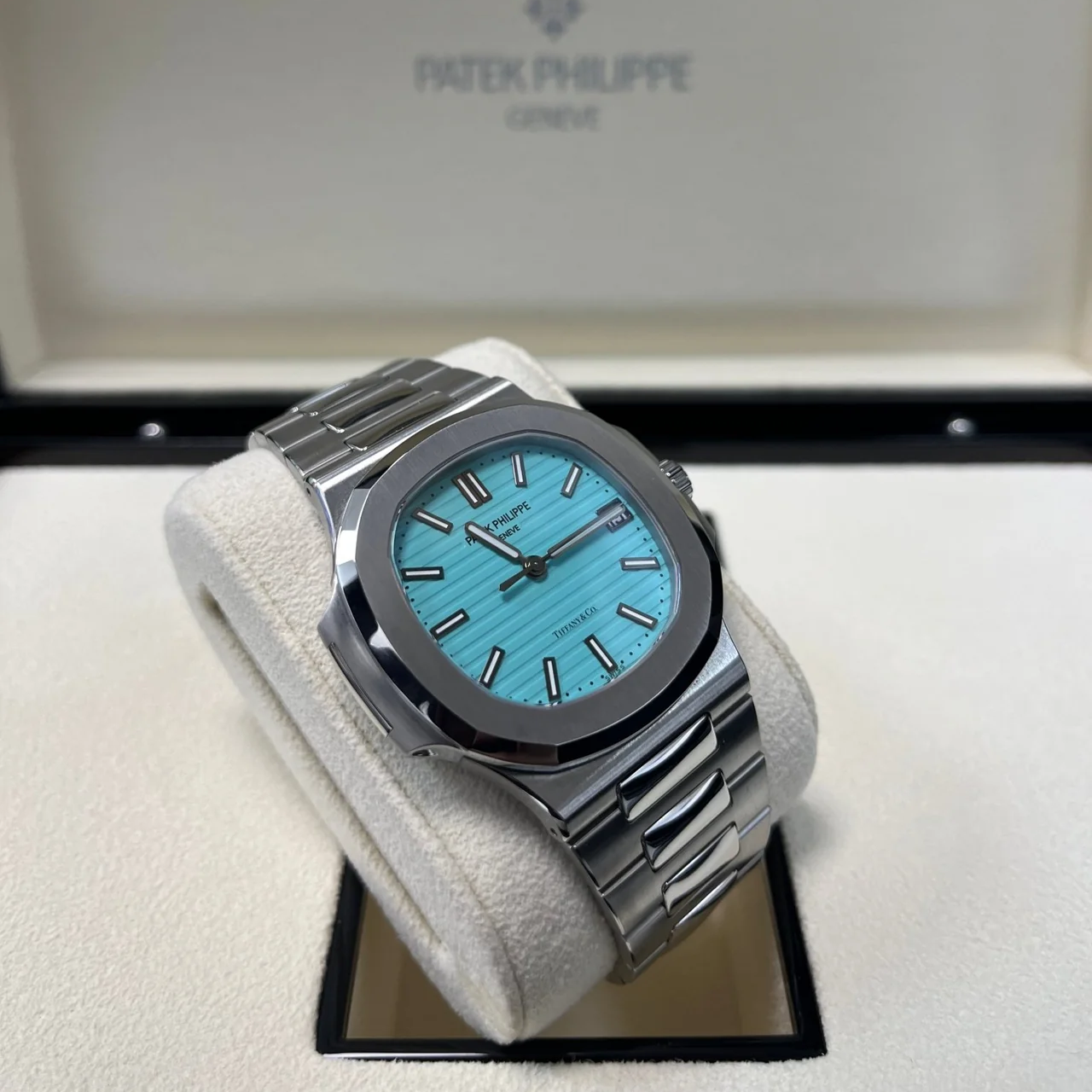Presenting the illustrious Patek Philippe Nautilus Tiffany & Co. Blue Dial 5711/1A-018 (2023), a harmonious fusion of Patek Philippe's iconic Nautilus design and the renowned Tiffany & Co.'s signature blue hue. This timepiece is a true embodiment of luxury and elegance, destined to become a treasured addition to any collector's repertoire. Crafted in stainless steel, the Nautilus case is a testament to Patek Philippe's commitment to excellence in both form and function. The distinctive octagonal shape, inspired by a porthole, is seamlessly integrated with the stunning Tiffany blue dial. This dial is not just a color; it's an emblem of sophistication and prestige. The iconic horizontal embossed pattern on the dial adds depth and texture, while the luminous hands and markers ensure effortless readability in any light condition.