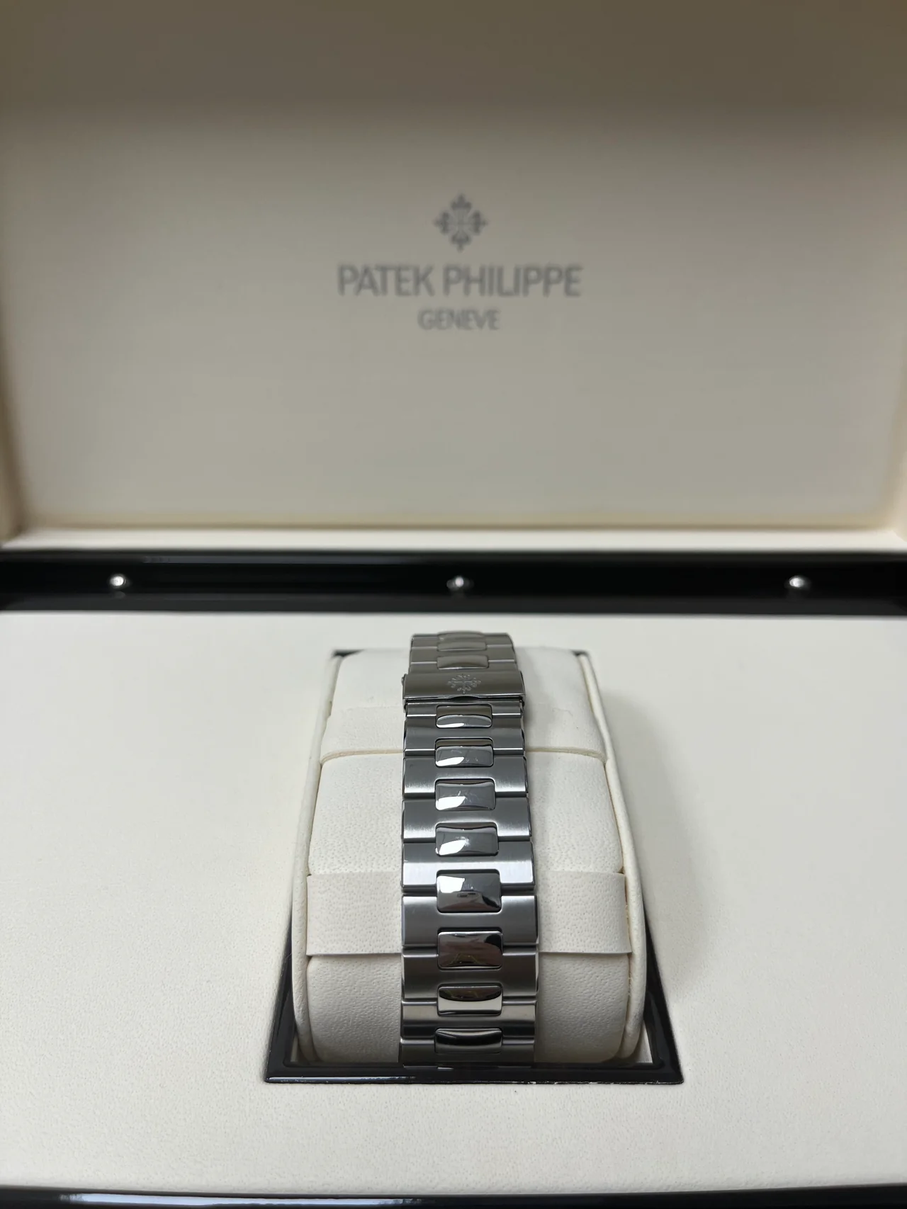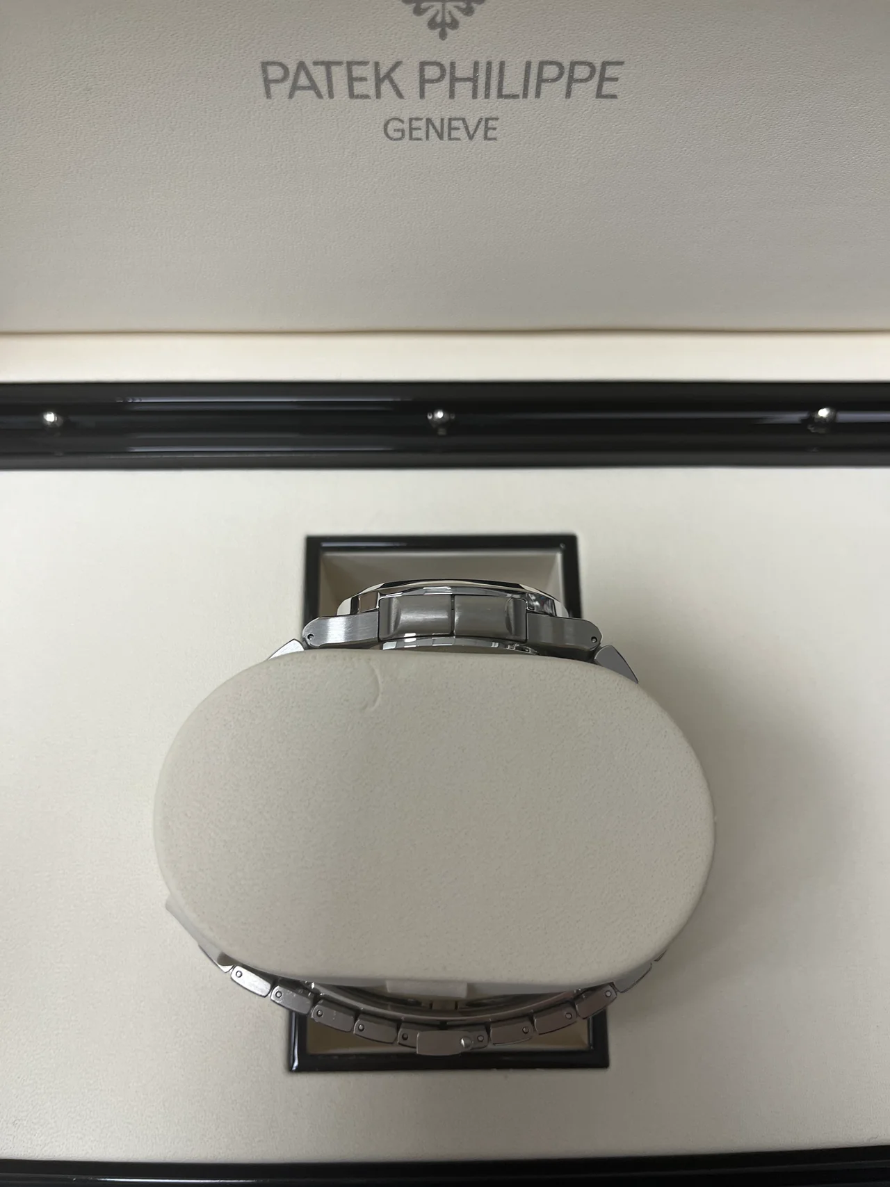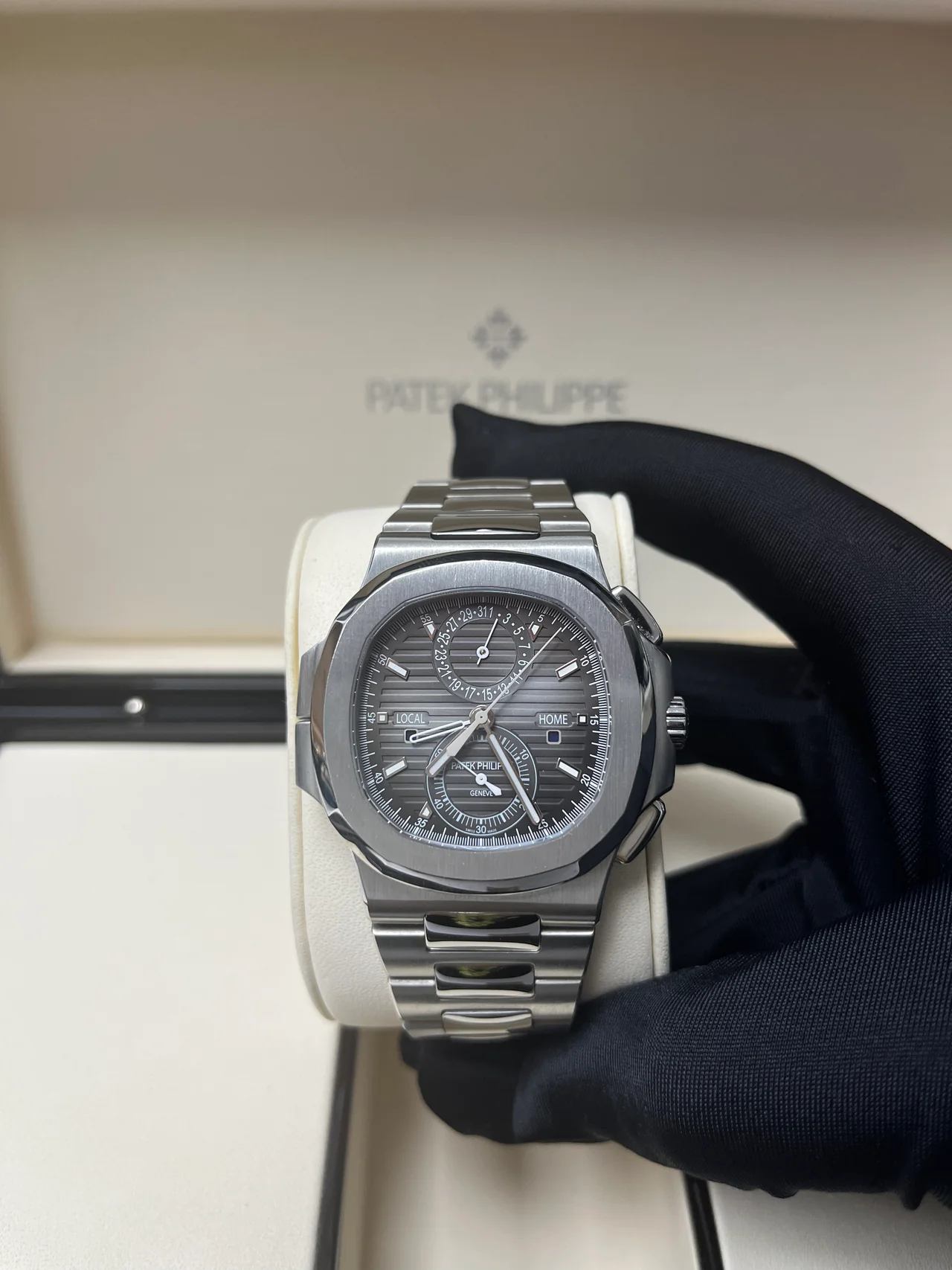 Patek Philippe Nautilus 5990/1A-001. Stainless steel case with a stainless steel bracelet. Fixed bezel. Black graduated dial with luminous hands and index hour markers. Minute markers around the outer rim. Dial Type: Analog. Date. Two - 60 seconds and date. Automatic movement. Scratch resistant sapphire crystal. Screw down crown. Case diameter: 40.5 mm. Cushion case shape. Water resistant at 120 meters / 390 feet. Functions: second-time zone, hour, minute, second.