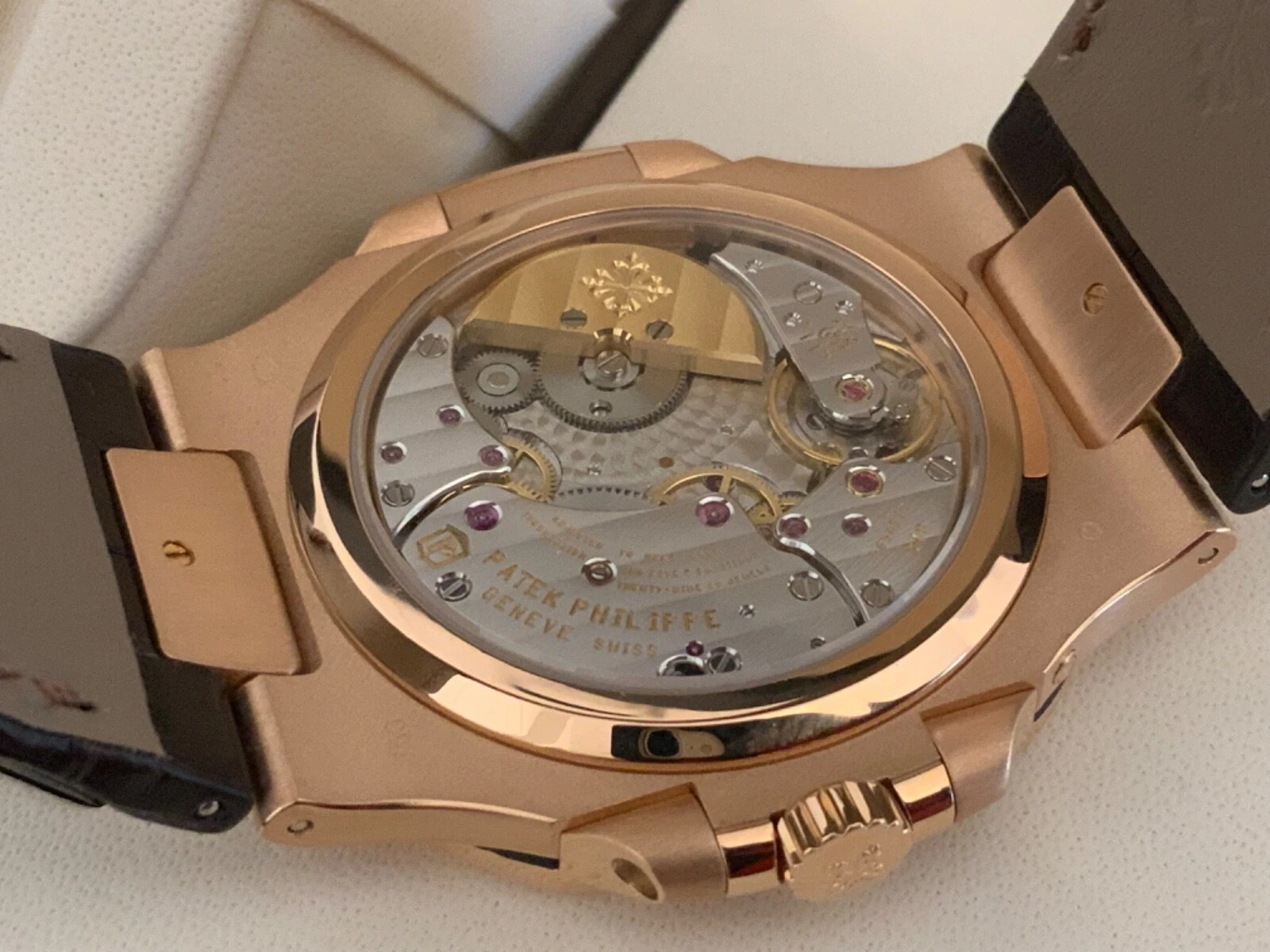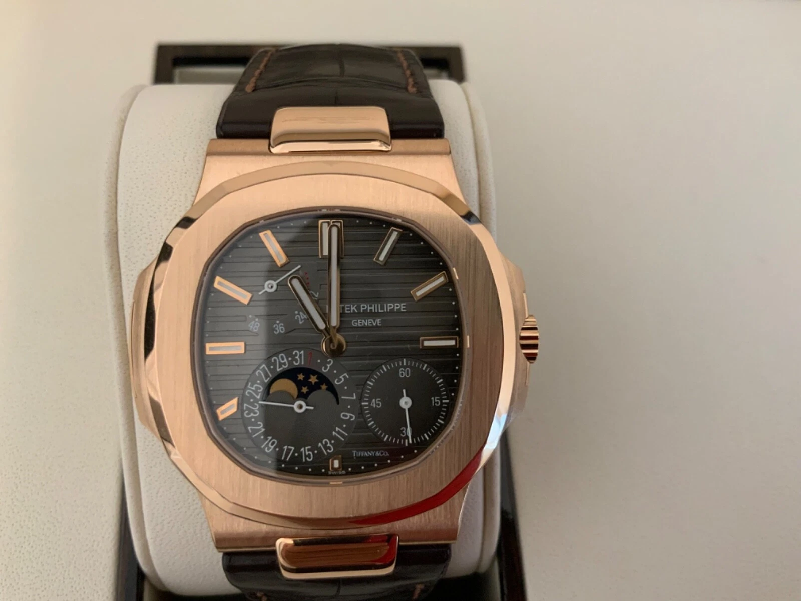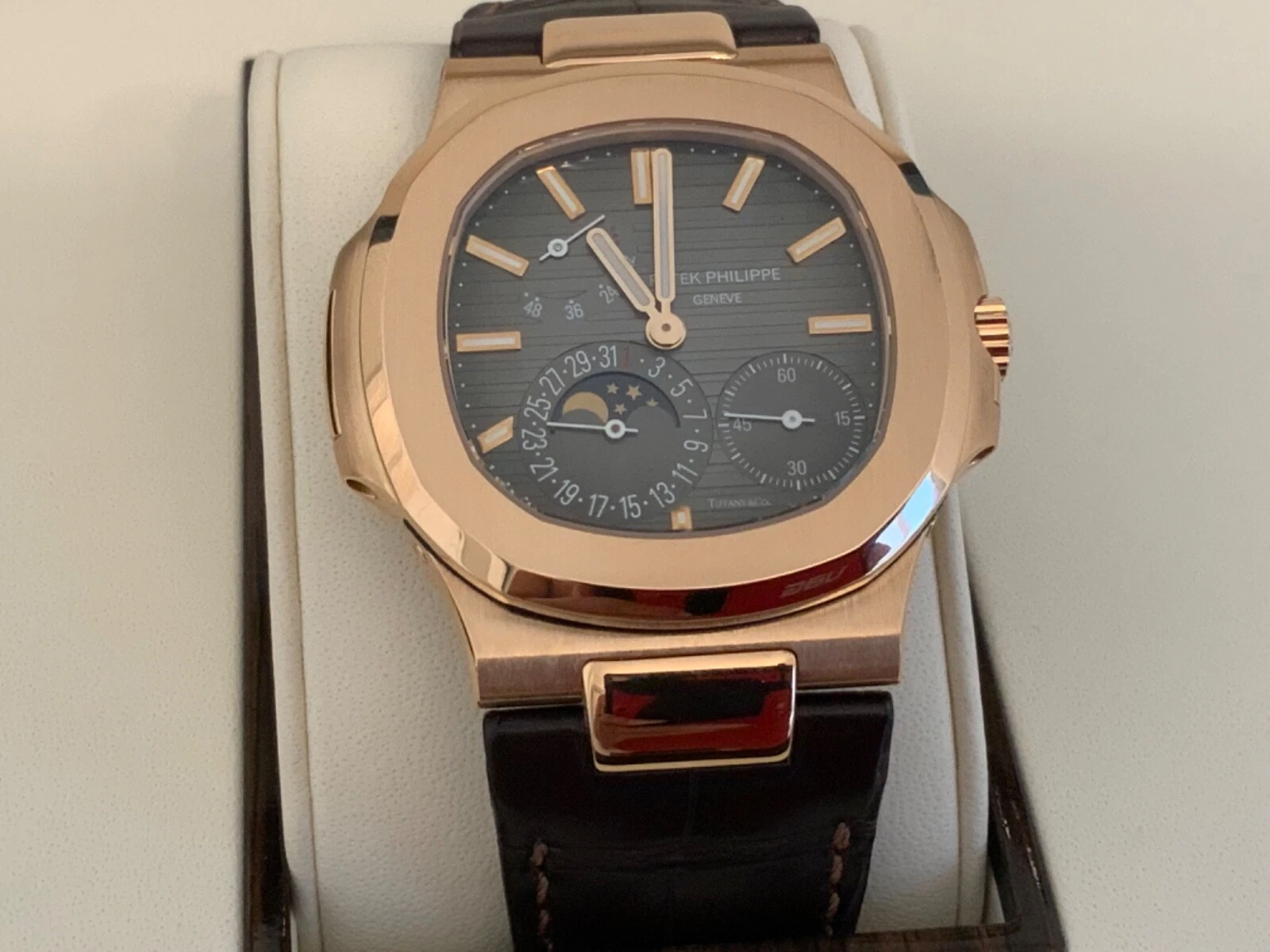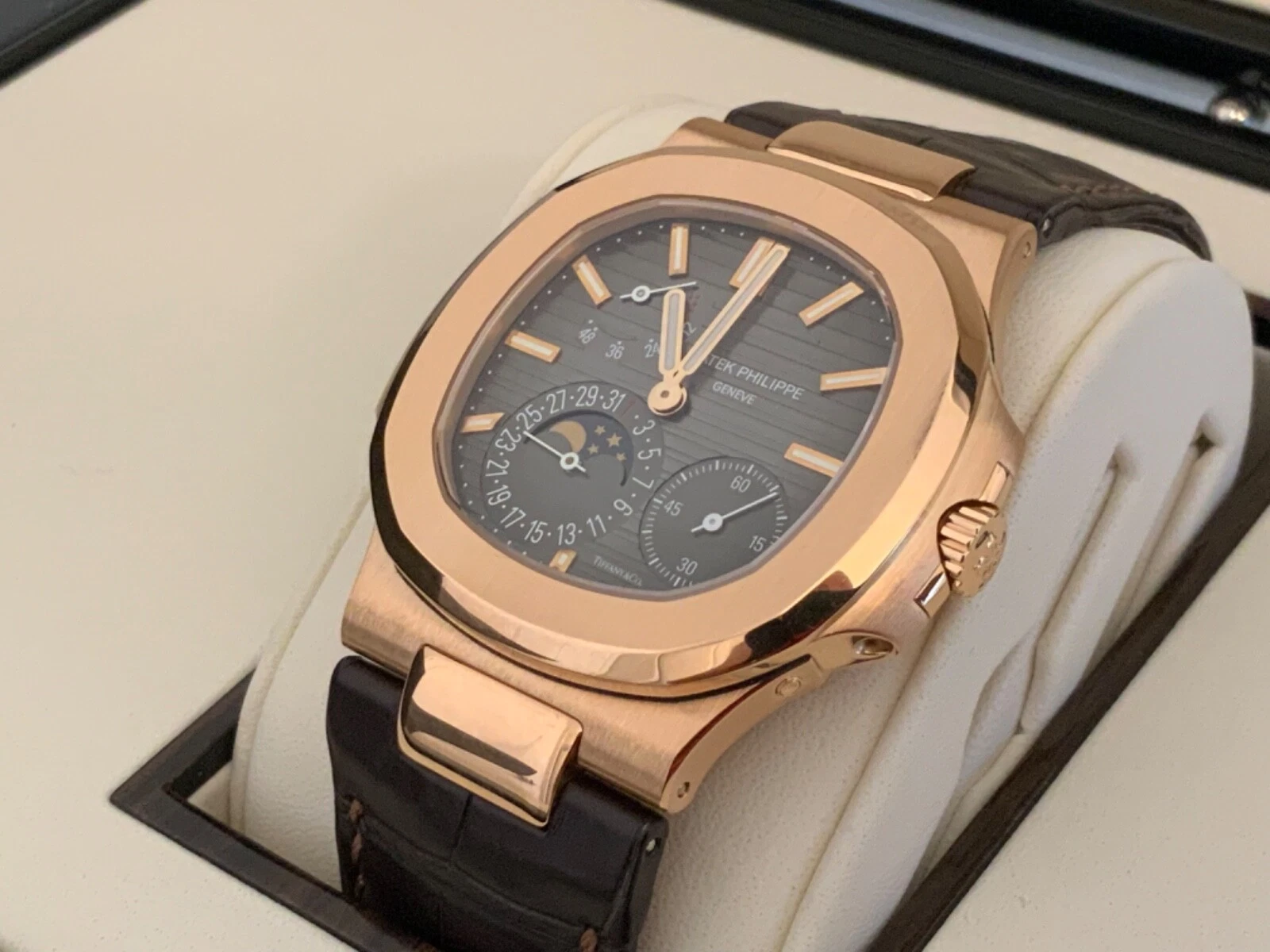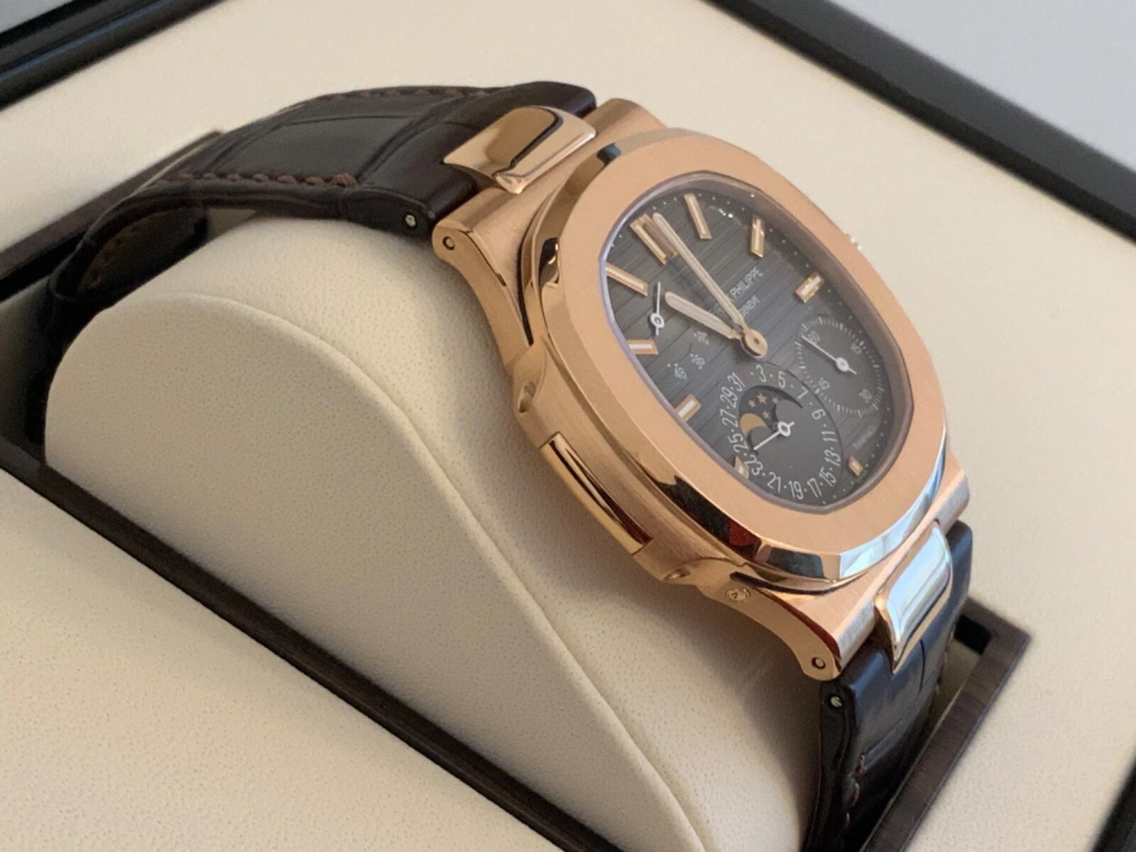 Patek Philippe Nautilus Watches. 40mm 18K rose gold case, sapphire crystal back, screw-down crown, black-brown dial with gold applied hour markers with luminescent coating, self-winding caliber 240 PS IRM C LU movement with power reserve, date by hand, moon phases, seconds subdial, approximately 48 hour of power reserve, leather strap with fold-over buckle. Water resistant to 120 meters.