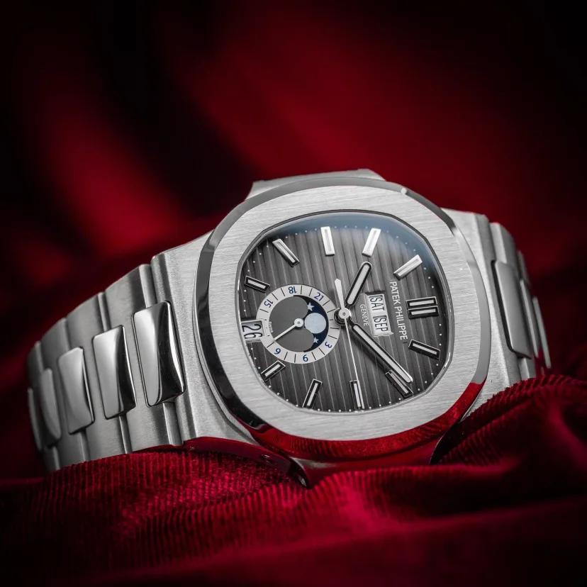 Patek Philippe Watches Nautilus Mens Stainless Steel 5726/1A-001. 40mm stainless steel case, sapphire crystal back, screw-down crown, black dial with gold applied hour markers with luminescent coating, self winding caliber 324 S QA LU 24 H movement with day/date/month annual calendar with moon phase and a.m./p.m. indication, approximately 45 hour of power reserve, stainless steel bracelet Nautilus fold-over clasp. Water resistant to 120 meters.