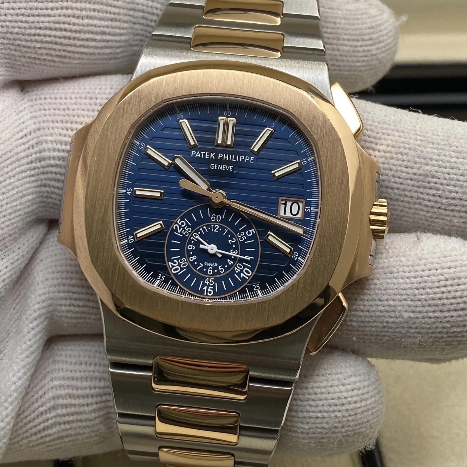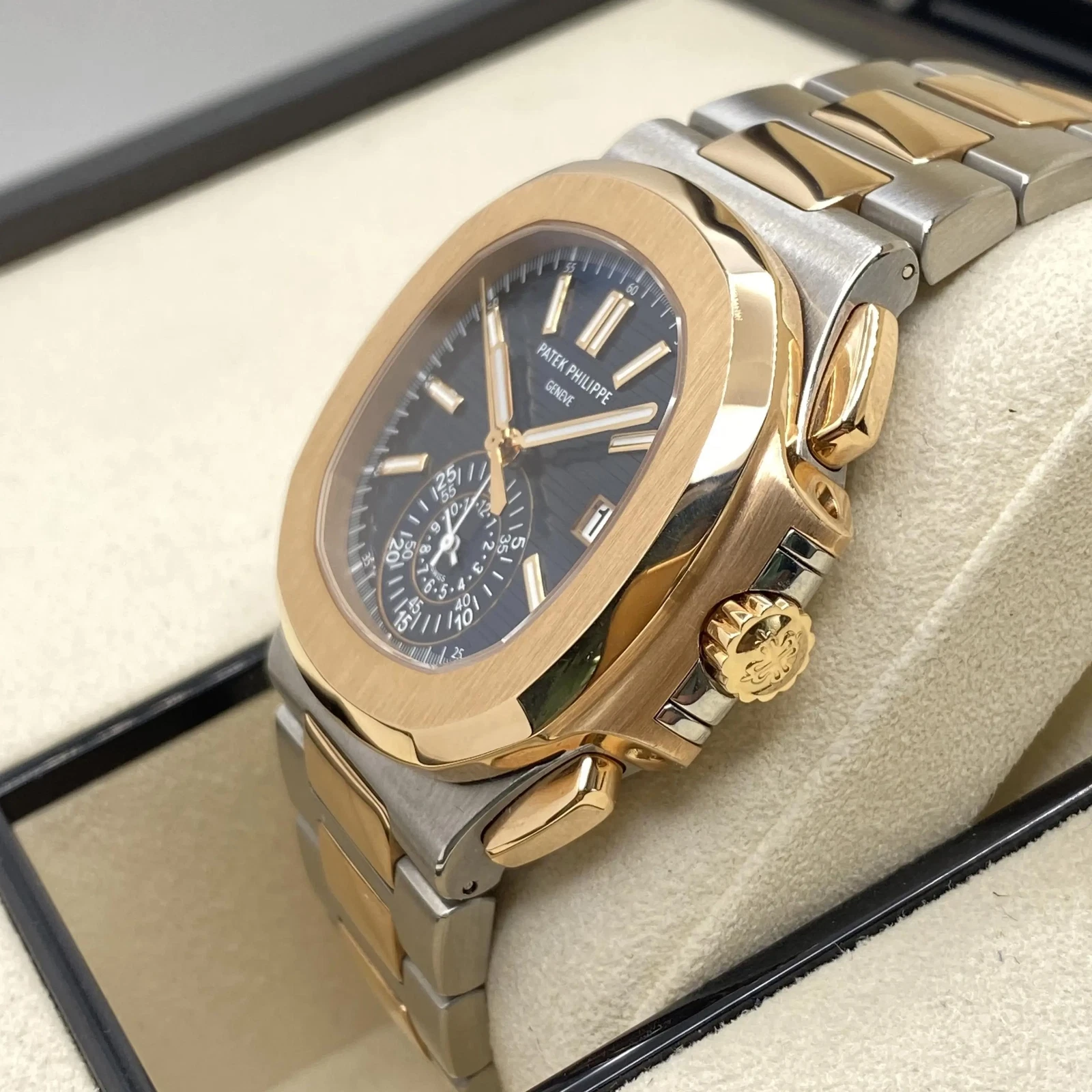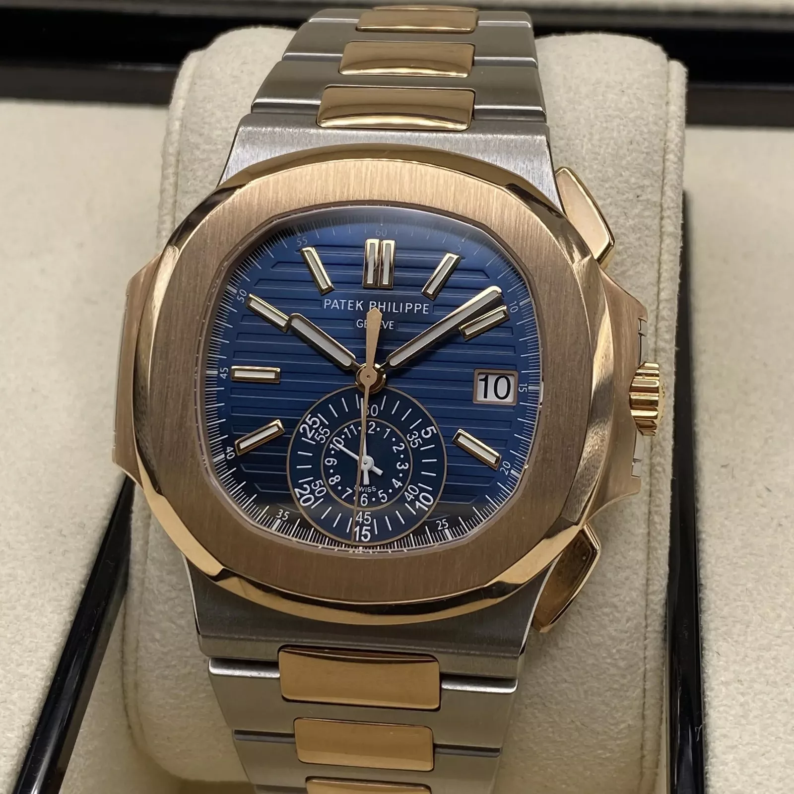 Patek Philippe Men Nautilus Watch. 40.5mm stainless steel and 18K rose gold case, sapphire crystal back, blue gradient dial with gold applied hour markers with luminescent coating, self-winding Caliber CH 28-520 C movement with date, chronograph, 60-minute and 12-hour monocounter at 6 o’clock, sweep seconds hand (chronograph hand), approximately 45-55 hours of power reserve, stainless steel and 18K rose gold bracelet Nautilus fold-over clasp. Water resistant to 120 meters.