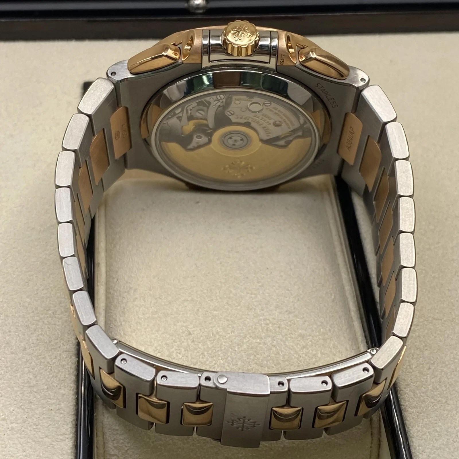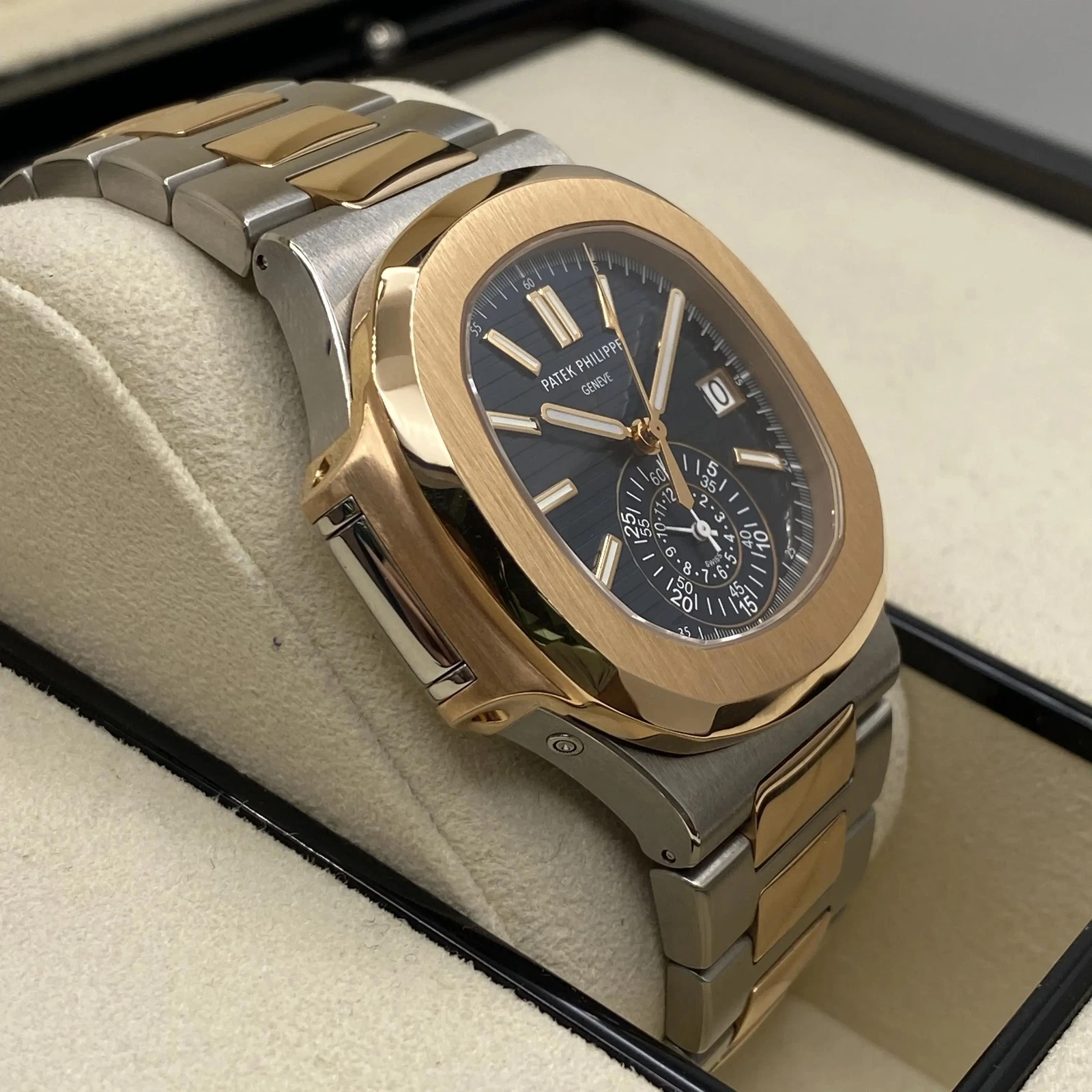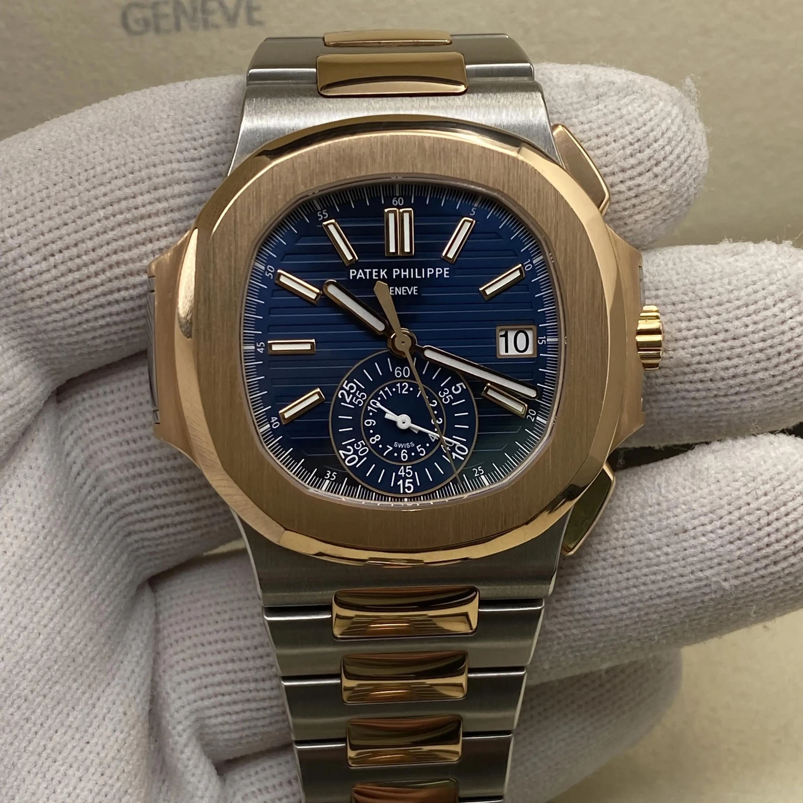 Patek Philippe Men Nautilus Watch. 40.5mm stainless steel and 18K rose gold case, sapphire crystal back, blue gradient dial with gold applied hour markers with luminescent coating, self-winding Caliber CH 28-520 C movement with date, chronograph, 60-minute and 12-hour monocounter at 6 o’clock, sweep seconds hand (chronograph hand), approximately 45-55 hours of power reserve, stainless steel and 18K rose gold bracelet Nautilus fold-over clasp. Water resistant to 120 meters.