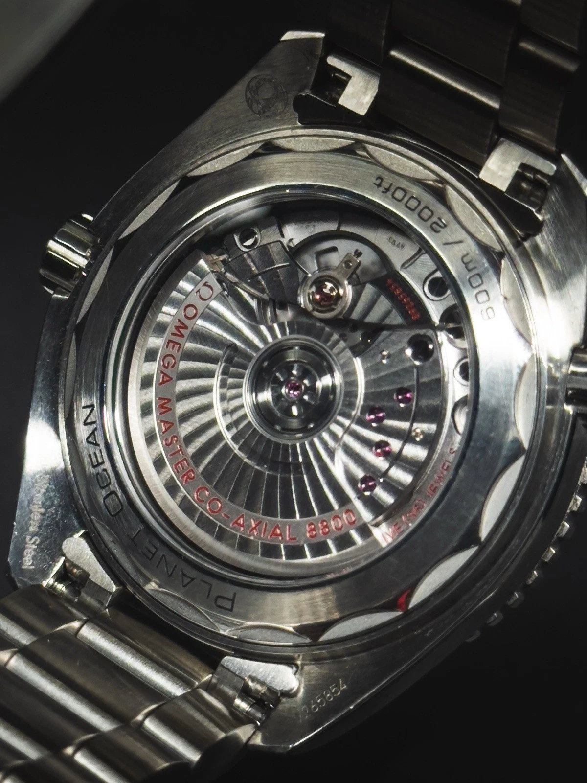The OMEGA Seamaster Planet Ocean 600M Master Chronometer is water resistant to 600 metres / 2000 feet / 60 bar, and has a helium-escape valve. The OMEGA Master Chronometer calibre 8800 at the heart of this timepiece can be seen through the transparent caseback. To achieve Master Chronometer status, it has passed the 8 rigorous tests set by METAS (The Swiss Federal Institute of Metrology).