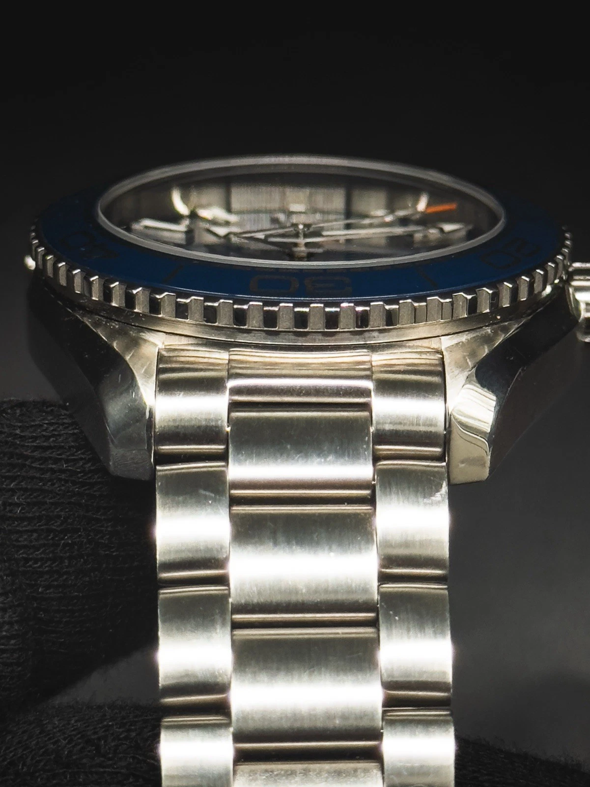 This model, with its scratch-resistant sapphire crystal, features a blue ceramic dial with Arabic numerals and a date window at the 3 o’clock position. The blue ceramic unidirectional bezel with OMEGA Liquidmetal™ diving scale is mounted on a 39.5 mm stainless steel case.