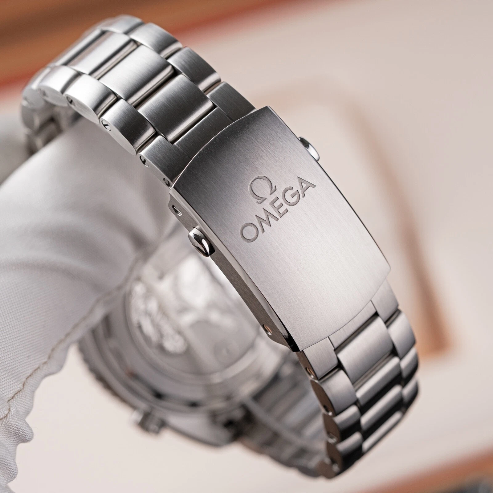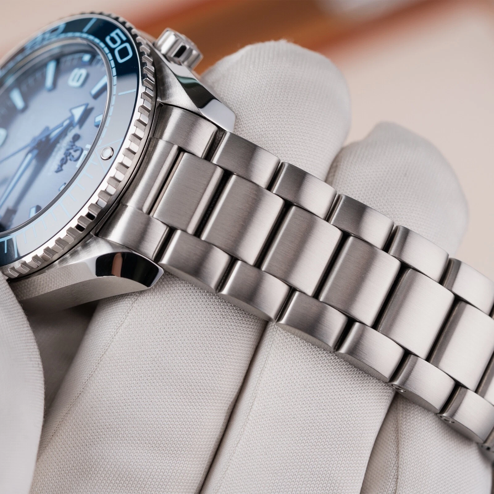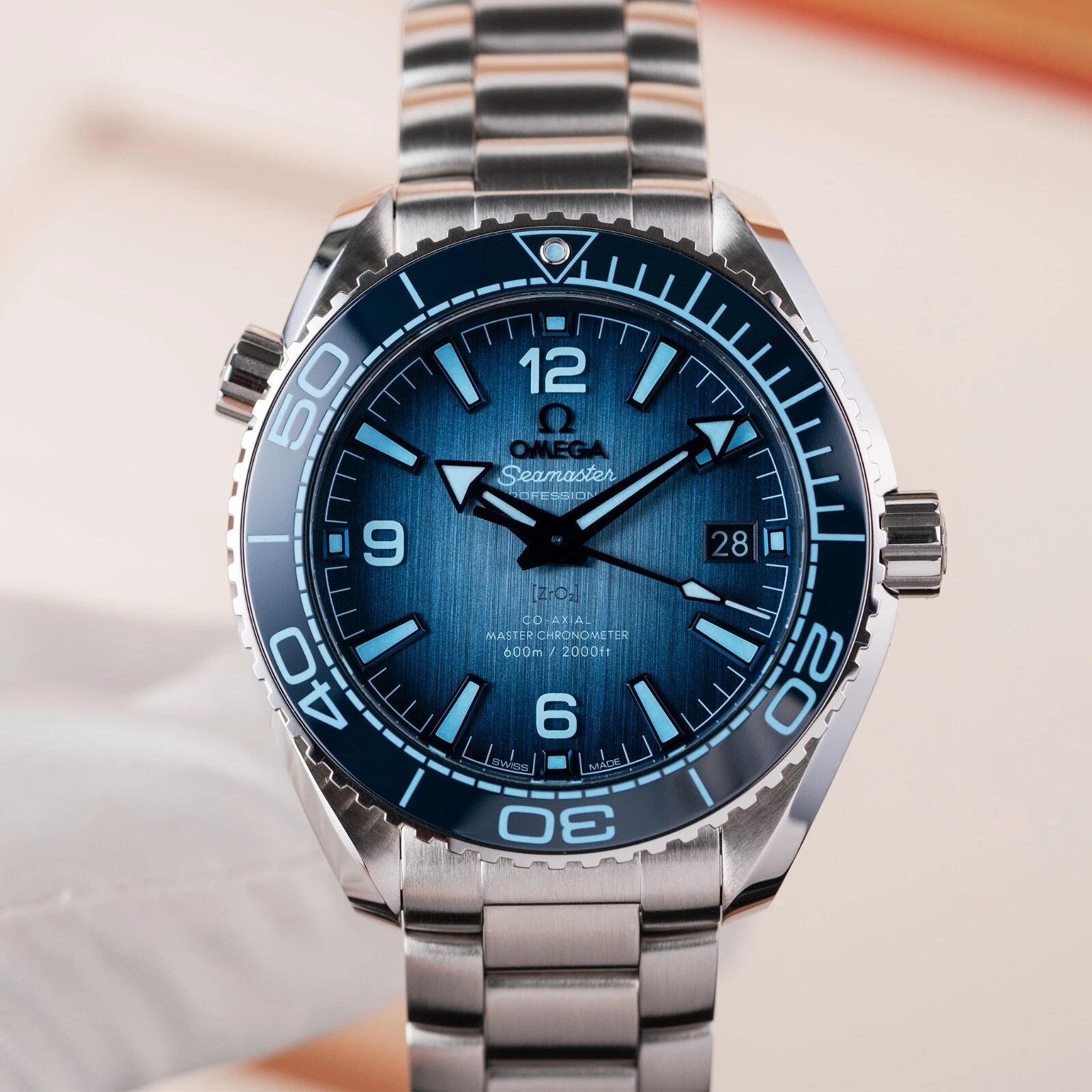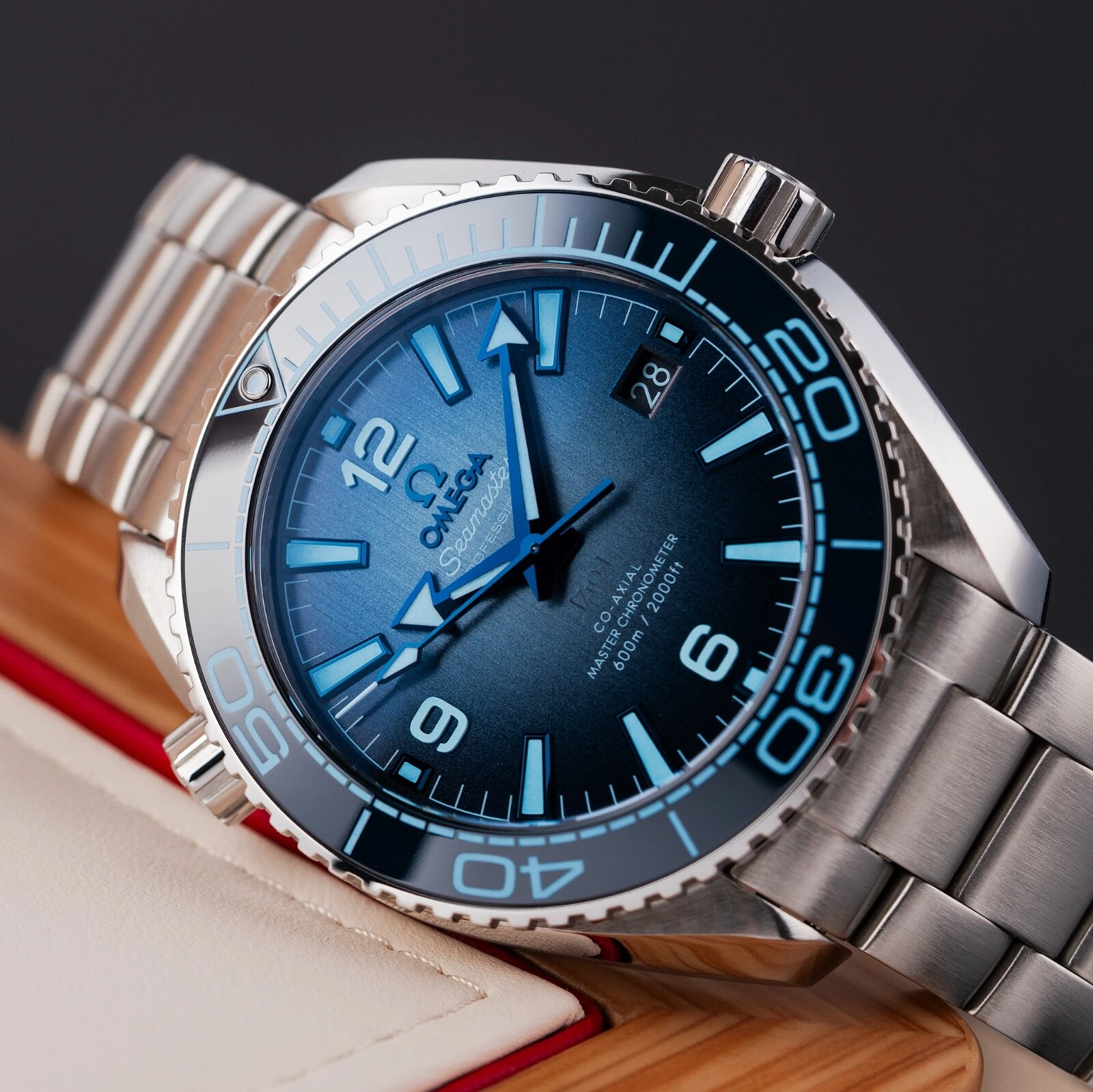 The vertical brushed ceramic dial in OMEGA’s own Summer Blue is PVD treated and varnished with a gradient finish to reflect the watch’s level of water resistance. A blue ceramic bezel with light blue diving scale encircles the bold display, which includes blued hands and indexes filled with a unique light blue Super-LumiNova.