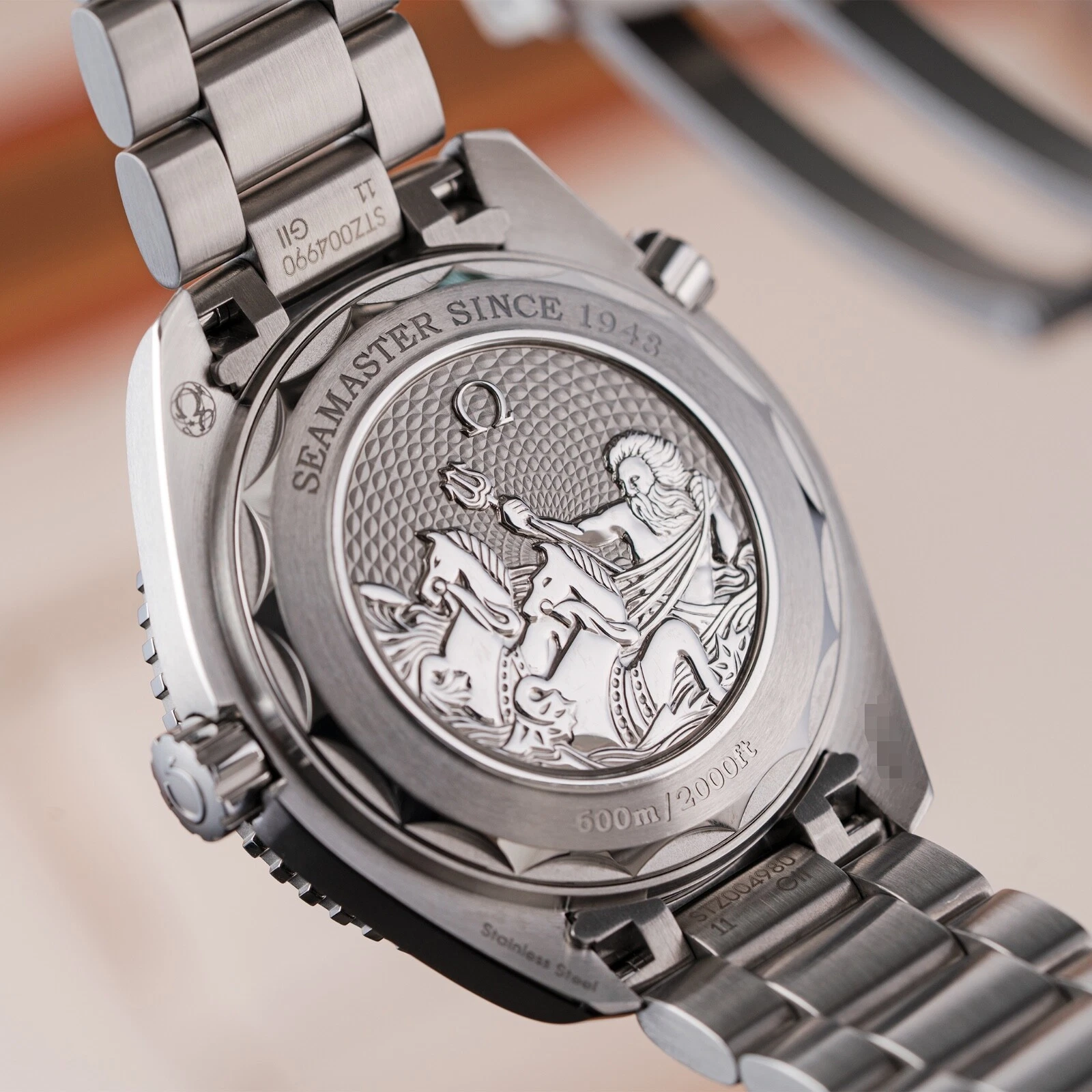 Turning the watch over reveals a stamped commemorative Seamaster logo depicting a trident-bearing Poseidon and two seahorses: OMEGA’s 1956 original and the brand’s current design. Behind which sits the OMEGA Co-Axial Master Chronometer calibre 8800.