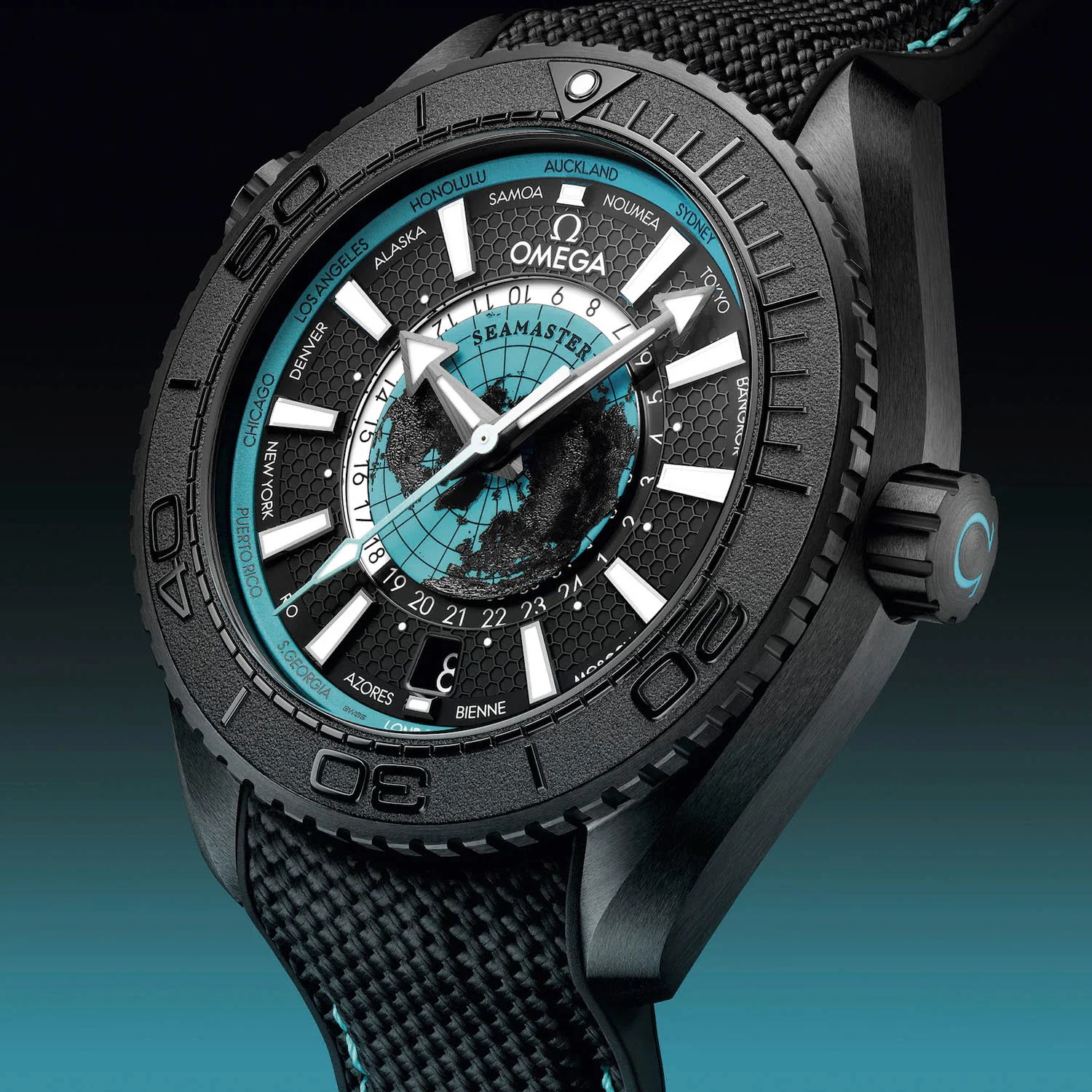 The case and bezel, crafted from brushed black ceramic, feature a laser-ablated diving scale polished in positive relief. At the heart of the dial, OMEGA presents a breathtaking vision of Earth, seen from above the North Pole. This topographic map, meticulously created on a grade 5 titanium surface using laser ablation and turquoise varnish, is surrounded by a 24-hour indicator with a transparent hesalite night-and-day display. The outer section of the dial, in DLC black, showcases a stunning honeycomb pattern, polished and laser-ablated for depth and texture. Diamond-brushed indexes filled with white Super-LumiNova, a turquoise varnish outer ring, and an elegant selection of global destinations—including OMEGA’s home city of Bienne—enhance its distinctive appeal.