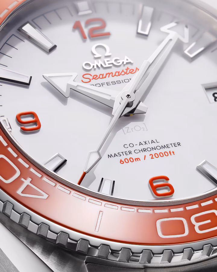 It was with OMEGA’s maritime legacy in mind that the brand launched its Planet Ocean line in 2005. Today, the stylish models continue to pay homage to OMEGA’s dive watch heritage.This 43.50 mm stainless steel model features a white ceramic dial with applied Arabic numerals in orange and a date window at the 3 o’clock position. The orange ceramic unidirectional bezel includes a diving scale filled with liquid ceramic and Super-LumiNova.Other features include an alveol screw-in caseback and an integrated stainless steel bracelet with patented extendable foldover clasp and diver extension.The watch is water resistant to 600 metres / 2000 feet / 60 bar and has a helium-escape valve. The OMEGA Master Chronometer calibre 8900 at the heart of this timepiece can be seen through the transparent caseback. To achieve Master Chronometer status, it has passed the 8 rigorous tests set by METAS (The Swiss Federal Institute of Metrology).