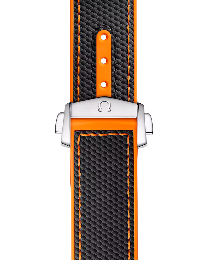Other features include an alveol screw-in caseback and a black structured rubber strap with orange stitching and lining.