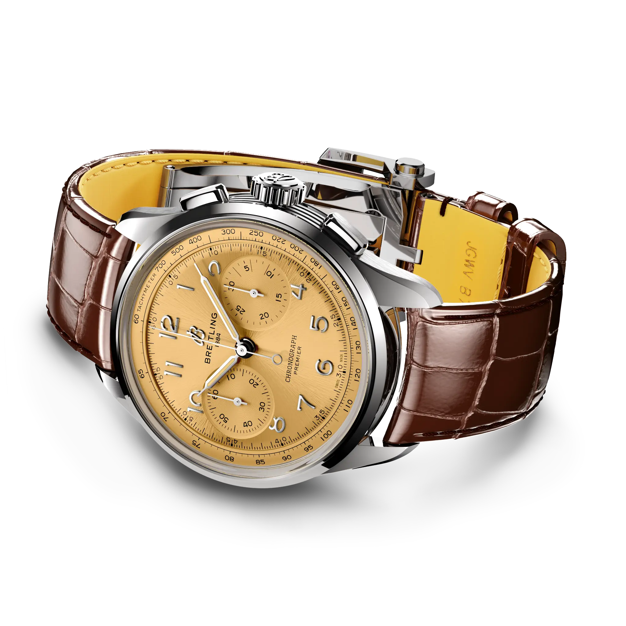 Featuring rectangular chronograph pushers, bi-compax chronograph look and Arabic numerals, the heritage-revived Premier chronographs display a variety of elegant design details such as grooves on the case-sides, an open sapphire caseback and vintage-inspired hands. It is powered by the manually wound COSC-certified Breitling Manufacture Caliber B09.
