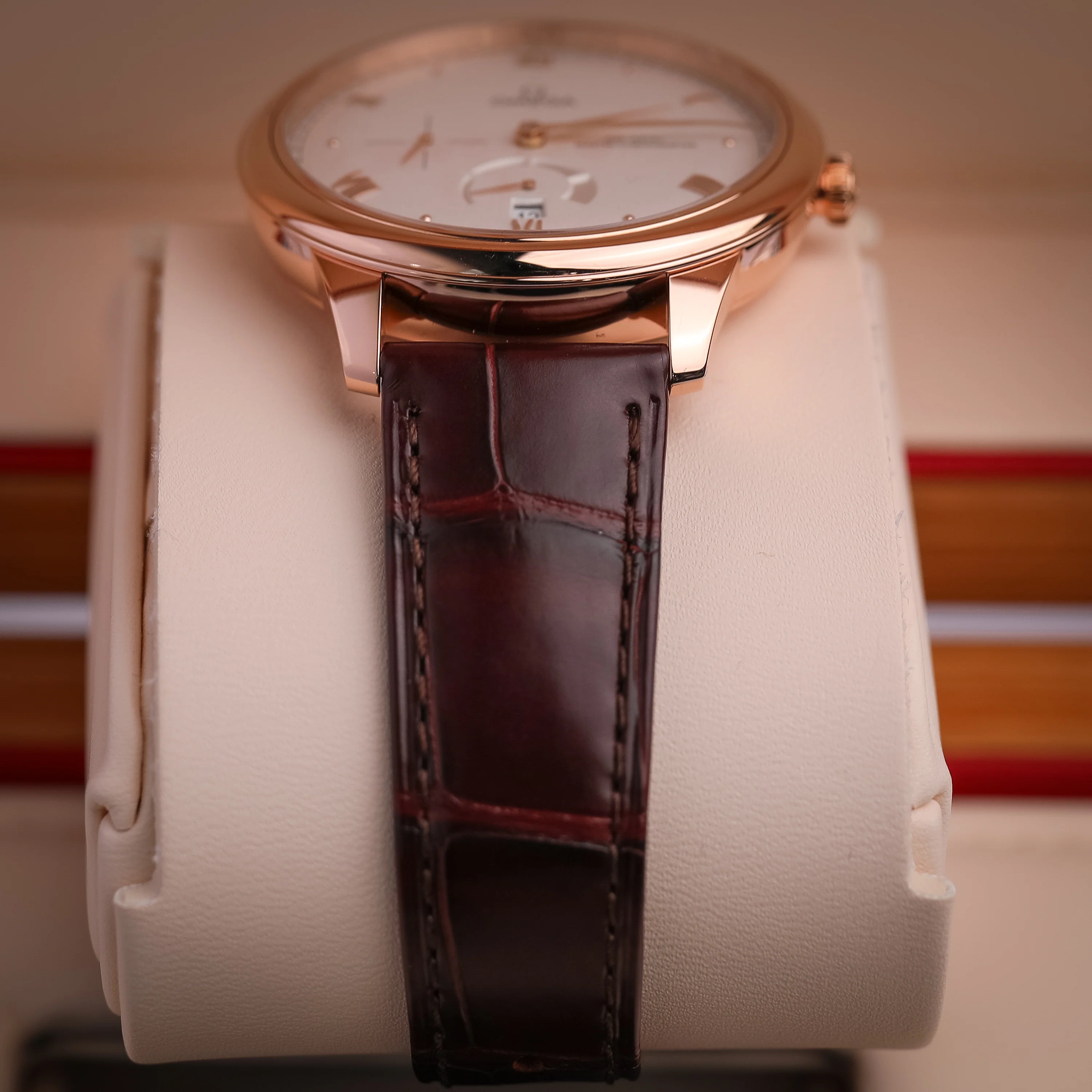 The pure look of the timepiece is completed by a date window at 6 o’clock, a small-seconds subdial at 9 o’clock, and a railway minute track on the outer zone.