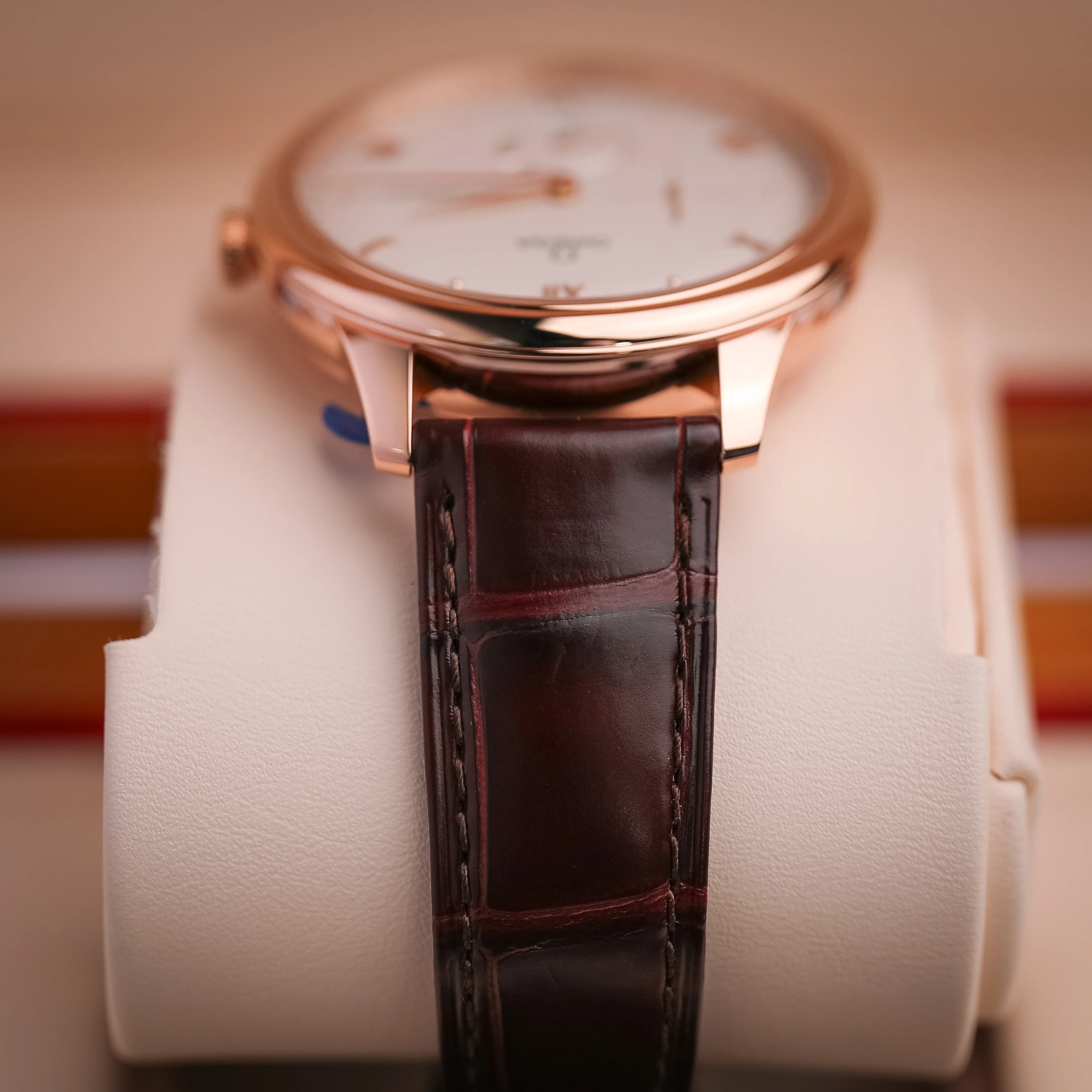 The 270° power reserve indication is located at 6 o’clock. It is illustrated by 4 sectorial cut-throughs in crescent shape and an applied underplate in subtle contrasting finish of the same colour.