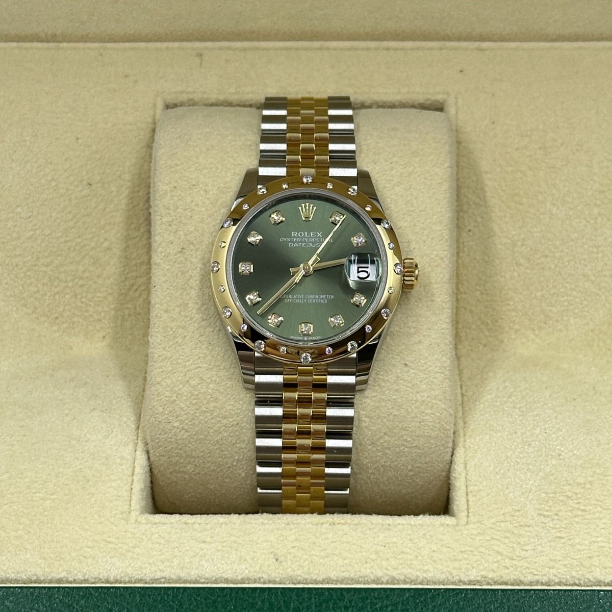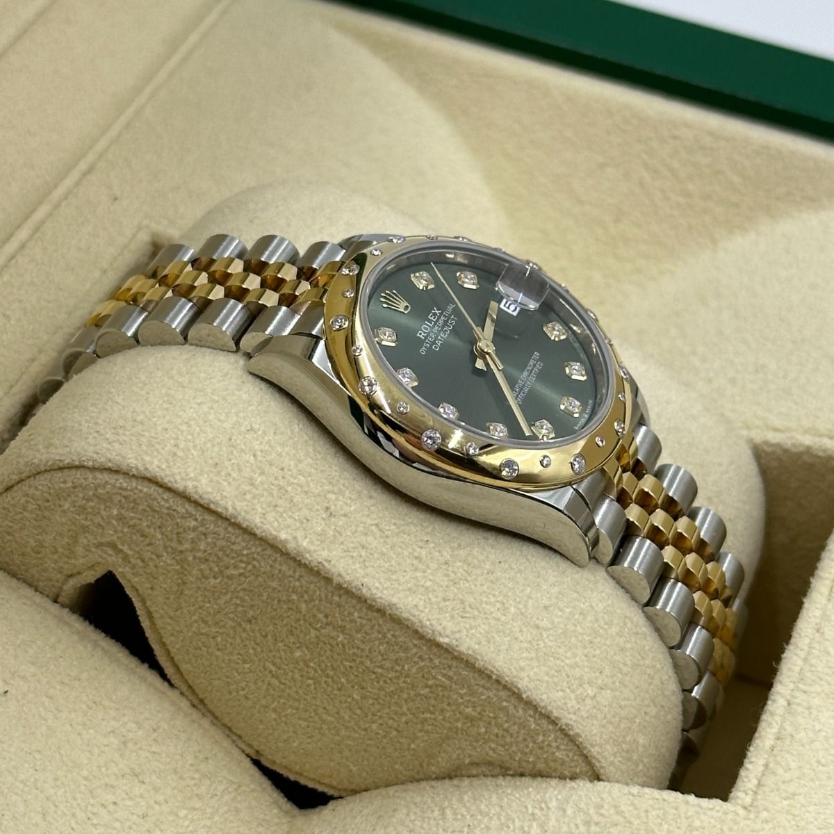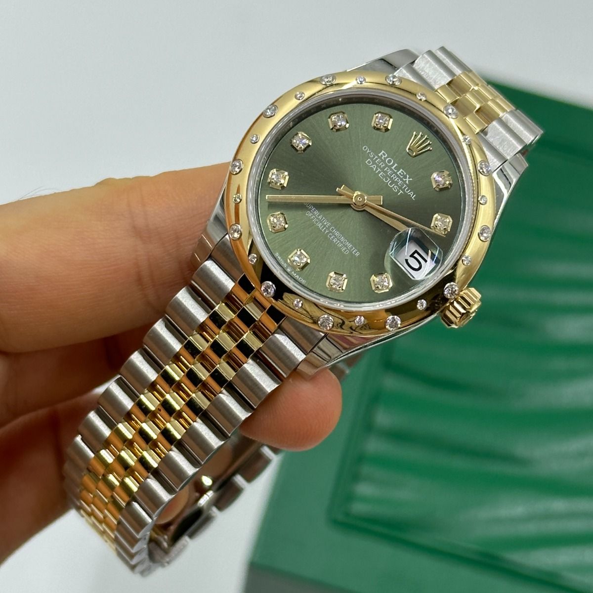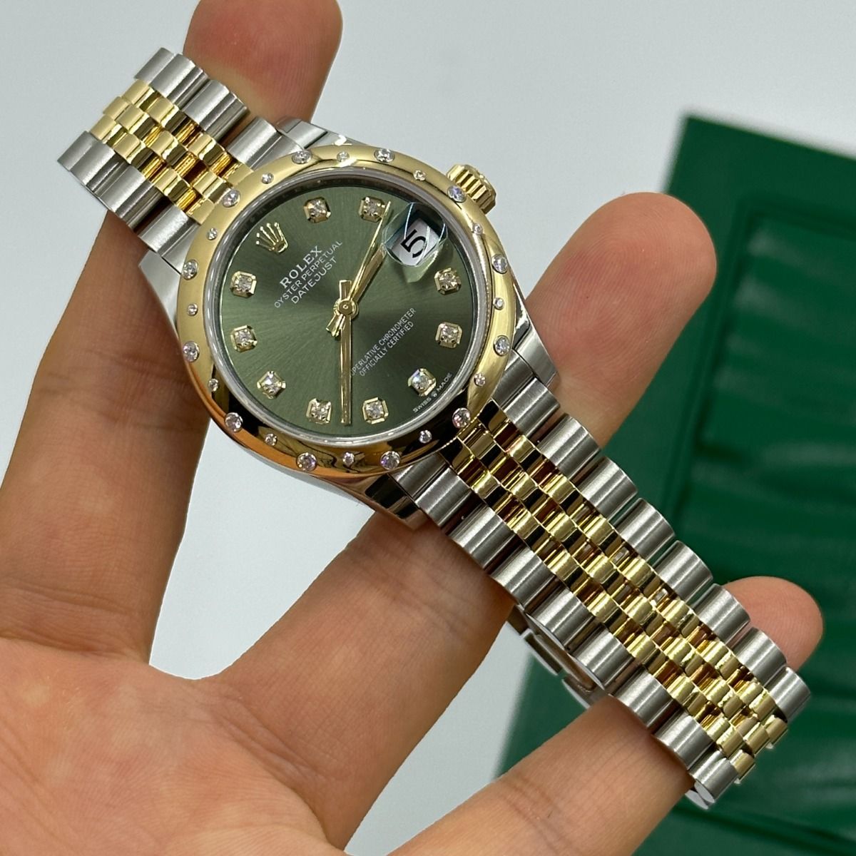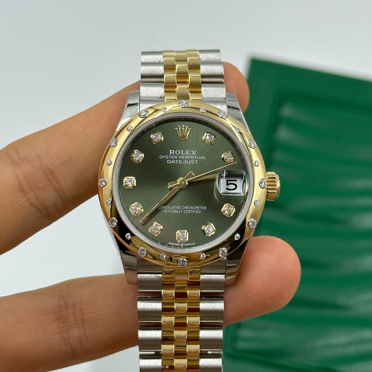 | Dial Color | Olive green set with diamonds |